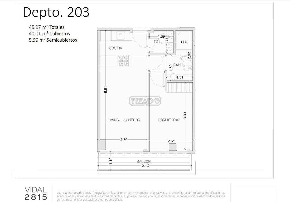 - Balcón: 5,42 x 1,10