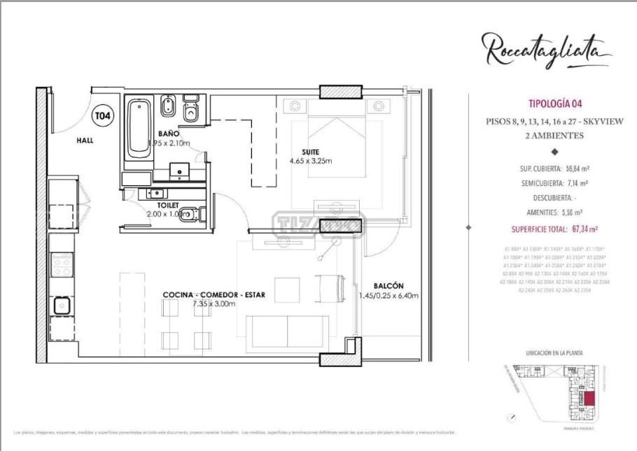 PALACIO ROCCATAGLIATA -- Torre SKY VIEW -- 2 AMB -- Frente a calle ZAPIOLA ***Piso muy alto!!! Cómodo Living comedor con salida a Balcón - Toilette - Cocina integrada - Dormitorio en Suite con salida a Balcón - Baño completo *** AV. BALBÍN esq. F. ROOSEVELT, COGHLAN, C.A.B.A. DOS TORRES: Torre Palace: 12 pisos & Torre Sky View: 27 pisos - de 45 a 203m² COCHERAS Y BAULERAS OPCIONALES PALACIO ROCCATAGLIATA es un complejo compuesto por un bloque de 12 pisos y una torre de 27 pisos y 3 subsuelos, con diversas tipologías de unidades de vivienda. Amenities premium - Cocheras opcionales. Se destaca la imponente presencia de la casona de la familia Roccataglita, que tras ser íntegramente restaurada muestra todo su esplendor. También comprende un área de locales comerciales. sobre la calle Zapiola. Unidades residenciales de 1 a 4 ambientes con dependencia, cocheras y bauleras. Amenities Interiores: Gimnasio, Vestuarios, Cava de vinos, Spa/Sauna seco y húmedo, Sal de reuniones, Cocheras de cortesía, Seguridad privada, Kids club, Laundry, Bicicleteros. Amenities Exteriores: Sky club, Juegos para niños, Gimnasio en terraza, Terrazas accesibles, SUM con expansión, SUM in/out, Solarium, Sector parquizado, Piscina para niños y adultos. 28 pisos - 45.000 m² Locales comerciales sobre Zapiola Bienvenidos a Roccatagliata, un emprendimiento único que redefine el concepto de residencia premium en la ciudad. Ubicado en Roosevelt 3141, en el corazón de Coghlan. Roccatagliata es mucho más que un conjunto de viviendas; es un oasis de lujo y exclusividad diseñado para aquellos que buscan un estilo de vida sofisticado y contemporáneo. Concebido cuidadosamente en cada detalle para ofrecer una experiencia única, fusionando el confort moderno con la elegancia clásica de un Palacio nacido en 1900. Desde la majestuosidad de su arquitectura hasta la calidad de sus terminaciones, Roccatagliata se erige como un símbolo de distinción y buen gusto en un nuevo estándar de vida. Se trata de un conjunto edilicio formado por un bloque de 12 pisos, más una torre de 27 pisos y 3 subsuelos, que aloja diversas tipologías de unidades de vivienda, cocheras, bauleras, locales de servicios generales, amenities, hall de acceso peatonal con jardines perimetrales, área para locales comerciales, terraza con solárium y piscina, unidad de encargado, azotea y salas de máquinas. El conjunto se organiza mediante múltiples núcleos de circulación vertical con palieres que conectan las unidades de vivienda con el lobby de acceso, cocheras y demás áreas comunes. Se respeta la antigua residencia de la Familia Roccatagliata, por estar dentro del patrimonio histórico de la ciudad y se la incorpora a la red urbana por medio de su puesta en valor. CARACTERÍSTICAS GENERALES DEL CONJUNTO Hall de acceso peatonal con marquesina y área ajardinada. Cabina de seguridad - control de acceso. Entrada y salidas vehiculares independientes desde los subsuelos de estacionamientos. Lobby en doble altura con frente vidriado, doble puerta de acceso, pisos de mármol o granito natural y revestimiento de espejo y/o madera y acero inox. Cámara transformadora de compañía prestadora de energía eléctrica (sujeto a aprobación de factibilidad). Acceso para discapacitados en cumplimiento con la ley de “Accesibilidad Física para Todos”. Baterías de ascensores con cabinas revestidas en acero inoxidable y espejo de amplias dimensiones, con botonera digital e indicador de piso en cabina. Puertas automáticas de acero inoxidable en PB y chapa pintada en palieres. Subsuelos / Estacionamientos / Recintos para medidores eléctricos y de gas / Sala de termotanques / Tanques de reserva e incendio / Sala para compactador / Sala para garajista y para ayudante de portería con sanitarios Sector para cava de vinos / Sistema de ventilación mecánica y renovación de aire reglamentario en estacionamiento / Baños en estacionamiento. / Sala para laundry / Bauleras o espacios de guardado / Espacio para grupo electrógeno / Sistema de espiras internas para control de tránsito vehicular entre niveles. / PISO 1° Unidades de vivienda. / Mono ambientes y departamentos de 1, 2 y 3 dormitorios. Vivienda de encargado. PISO 2° y 3° Unidades de viviendas. / Mono ambientes y departamentos de 1, 2 y 3 dormitorios. PISO 4° a 6° Unidades de viviendas. / Mono ambientes y departamentos de 1, 2 y 3 dormitorios. PISO 7° Unidades de viviendas. / departamentos de 1, 2 y 3 dormitorios. PISO 8° Unidades de vivienda de 1, 2 y 3 dormitorios. Gimnasio y terraza accesible parquizada. PISO 9° y 12° Unidades de viviendas 1, 2 y 3 dormitorios. PISO 13° Unidades de viviendas 1, 2 y 3 dormitorios. Solárium con piscina descubierta. PISO 14° a 27° Unidades de viviendas 1, 2 y 3 dormitorios.- AZOTEA Sky club / Sala de maquinas ascensores SE PREVERÁN LAS CANALIZACIONES PARA LOS SIGUIENTES SERVICIOS SIN PROVISIÓN DE EQUIPAMIENTO • Control de accesos y circuito cerrado de CCTV. • Servicio de telefonía interna directa desde cada unidad hacia la casilla de guardia y áreas comunes. • Sistema de detección de incendio en lugares a definir. (palieres, salas de máquinas y subsuelos) INSTALACIONES TERMICAS Y ELECTRICAS. Instalación Termomecánica y de calefacción Canalización, instalación de cañerías refrigerantes y acometidas eléctricas para la instalación de equipos de aire acondicionado frío-calor sistema de tipo Split o Multisplit, marca Daikin, Electra, LG, BGH o similar, con provisión e instalación de equipos (sujeto a disponibilidad al momento de la contratación). Extracción mecánica de sanitarios con conductos de chapa. Ventilación mecánicamente las Salas de Tableros, Salas de Bombas, Depósitos, Salas de Máquinas de Ascensores y demás locales de Servicio de los Subsuelos. Las cocheras contarán con la ventilación mecánica reglamentaria. Instalación Eléctrica Cañería y cables reglamentarios, doble circuito eléctrico por unidad sepa