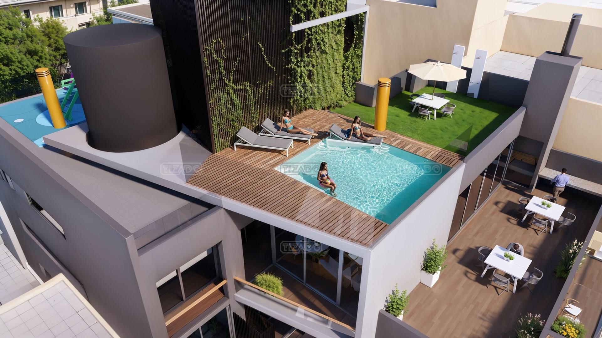 Es un edificio doble frente en construcción que proyecta viviendas y amenities pensados para compartir con amigos y familiares en entornos agradables y relajados. Está pensado con criterio sustentable, terraza verde, sistema de recuperación de agua para riego, colectores solares. Cocheras cubiertas y descubiertas opcionales. Piscina, solarium, SUM con parrilla, coworking y juegos infantiles en los últimos pisos. El proyecto está conformado por planta baja con acceso, cocheras y 9 pisos con departamentos de 1,2 y 3 ambientes. En el 9º piso y en la terraza se encuentran los amenities. Además cuenta con subsuelo destinado a cocheras y guardabicicletas. Las unidades contarán con cocinas integradas o independientes, toilettes, vestidores o placares con interiores segun corresponda. Los balcones continuos con barandas de vidrio. Las fachadas poseen amplios ventanales de piso a techo. Los departamentos tendrán pisos de porcelanatto, amplios ventanales con doble vidriado hermético (DVH), pre-instalación para sistema individual de Aire Acondicionado Frío/Calor tipo Split y agua caliente de generación individual por termotanques eléctricos de alta recuperación. En relación a las cocinas se proyecta mesada en granito o material disponible de similar calidad, cocina eléctrica de primera marca, muebles bajo mesada y alacenas y griferías monocomando marca FV o similar. Los baños y toilettes tendrán pisos y revestimientos cerámicos, mesada en granito o placa de similar calidad, artefactos marca Ferrum o Roca y griferías marca FV. Con respecto a los amenities se proyecta en el noveno piso SUM y Coworking divisible con expansión de solarium y parrilla. La terraza contará con amplio espacio verde, pileta, solarium y sector diferenciado de juegos infantiles.