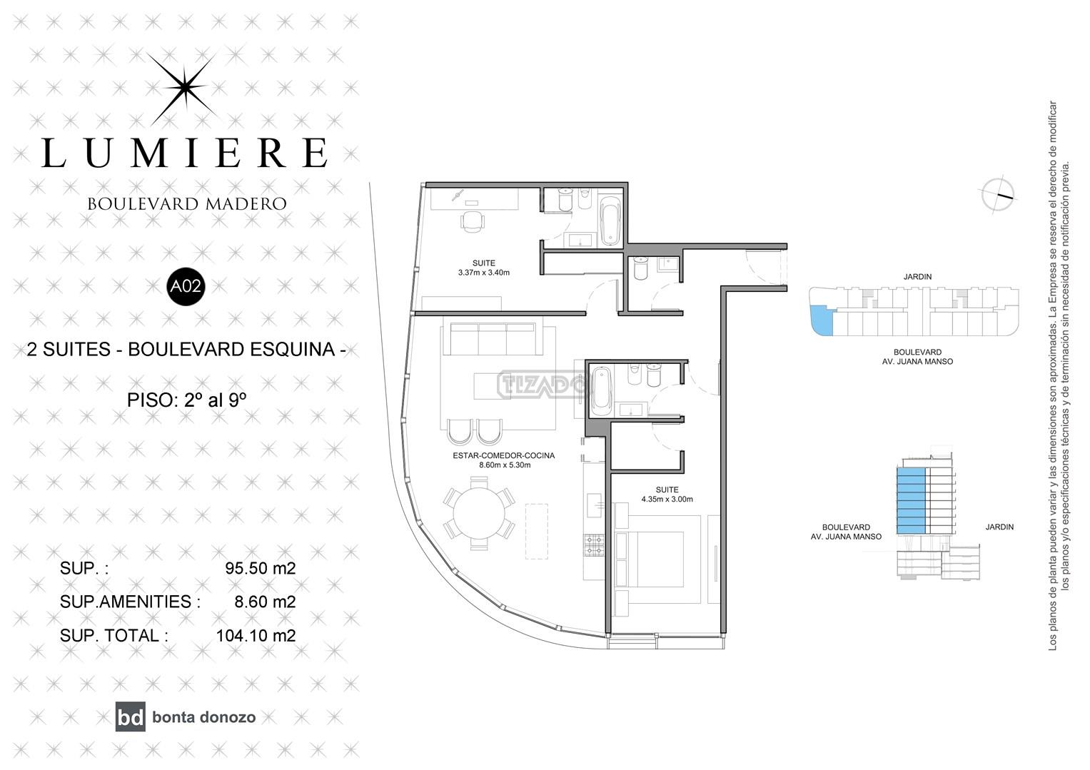 Lumiere Boulevard Madero. Excelente departamento en esquina de 2 dormitorios en Suite más toilette. Al ser la esquina de Juana Manso y Ezcurra, cuenta con una vista abierta extraordinaria, se ve la plaza Micaela Bastidas y tiene la mejor orientación hacia el Este, disfrutando de todo el sol de la mañana. La unidad tiene 95m 2 cubiertos, cuenta con cochera en el 2º SS, el living comedor es curvo, todo vidriado. Impulsados por el puerto, el agua y la reserva ecológica, se pensó una arquitectura que respete el entorno y que potencie el bienestar. Se destacan las vistas, amplitud de espacios y la pureza del ambiente. Líneas modernas que realzan la naturaleza para disfrutar al máximo de esta ubicación privilegiada. Full Amenities: Gym. Solarium. SUM. Seguridad 24hs. Piscina / Rooftop. área recreativa. área de relax. Lounge. EL CONJUNTO • El conjunto cuenta con un grupo electrógeno que alimentara parte de las instalaciones del mismo para asegurar la provisión de agua, el funcionamiento de ascensores y un circuito de iluminación de emergencia en áreas comunes. • La piscina de 15 mts aprox con sistema de filtrado automático. • El laundry se ha pensado para que pueda funcionar concesionado, otorgando un mejor servicio al conjunto sin costos de mantenimiento para el mismo. LA OBRA CIVIL El edificio tiene una estructura de hormigón armado que conforman los tabiques exteriores del edificio. Los tabiques interiores son de mampostería de ladrillos cerámico, terminados con enlucido de yeso, los cielorrasos de yeso. LAS INSTALACIONES • El agua caliente de cada unidad es por un sistema central. El anafe y horno son eléctricos. • La instalación eléctrica cuenta con un tablero completo con disyuntor diferencias del seguridad. • Hay bocas de teléfono en los ambientes principales. La instalación de TV se ha diseñado de manera de permitir la instalación de un sistema por cable a través de bocas en los ambientes principales. • La unidad esta preparada para la instalación de portero visor. LAS TERMINACIONES • Los baños cuentan con mesadas de mármol y revestimientos de cerámica esmaltada y espejo de pared a pared sobre los lavatorios, la cocina tiene mesadas de granito con bacha de acero inoxidable, griferia monocomando. • La unidad no cuenta con Interior de placard y vestidor, Los Pisos de comedor, dormitorios y circulaciones (se entrega una carpeta preparada para recibir alfombra, piso flotante de madera o pisos tipo cerámico de 1 cm de espesor) LAS CARPINTERIAS • Las carpinterías Exteriores es de aluminio con doble vidrio. • Las puertas interiores con marco metálico de aluminio doblada BWG 18 y hojas placas para pintar. • Las cocinas de las unidades se entregara con muebles bajo mesada y alacena. • El frente de placard del segundo dormitorio tiene espejados del tipo corredizo o con marco de chapa, El vestidor ttiene como cerramiento una puerta placa para pintar de embutir.
