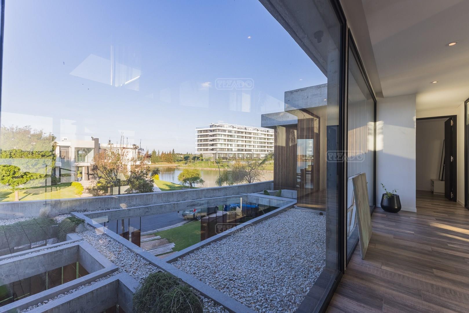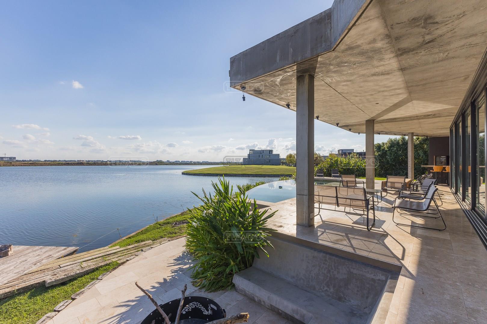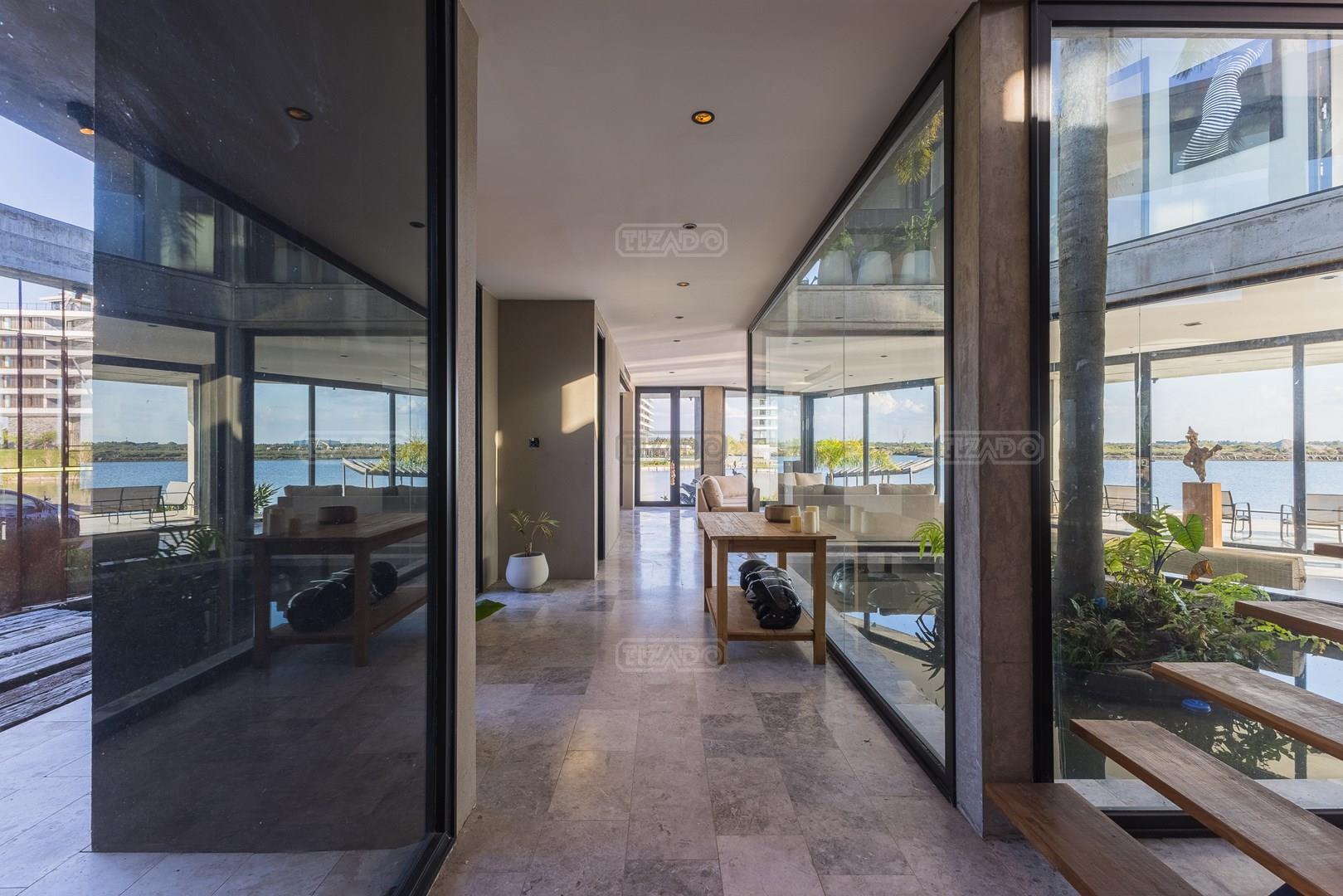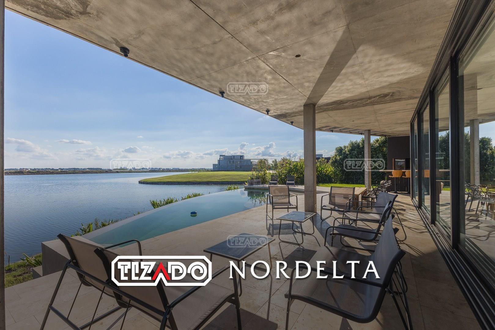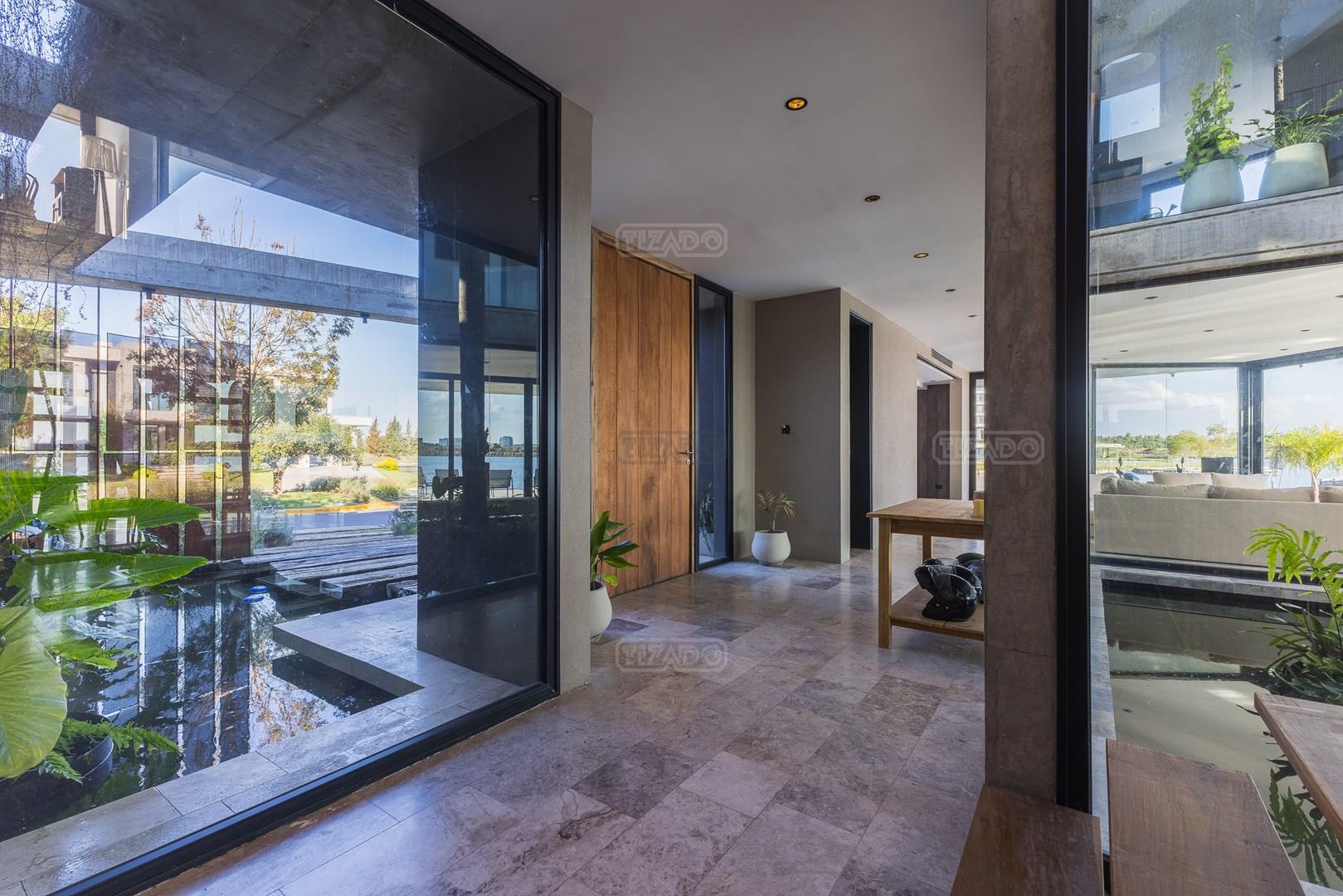 Es una casa de diseño exclusivo moderna, es como si flotara, rodeada por fuentes de agua y canteros verdes, implantada en un lote en esquina con 34 metros de costa sobre el lago central de Nordelta con increíble espejo de agua de 400 mtrs. . Con una calidad constructiva excelente en hormigón visto y madera de lapacho, donde desde cada uno de sus ambientes se ve el agua. El Living Comedor con amplísimos ventanales en esquina al estar construido sobre terreno elevado y aterrazado genera la sensación de estar en un barco con una visión panorámica del lago central. y puesta de sol. En el interior impacta un luminoso estanque verde central a cielo abierto. Ubicada al final de calle en cul de sac. PB: al ingreso te da una cálida bienvenida una fuente de agua vertical inclinada de pierda con un manantial oxigenando en forma natural el agua de los dos estanques externos con canteros verdes sus dos palmeras de 50 años, hall de recepción, amplio placard de visitas y cava para 150 vinos tras un muro de madera ranurada, patio interno vidriado a cielo abierto con cantero con palmera. Amplio home theatre separado por muro corredizo de tarquini. Living rodeado de ventanales piso a techo con imponente vista al lago central y salida a la galería y a amplia cochera sobre el lago con techo de hormigón visto y espacio para motos y bicicletas. Comedor con salida a la galería y vista al lago. Cocina en esquina con vista al lago con isla con mesada de marmol, anafe y 3 hornos empotrados: horno a gas con alzada en pared de acero inoxidable con extractor, microhondas y horno electrico. La cocina es semi integrada separada por puerta corrediza de madera embutidas y salida a la parrilla de leña con sistema de elevación electrica con brasero con puerta de vidrio templado y chapa doble de hierro y parrilla a gas. Despensa. Toilet con piso de porcelanato tundra. lavadero on mesada de granito negro, con entrada independiente. dependencia en suite con baño con ducha con entrada independiente. Amplia cochera sobre el lago con techo de hormigón visto y espacio para motos y bicicletas. Estacionamiento para 6 autos. PA: escalera flotante de madera de lapacho con baranda de hierro y vidrio. Estar con salida a la terraza con vista al lago. Suite principal hall con doble puerta, con gran ventanal con salida a terraza con vista al lago, baño completo en travertino italiano con doble bacha y doble ducha con jacuzzy con vista al lago y al stanque interno. amplio vestidor Segundo cuarto en suite con baño con ducha con ventadna con salida a la terraza con vista al lago. Tercer cuarto en suite con baño con doble bacha y ducha con salida a terraza con vista al frente. Cuarta suite con baño con ducha y ventana con salida a la terraza lateral y vista al lago. SEGUNDO PISO: gran altillo o 5to dormitorio con rincon para kitchenette, con ventanal a galería rodeado de luz, verde y agua con vista al lago central y al estanque interno. Baño completo con porcelanato mate con ducha. Todos los ventanales son de doble vidrio laminado con doble seguridad de 12 mm. Piso de piedra natunal Tundra pulido mate importada de Turquía. puertas de doble espesor super aislantes. Amplio muelle elevado con pergola diseño 3D en lapacho con iluminación. Pileta de 12 metros con borde infinity revestida de marmol travertino y piso de galería de marmol travertino. Doble solarium seco y húmedo con yacuzzi integrado. Centro de fuego separado con bancon de hormigón visto y fogón de hierro. Carpinterías PVC negras. Aire central dos equipos York. Calefacción por piso radiante a gas, electrico o por aire con dos equipos York. Muy buena iluminación de exterior en fachada, jardines y muelle. Central de domótica. Riego por asperción dividido en 5 circuitos. Cerco electrico.