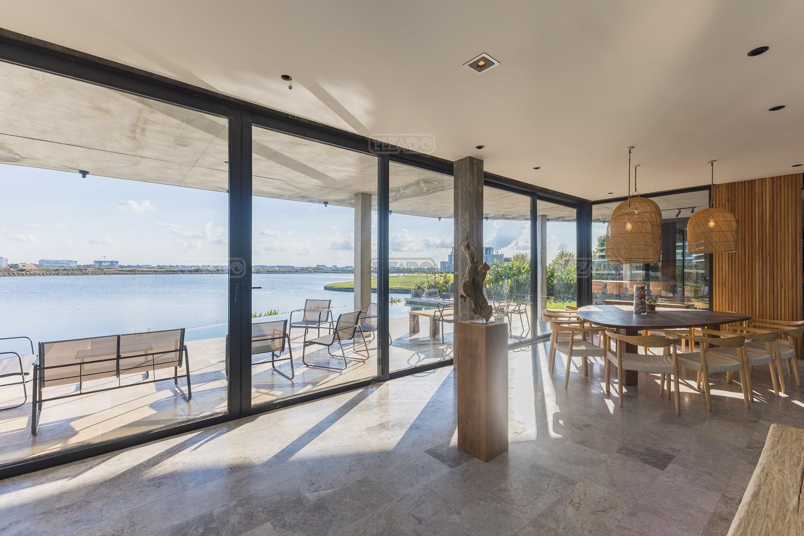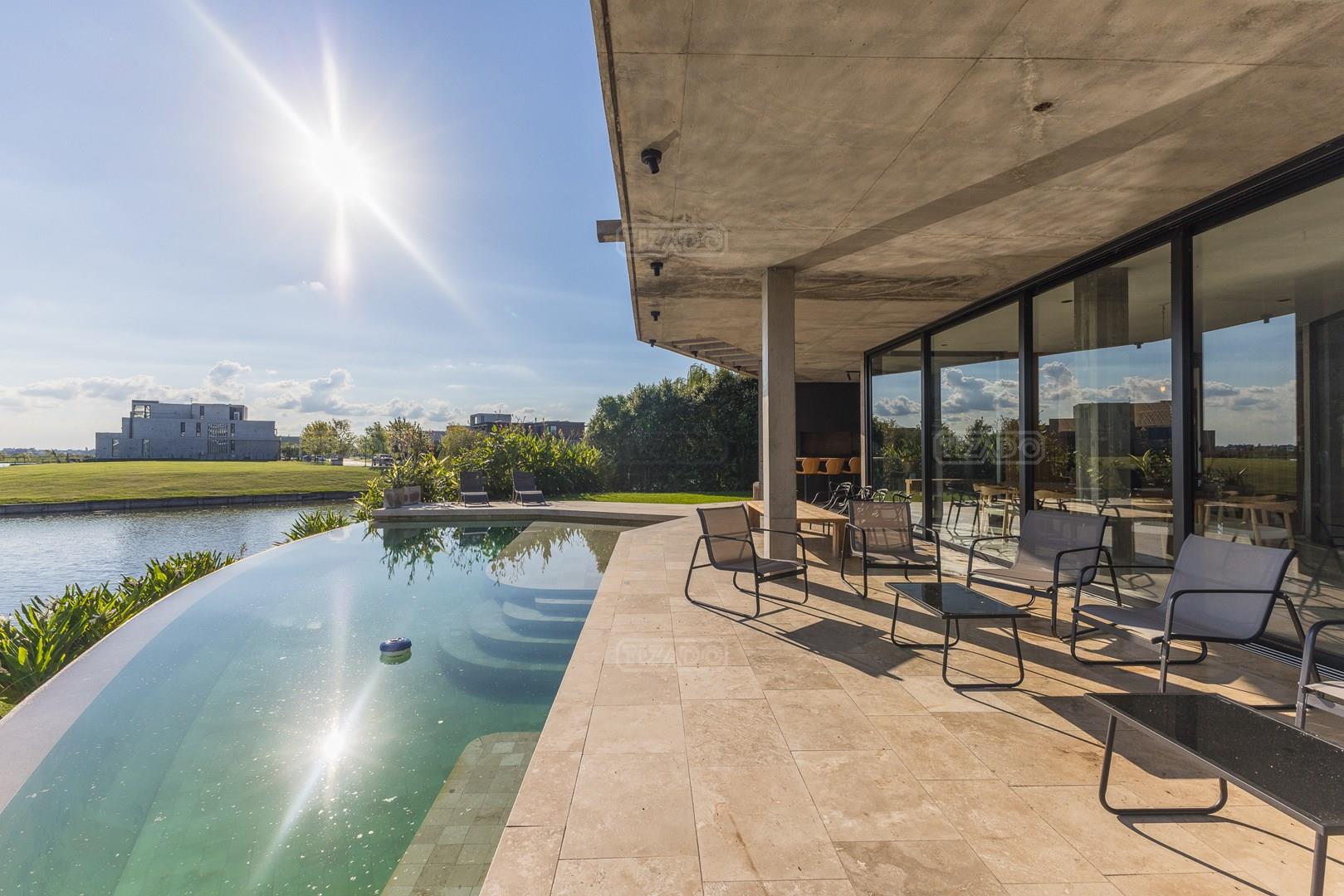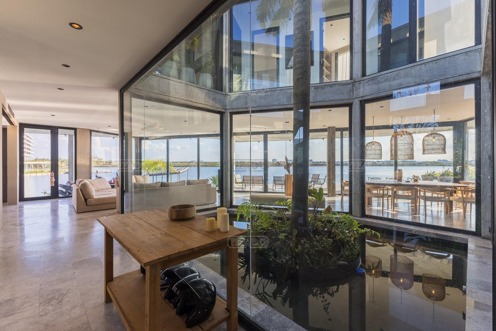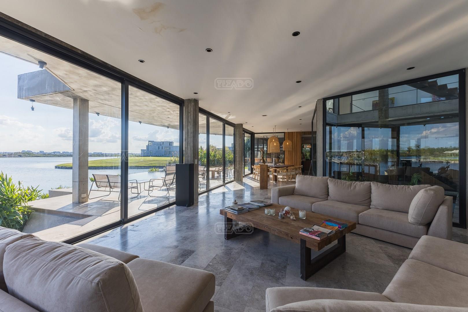 Es una casa de diseño exclusivo moderna, es como si flotara, rodeada por fuentes de agua y canteros verdes, implantada en un lote en esquina con 34 metros de costa sobre el lago central de Nordelta con increíble espejo de agua de 400 mtrs. . Con una calidad constructiva excelente en hormigón visto y madera de lapacho, donde desde cada uno de sus ambientes se ve el agua. El Living Comedor con amplísimos ventanales en esquina al estar construido sobre terreno elevado y aterrazado genera la sensación de estar en un barco con una visión panorámica del lago central. y puesta de sol. En el interior impacta un luminoso estanque verde central a cielo abierto. Ubicada al final de calle en cul de sac. PB: al ingreso te da una cálida bienvenida una fuente de agua vertical inclinada de pierda con un manantial oxigenando en forma natural el agua de los dos estanques externos con canteros verdes sus dos palmeras de 50 años, hall de recepción, amplio placard de visitas y cava para 150 vinos tras un muro de madera ranurada, patio interno vidriado a cielo abierto con cantero con palmera. Amplio home theatre separado por muro corredizo de tarquini. Living rodeado de ventanales piso a techo con imponente vista al lago central y salida a la galería y a amplia cochera sobre el lago con techo de hormigón visto y espacio para motos y bicicletas. Comedor con salida a la galería y vista al lago. Cocina en esquina con vista al lago con isla con mesada de marmol, anafe y 3 hornos empotrados: horno a gas con alzada en pared de acero inoxidable con extractor, microhondas y horno electrico. La cocina es semi integrada separada por puerta corrediza de madera embutidas y salida a la parrilla de leña con sistema de elevación electrica con brasero con puerta de vidrio templado y chapa doble de hierro y parrilla a gas. Despensa. Toilet con piso de porcelanato tundra. lavadero on mesada de granito negro, con entrada independiente. dependencia en suite con baño con ducha con entrada independiente. Amplia cochera sobre el lago con techo de hormigón visto y espacio para motos y bicicletas. Estacionamiento para 6 autos. PA: escalera flotante de madera de lapacho con baranda de hierro y vidrio. Estar con salida a la terraza con vista al lago. Suite principal hall con doble puerta, con gran ventanal con salida a terraza con vista al lago, baño completo en travertino italiano con doble bacha y doble ducha con jacuzzy con vista al lago y al stanque interno. amplio vestidor Segundo cuarto en suite con baño con ducha con ventadna con salida a la terraza con vista al lago. Tercer cuarto en suite con baño con doble bacha y ducha con salida a terraza con vista al frente. Cuarta suite con baño con ducha y ventana con salida a la terraza lateral y vista al lago. SEGUNDO PISO: gran altillo o 5to dormitorio con rincon para kitchenette, con ventanal a galería rodeado de luz, verde y agua con vista al lago central y al estanque interno. Baño completo con porcelanato mate con ducha. Todos los ventanales son de doble vidrio laminado con doble seguridad de 12 mm. Piso de piedra natunal Tundra pulido mate importada de Turquía. puertas de doble espesor super aislantes. Amplio muelle elevado con pergola diseño 3D en lapacho con iluminación. Pileta de 12 metros con borde infinity revestida de marmol travertino y piso de galería de marmol travertino. Doble solarium seco y húmedo con yacuzzi integrado. Centro de fuego separado con bancon de hormigón visto y fogón de hierro. Carpinterías PVC negras. Aire central dos equipos York. Calefacción por piso radiante a gas, electrico o por aire con dos equipos York. Muy buena iluminación de exterior en fachada, jardines y muelle. Central de domótica. Riego por asperción dividido en 5 circuitos. Cerco electrico.