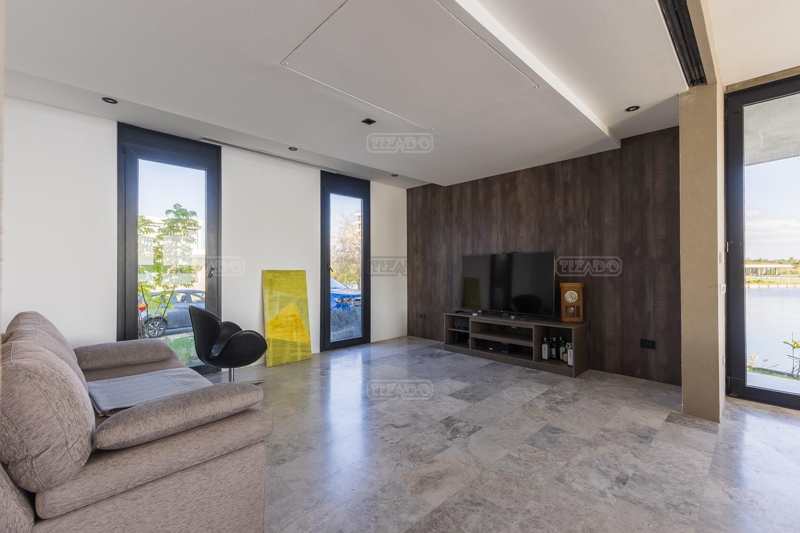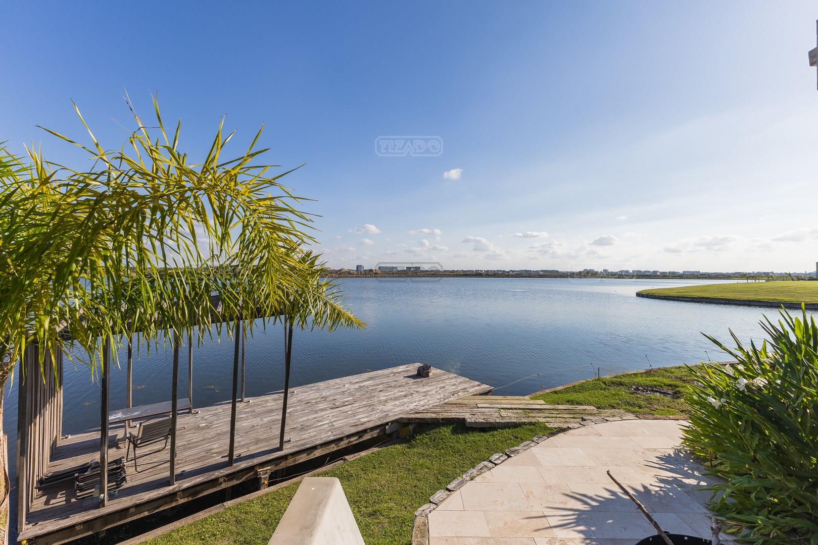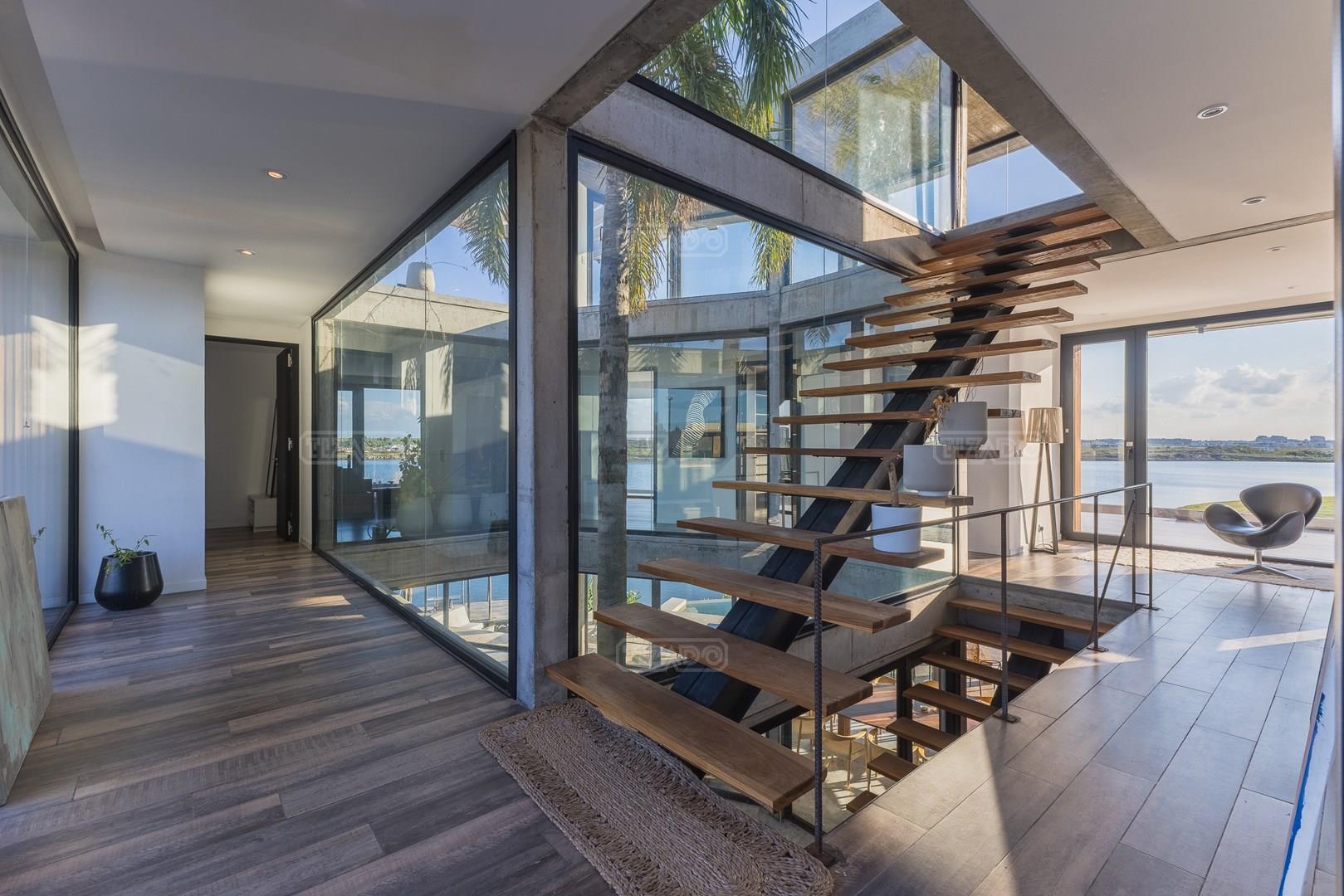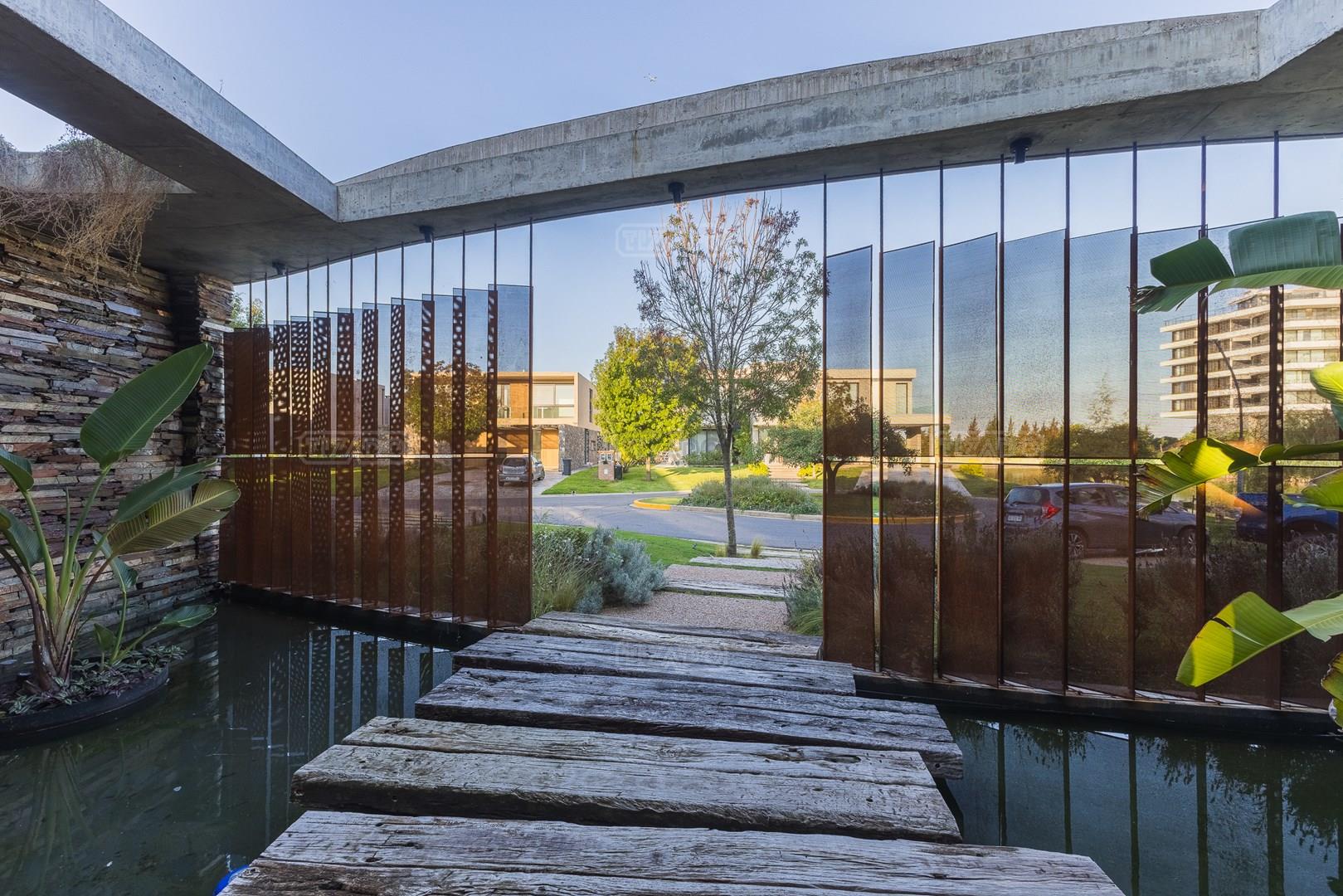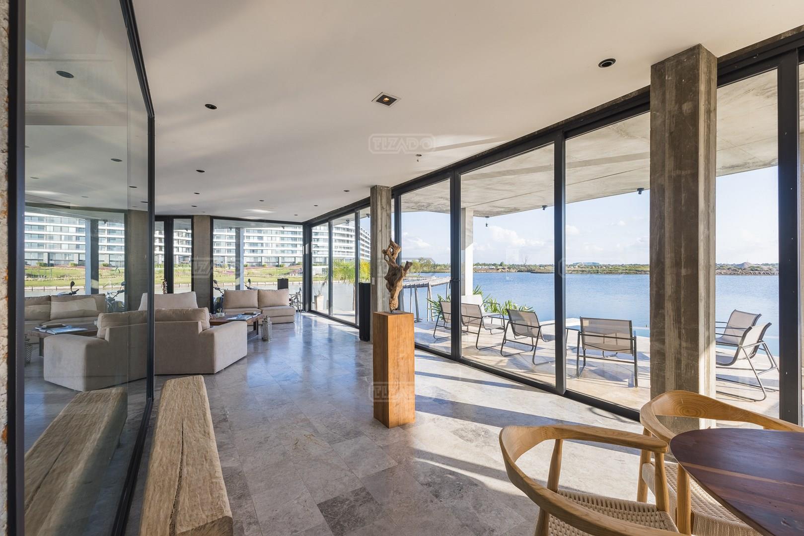 Es una casa de diseño exclusivo moderna, es como si flotara, rodeada por fuentes de agua y canteros verdes, implantada en un lote en esquina con 34 metros de costa sobre el lago central de Nordelta con increíble espejo de agua de 400 mtrs. . Con una calidad constructiva excelente en hormigón visto y madera de lapacho, donde desde cada uno de sus ambientes se ve el agua. El Living Comedor con amplísimos ventanales en esquina al estar construido sobre terreno elevado y aterrazado genera la sensación de estar en un barco con una visión panorámica del lago central. y puesta de sol. En el interior impacta un luminoso estanque verde central a cielo abierto. Ubicada al final de calle en cul de sac. PB: al ingreso te da una cálida bienvenida una fuente de agua vertical inclinada de pierda con un manantial oxigenando en forma natural el agua de los dos estanques externos con canteros verdes sus dos palmeras de 50 años, hall de recepción, amplio placard de visitas y cava para 150 vinos tras un muro de madera ranurada, patio interno vidriado a cielo abierto con cantero con palmera. Amplio home theatre separado por muro corredizo de tarquini. Living rodeado de ventanales piso a techo con imponente vista al lago central y salida a la galería y a amplia cochera sobre el lago con techo de hormigón visto y espacio para motos y bicicletas. Comedor con salida a la galería y vista al lago. Cocina en esquina con vista al lago con isla con mesada de marmol, anafe y 3 hornos empotrados: horno a gas con alzada en pared de acero inoxidable con extractor, microhondas y horno electrico. La cocina es semi integrada separada por puerta corrediza de madera embutidas y salida a la parrilla de leña con sistema de elevación electrica con brasero con puerta de vidrio templado y chapa doble de hierro y parrilla a gas. Despensa. Toilet con piso de porcelanato tundra. lavadero on mesada de granito negro, con entrada independiente. dependencia en suite con baño con ducha con entrada independiente. Amplia cochera sobre el lago con techo de hormigón visto y espacio para motos y bicicletas. Estacionamiento para 6 autos. PA: escalera flotante de madera de lapacho con baranda de hierro y vidrio. Estar con salida a la terraza con vista al lago. Suite principal hall con doble puerta, con gran ventanal con salida a terraza con vista al lago, baño completo en travertino italiano con doble bacha y doble ducha con jacuzzy con vista al lago y al stanque interno. amplio vestidor Segundo cuarto en suite con baño con ducha con ventadna con salida a la terraza con vista al lago. Tercer cuarto en suite con baño con doble bacha y ducha con salida a terraza con vista al frente. Cuarta suite con baño con ducha y ventana con salida a la terraza lateral y vista al lago. SEGUNDO PISO: gran altillo o 5to dormitorio con rincon para kitchenette, con ventanal a galería rodeado de luz, verde y agua con vista al lago central y al estanque interno. Baño completo con porcelanato mate con ducha. Todos los ventanales son de doble vidrio laminado con doble seguridad de 12 mm. Piso de piedra natunal Tundra pulido mate importada de Turquía. puertas de doble espesor super aislantes. Amplio muelle elevado con pergola diseño 3D en lapacho con iluminación. Pileta de 12 metros con borde infinity revestida de marmol travertino y piso de galería de marmol travertino. Doble solarium seco y húmedo con yacuzzi integrado. Centro de fuego separado con bancon de hormigón visto y fogón de hierro. Carpinterías PVC negras. Aire central dos equipos York. Calefacción por piso radiante a gas, electrico o por aire con dos equipos York. Muy buena iluminación de exterior en fachada, jardines y muelle. Central de domótica. Riego por asperción dividido en 5 circuitos. Cerco electrico.