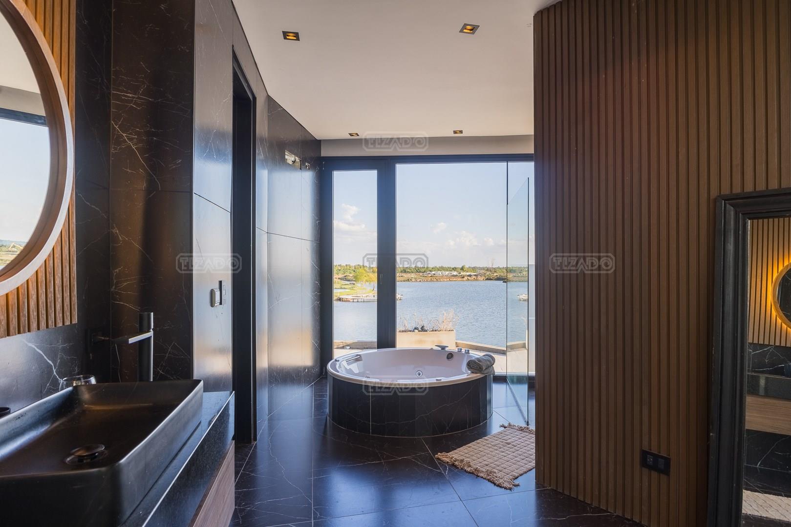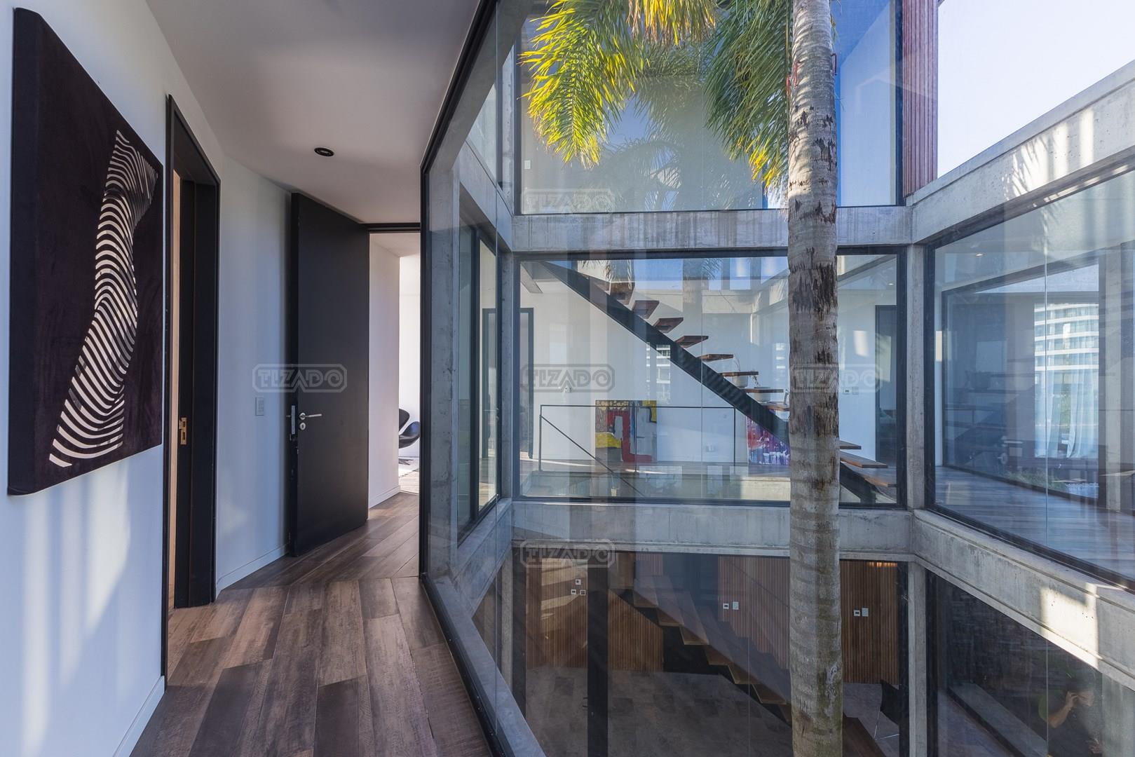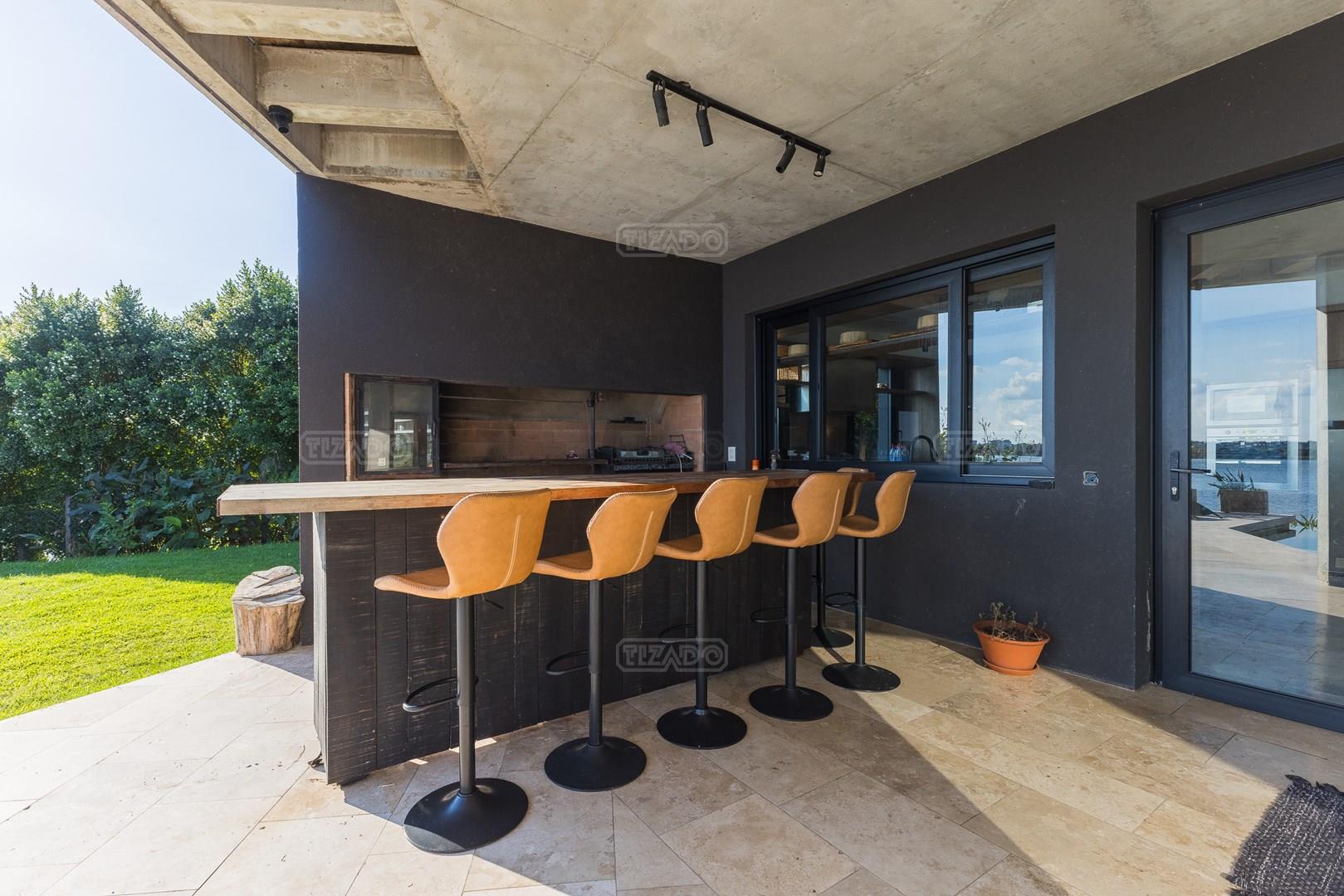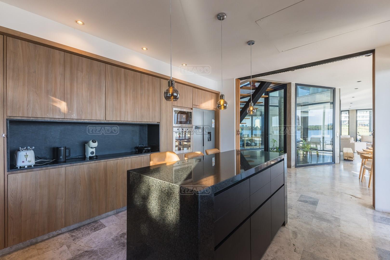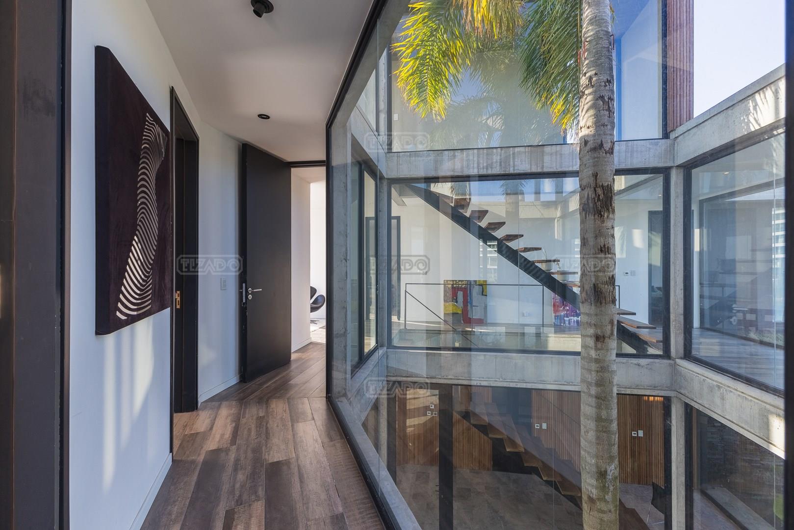 Es una casa de diseño exclusivo moderna, es como si flotara, rodeada por fuentes de agua y canteros verdes, implantada en un lote en esquina con 34 metros de costa sobre el lago central de Nordelta con increíble espejo de agua de 400 mtrs. . Con una calidad constructiva excelente en hormigón visto y madera de lapacho, donde desde cada uno de sus ambientes se ve el agua. El Living Comedor con amplísimos ventanales en esquina al estar construido sobre terreno elevado y aterrazado genera la sensación de estar en un barco con una visión panorámica del lago central. y puesta de sol. En el interior impacta un luminoso estanque verde central a cielo abierto. Ubicada al final de calle en cul de sac. PB: al ingreso te da una cálida bienvenida una fuente de agua vertical inclinada de pierda con un manantial oxigenando en forma natural el agua de los dos estanques externos con canteros verdes sus dos palmeras de 50 años, hall de recepción, amplio placard de visitas y cava para 150 vinos tras un muro de madera ranurada, patio interno vidriado a cielo abierto con cantero con palmera. Amplio home theatre separado por muro corredizo de tarquini. Living rodeado de ventanales piso a techo con imponente vista al lago central y salida a la galería y a amplia cochera sobre el lago con techo de hormigón visto y espacio para motos y bicicletas. Comedor con salida a la galería y vista al lago. Cocina en esquina con vista al lago con isla con mesada de marmol, anafe y 3 hornos empotrados: horno a gas con alzada en pared de acero inoxidable con extractor, microhondas y horno electrico. La cocina es semi integrada separada por puerta corrediza de madera embutidas y salida a la parrilla de leña con sistema de elevación electrica con brasero con puerta de vidrio templado y chapa doble de hierro y parrilla a gas. Despensa. Toilet con piso de porcelanato tundra. lavadero on mesada de granito negro, con entrada independiente. dependencia en suite con baño con ducha con entrada independiente. Amplia cochera sobre el lago con techo de hormigón visto y espacio para motos y bicicletas. Estacionamiento para 6 autos. PA: escalera flotante de madera de lapacho con baranda de hierro y vidrio. Estar con salida a la terraza con vista al lago. Suite principal hall con doble puerta, con gran ventanal con salida a terraza con vista al lago, baño completo en travertino italiano con doble bacha y doble ducha con jacuzzy con vista al lago y al stanque interno. amplio vestidor Segundo cuarto en suite con baño con ducha con ventadna con salida a la terraza con vista al lago. Tercer cuarto en suite con baño con doble bacha y ducha con salida a terraza con vista al frente. Cuarta suite con baño con ducha y ventana con salida a la terraza lateral y vista al lago. SEGUNDO PISO: gran altillo o 5to dormitorio con rincon para kitchenette, con ventanal a galería rodeado de luz, verde y agua con vista al lago central y al estanque interno. Baño completo con porcelanato mate con ducha. Todos los ventanales son de doble vidrio laminado con doble seguridad de 12 mm. Piso de piedra natunal Tundra pulido mate importada de Turquía. puertas de doble espesor super aislantes. Amplio muelle elevado con pergola diseño 3D en lapacho con iluminación. Pileta de 12 metros con borde infinity revestida de marmol travertino y piso de galería de marmol travertino. Doble solarium seco y húmedo con yacuzzi integrado. Centro de fuego separado con bancon de hormigón visto y fogón de hierro. Carpinterías PVC negras. Aire central dos equipos York. Calefacción por piso radiante a gas, electrico o por aire con dos equipos York. Muy buena iluminación de exterior en fachada, jardines y muelle. Central de domótica. Riego por asperción dividido en 5 circuitos. Cerco electrico.