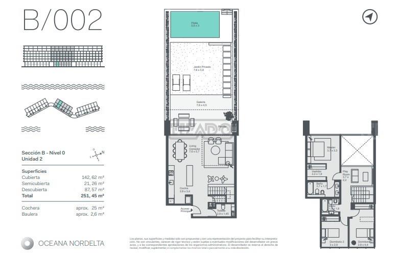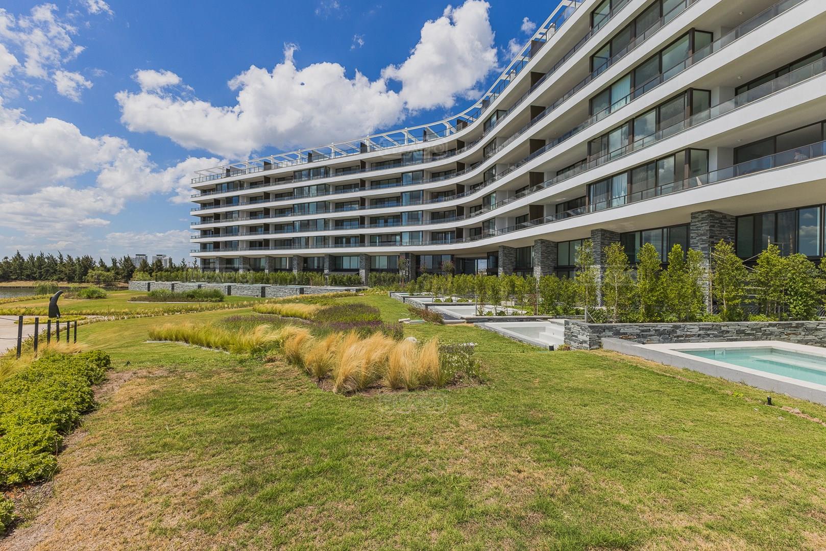 ACEPTA FINANCIACIÓN A 15 MESES. O LA POSIBILIAD DE TOMAR UNA PROPIEDADAD EN PARTE DE PAGO A CONSULTAR. Oceana Nordelta, imponente duplex 4 ambientes en planta baja con jardín y pileta propia al lago central de Nordelta. Con living comedor, una master suite , mas dos dormitorios con un baño, galería con parrilla sobre jardín y lago central, y toilette. Con dos cocheras cubiertas y una baulera. Lugares de estar apaisados, con doblevisual: sol de la mañana y atardecer sobre el lago. Equipamiento y muebles de diseño contemporáneo. Tecnología y bajo consumo. Materiales solo de primera calidad. Dormitorios que guardan clara independencia entre ellos y respecto de las áreas sociales. Ambientes que respiran, ventilación cruzada. Espacios que se continúan en terrazas exteriores. Una idea de confort que se extiende más allá del propio hábitat. Oceana esta ubicado en el cruce exacto entre paisajes. A orillas del gran lago central con una perfecta armonía entre naturaleza y paisaje hacen de esta belleza un lugar para vivir. Muelle privado y mirador hacia la laguna, salas de reuniones independientes en planta baja, pileta climatizada cubierta, gimnasio con aparatos de ultima generación, salón de relax, yoga y spa. Lounges y salas de ensayo, piletas y solarium exterior, senderos peatonales rodeando la laguna, energía de emergencia disponible para cada unidad desde grupo electrógeno central. Certificación sustentable, terrazas, jardines privados con parrilla y vista a la laguna. Unidades pasantes con vista este/ oeste. Pent houses y unidades tipo en los extremos del edificio con amplias terrazas semi cubiertas. Allí donde la naturaleza y el aire puro se encuentran con la más alta calidad de servicios urbanos dominando el centro de la escena en una ciudad reconocida como pionera y líder en su tipo. Desde su lanzamiento en 1.999, Nordelta muestra un crecimiento indetenible y a la vez inteligente por la combinación del buen gusto, sus atractivos y la naturaleza, que con el desarrollo de Oceana logra el equilibrio perfecto de confort y bienestar. Imponente y sutil reconoce la valoración del espacio y la privacidad ofreciendo unidades de dos, tres, cuatro y cinco ambientes con exquisitos detalles de terminación. Su ubicación privilegiada, a solo 30 km de la Capital Federal y con dos rápidas vías de acceso. Oceana expresa los estándares de calidad de Consultatio: una locación única, construcción high-end y criterios de sustentabilidad. Exhibe ya dos desarrollos exitosos en Estados Unidos, localizados en Bal Harbour y Key Biscayne, y en Argentina estará presente en Puerto Madero y Nordelta. Una propuesta de vida diferente que busca redescubrir los espacios a través de nuevas formas de vinculación con sus entornos. 1 Planta Baja – Niveles de Acceso – Plaza. • Acceso vehicular por calle exclusiva hasta el lobby de acceso residencial (drop-off). • Acceso vehicular a cocheras cubiertas con sistema de control de acceso a rampa y garita de seguridad. • Programa de arte en halles y circulaciones. • Halls amplios de acceso en doble altura con carpinterías de aluminio, pisos graníticos pulidos y revestimientos de primera calidad. Escalera monumental de vinculación a amenities de Subsuelo. • Estacionamientos de cortesía. • Jardin de acceso parquizado. • Muelle privado y mirador hacia la laguna. • Amenities en planta baja: dos salas de reuniones independientes. Baño y kitchenette privado. • Edificio implantado a 100m aproximadamente de la Av. Del Golf. 2 Subsuelos. • Cocheras. Acceso y egreso vehicular por rampa. • Estacionamiento para bicicletas. • Acceso directo a los núcleos de circulación vertical. • Bauleras de las unidades. • Pileta climatizada cubierta. • Gimnasio con aparatos de última generación . • Sanitarios, Vestuarios y Duchas. • Salón de Usos Múltiples y Confiteria con cocina independiente y baños. • Salon de relax, yoga o spa, lounges y playrooms. • Sala de ensayos. 3 Características del Edificio. • Fachada combinada de revestimientos decorativos, vidrio y bandas de hormigón. Carpinterías de aluminio con doble vidriado acústica y térmica. • Pileta y solárium exterior. Senderos peatonales rodeando la laguna. • Palieres semi privados servidos por ascensores de última tecnología. • Energía de emergencia disponible para cada unidad (desde grupo electrógeno central). • Certificación sustentable, construcción sostenible, consumo de energía y de agua eficiente / sustentable. • Town houses en planta baja y primer piso tipo dúplex con 2 o 3 dormitorios, livings en doble altura. Terrazas / Jardines privados con parrilla, piletas y vista a la laguna. • Unidades pasantes con vistas este/oeste. Livings anchos y apaisados, terrazas al lago, terrazas con parrillas al Este. • Pent Houses y unidades tipo en los extremos del edificio con amplias terrazas semicubiertas. • ½ km Loop de Joging “field Track”. • Revestimiento de sanitarios. Los baños principales serán revestidos en porcelanato y detalles de piedra natural o similar. Los baños secundarios serán revestidos en porcelanato. • Revestimiento de pisos y zócalos. Todos los pisos de baños llevaran porcelanato. El piso de palier irá en porcelanato. Revestimiento interior de las unidades y exterior en balcones y terrazas ira en porcelanato. Los zócalos serán de madera. • Mesadas. En cocinas se colocarán mesadas de Quarzo tipo silestone o similar con bacha de acero inoxidable. En los Baños de dormitorios principales y secundarios serán mesadas de Quarzo tipo silestone o similar con muebles de apoyo. • Artefactos, griferías y accesorios de baños. Artefactos sanitarios y griferías de bajo consumo y buena calidad. • Equipamiento de cocinas. Los muebles de cocina de diseño contemporáneo. Materiales y herrajes de primera calidad. El equipamiento de cocinas estará constituido por los siguientes elementos: o Un horno eléctric