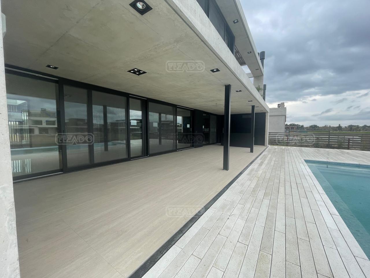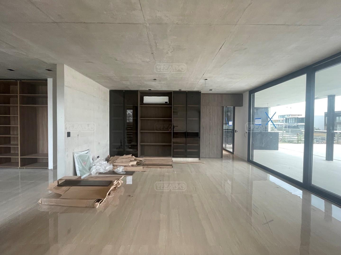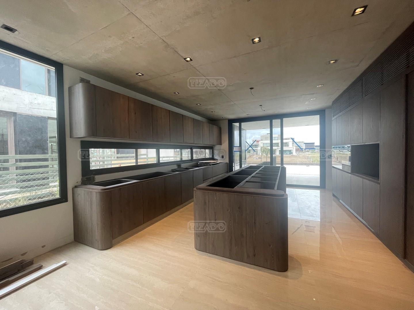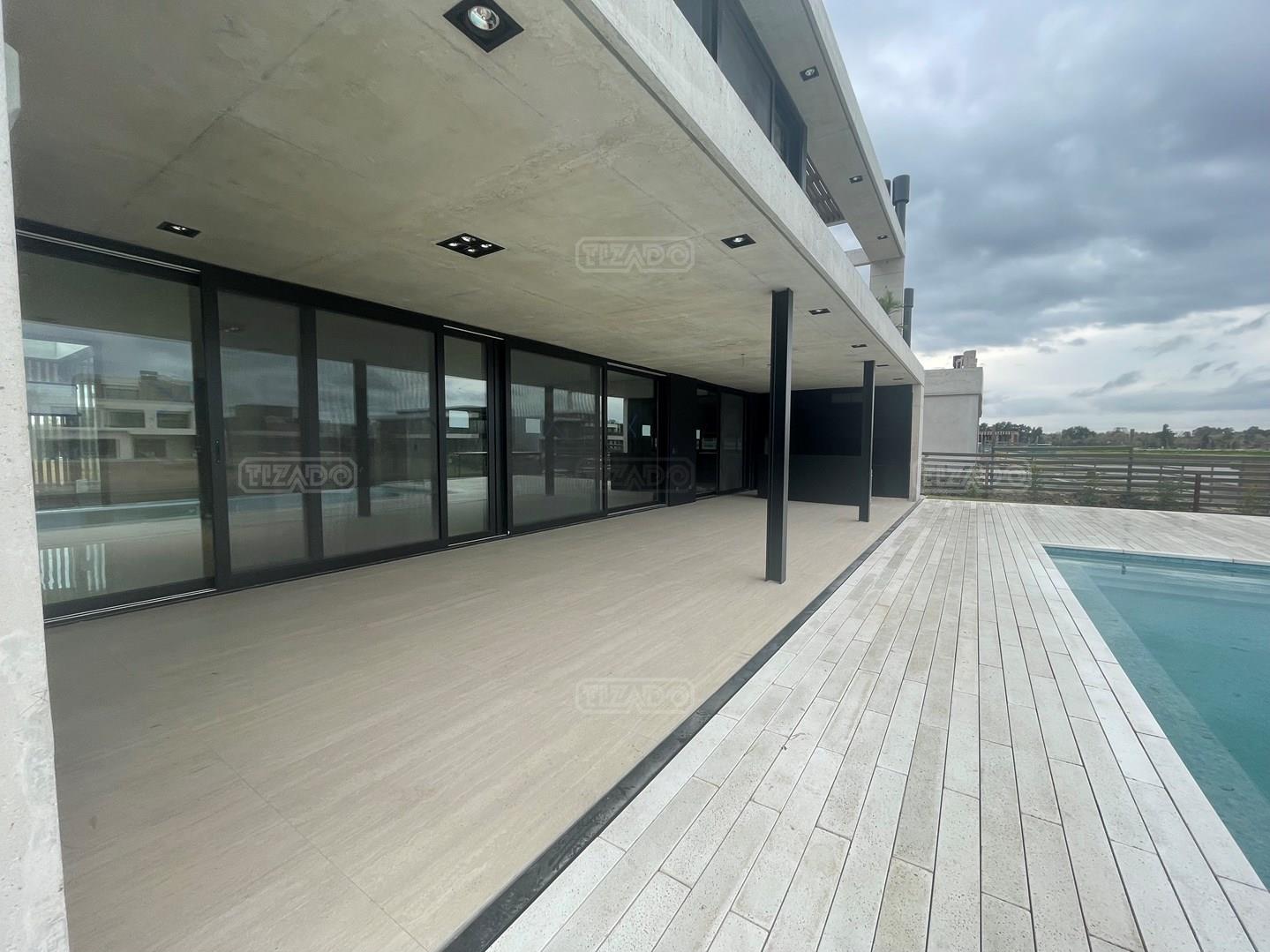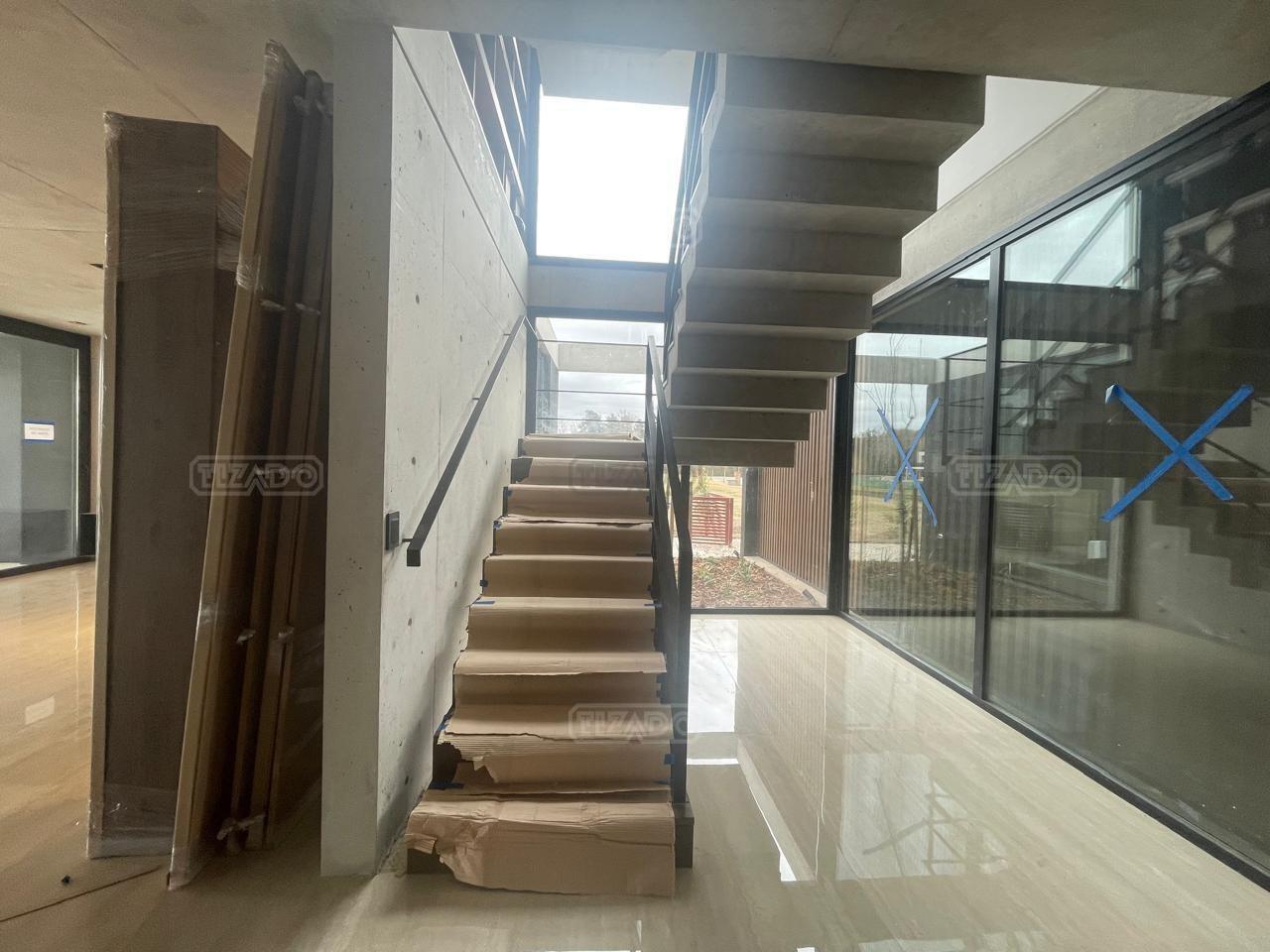 Plana baja: - Hall de entrada con placard de recepción. - Living / Comedor con salida a la galería. - Toilette. - Cocina con isla semi-integrada al living comedor. Salida a la galería. - Family integrado a la cocina - Lavadero independiente con salida al exterior. - Dependencia de servicio con baño completo con ducha. Primer planta: Acceso por escalera. - Hall de distribución. - Dormitorio principal en suite con vestidor. Baño completo con doble bacha y box de ducha. Salida a terraza privada. - 3 habitaciones en suite con placard y baño completo. - Escritorio o playroom Segunda planta: Acceso por escalera. - Sum con gran vista y salida a la terraza. - Cocina. - Baño completo. Exterior: - Galería cubierta con parrilla y barra. - Baño exterior con ducha. - Jardín parquizado con riego automático. - Pileta con revestimiento de venecitas y borde infinito. - Garaje cubierto para tres autos. MEMORIA DESCRIPTIVA: Hormigón visto en tabiques exteriores y cielorrasos. Revestimientos interiores y muebles de madera enchapada lustrada. Puertas de madera a medida. Aberturas en P.V.C. negro con DVH (doble vidrio). Calefacción por piso radiante mediante calderas Aire acondicionado sistema VRV