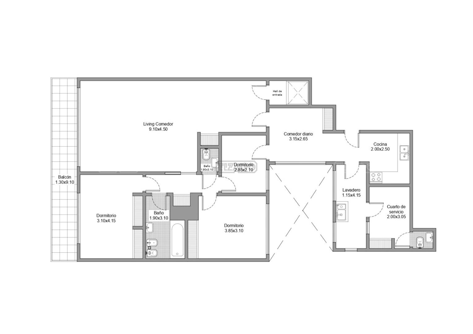 - Balcón: 9x1.30