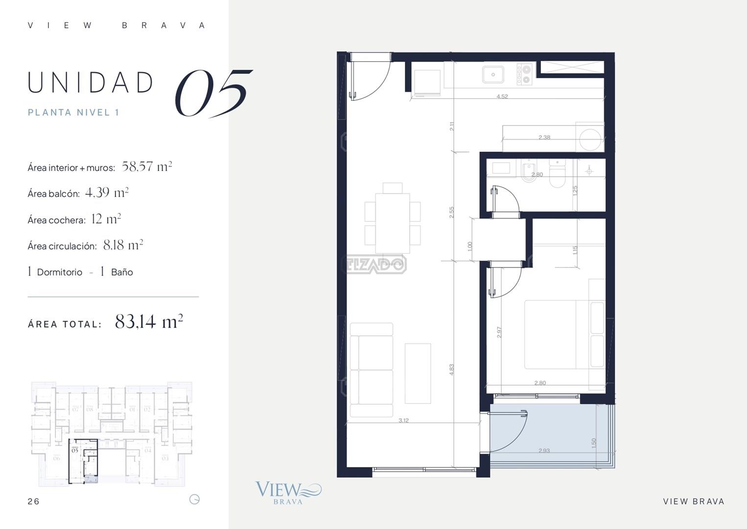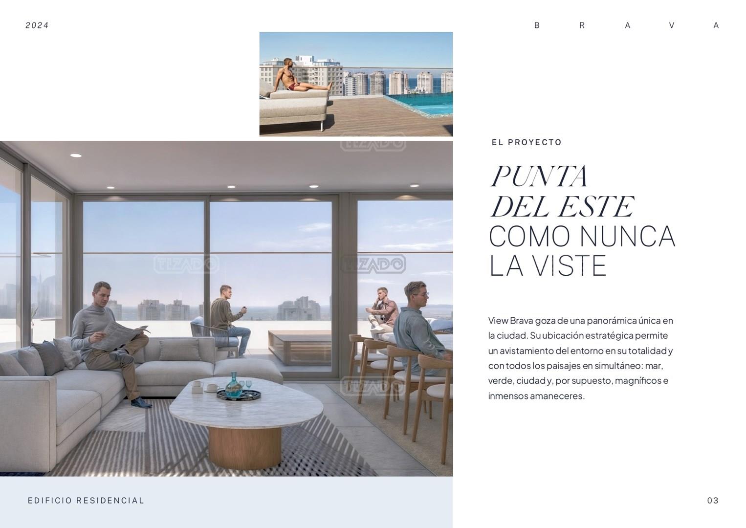 View Brava es símbolo de diseño y comodidades pensadas para residir, trabajar, invertir y disfrutar todo en un mismo lugar. La opción ideal en Punta del Este con excelentes amenities, piscina cubierta climatizada, piscina exterior, sauna y vestuarios para damas y caballeros, área de relax exterior, sala de juegos para niños, playroom para adolescentes, sala de reuniones, amplio solarium con cómodas reposeras y camastros, gimnasio de última generación, parrillero cubierto. Diseño de gran confort, excelentes vistas, finas terminaciones, extensos ventanales de piso a techo, wifi en áreas comunes y privadas. Diseño funcional con modernas unidades de uso residencial o profesional. Cocheras en subsuelo, estacionamiento exterior, ascensores de última generación. Forma de pago: 40 % al compromiso y 40 cuotas con 5% de interés post ocupación. Gastos de ocupación planos y alhajamiento 6.5%.