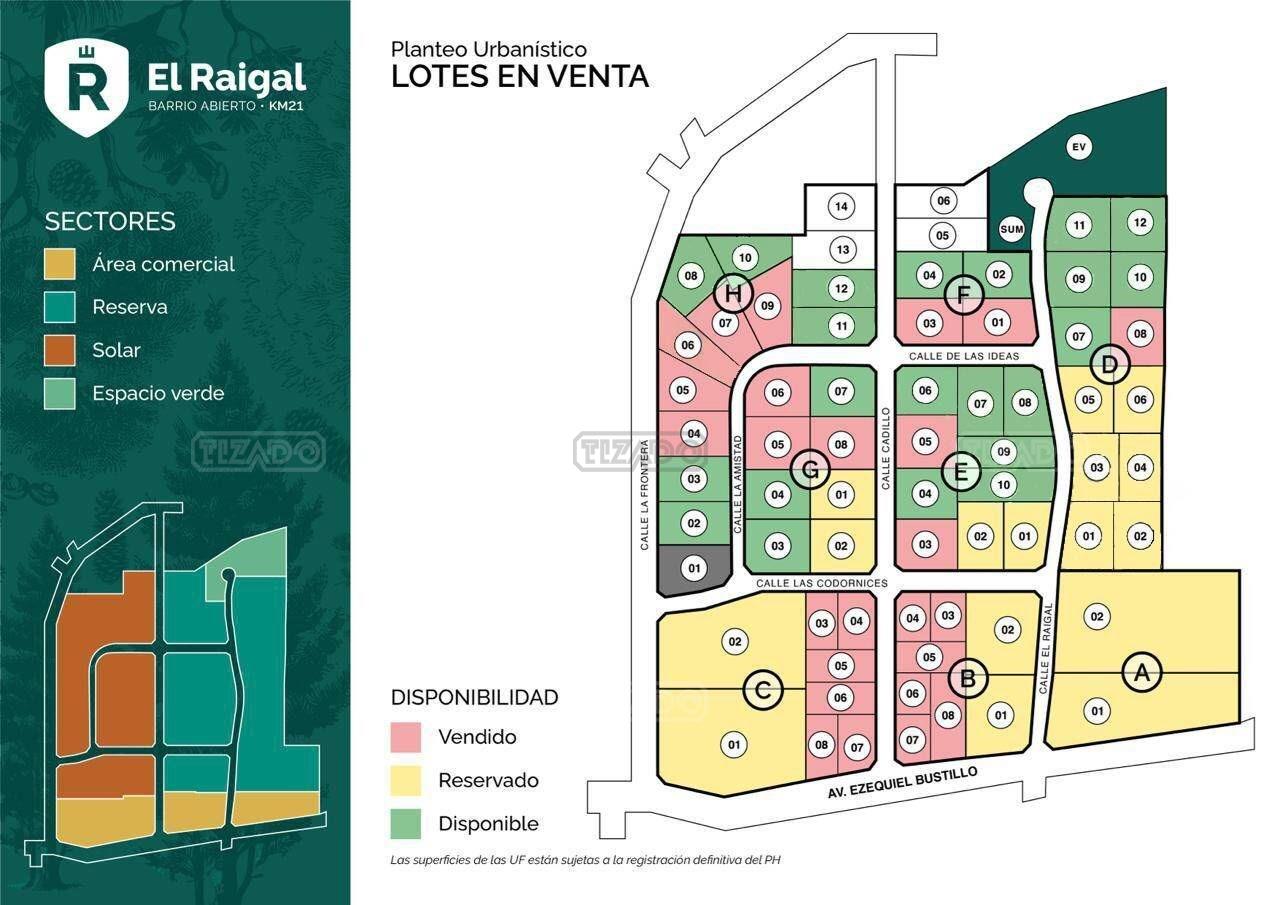 El Raigal - Un Oasis en Bariloche Descubre El Raigal, un exclusivo barrio residencial diseñado para quienes buscan vivir en amplios lotes, con todos los servicios de una ciudad y sin expensas. Ubicado en el hermoso Circuito Chico, este lugar único es un verdadero oasis en Bariloche. El Raigal combina un diseño urbanístico moderno con estrategias de eficiencia energética. Disfruta de un entorno natural excepcional, con áreas de reserva forestal que albergan especies autóctonas, además de luminarias LED que promueven la sostenibilidad. El barrio contará con un sistema de seguridad cerrado, equipado con cámaras en las tres entradas para tu tranquilidad. Conéctate al mundo a través de nuestra red de fibra óptica soterrada, todo dentro de uno de los Parques Nacionales más bellos del país. El Raigal te ofrece: Agua potable Electricidad Gas natural Recolección de residuos sólidos Salón de usos múltiples (SUM) y plaza con juegos saludables Cancha de fútbol Amplios espacios verdes Bicisendas y senderos Paradas de transporte y estacionamiento ¡Financiación disponible! Modalidad de pago: 30% de anticipo, 50% en 24 cuotas fijas y 20% al momento de la posesión. Ni Tizado Propiedades (M&G Inmuebles Patagonia SRL), ni el Martillero a cargo son responsables de los indicadores urbanísticos, factibilidades de construcción, ni usos permitidos sobre el inmueble objeto del presente. Corredor y Martillero Matriculado: Sebastián Caretta - Matricula N.333-RP-20 F.412 T.Il