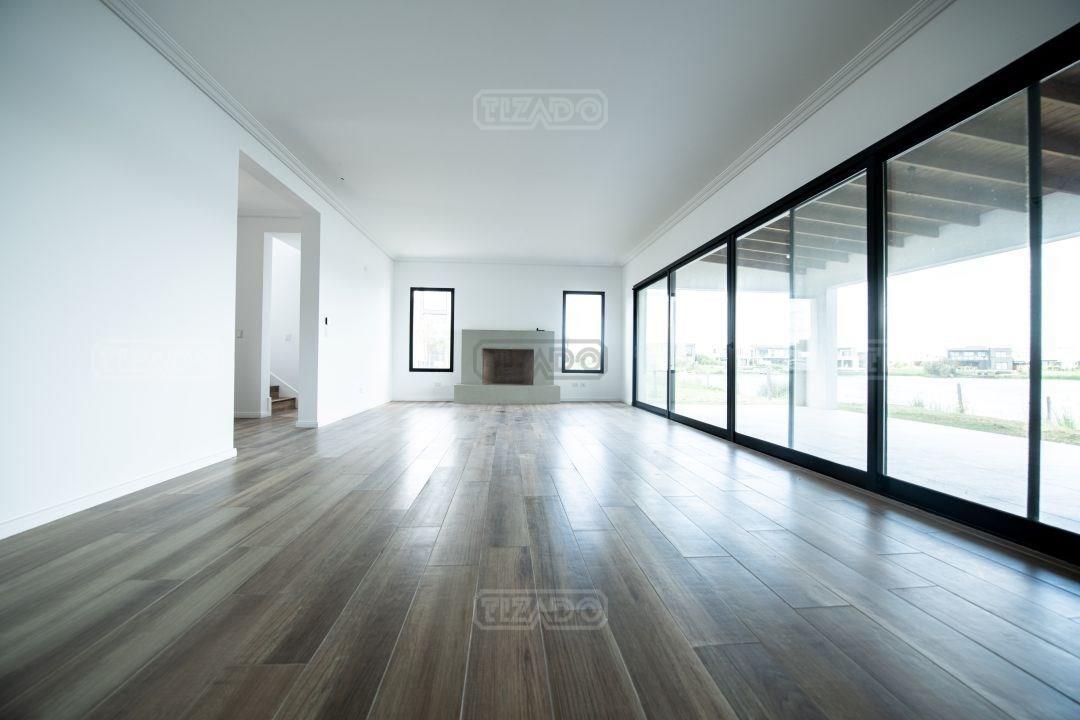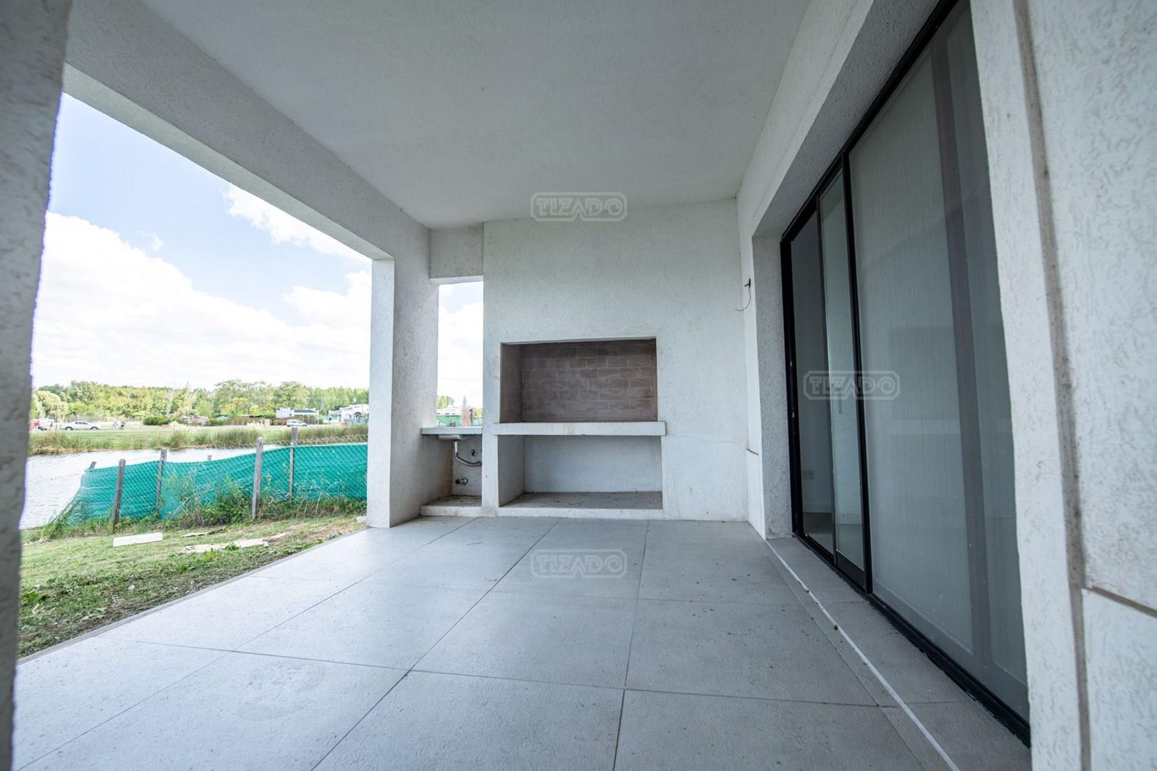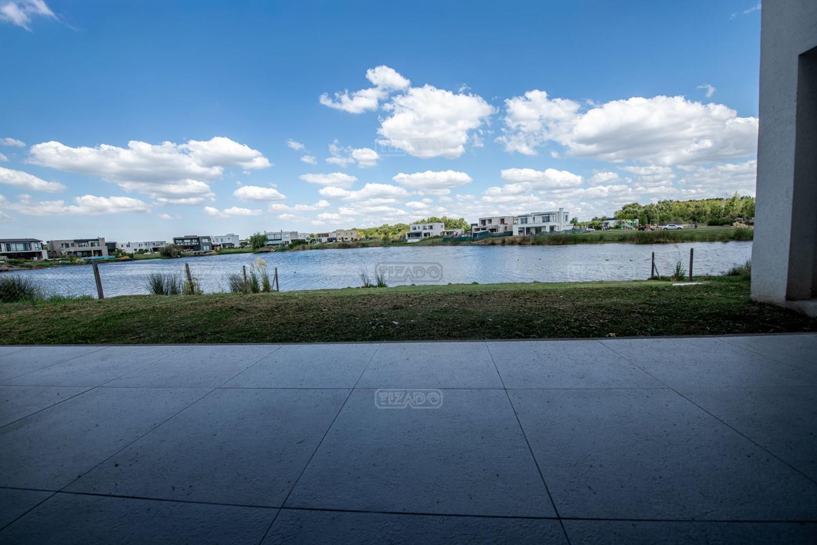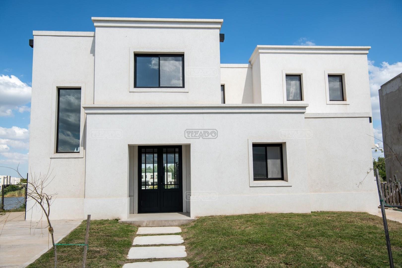 Hermosa casa desarrollada en dos plantas, con un excelente diseño moderno, práctica y luminosa, con fondo a laguna Muy buenas vistas desde todos los ambientes. Amplio hall de recepción. Toilette. Living con hogar separado de la cocina comedor por una mampara corrediza con marco de hierro y grandes ventanas corredizas a la galería La cocina se presenta con muebles bajo y sobre mesada de excelente calidad En el exterior una amplia galería que a través de sus ventanales se integra al living, además otra galería independiente en la zona de la parrilla, que comunica a la cocina comedor Completan el área de servicio, el lavadero con salida al exterior y habitación de servicio con placard y baño completo En la planta alta se encuentran dos amplios dormitorios con placares de piso a techo, totalmente equipados con cajoneras y espacios de guardado Un baño de generosas dimensiones que da servicio a los cuartos Completa la distribución de planta alta, un amplio playroom o escritorio con doble puerta de ingreso Integran la suite, un ante baño y baño completo, vestidor y terraza con hermosas vistas que invitan a disfrutar del paisaje. Detalle de terminacion: *Pisos de porcelanato *Preinstalación de AA en todos los ambientes, calefacción por losa radiante con caldera dual *Carpintería de aluminio pre pintado en negro con DVH *Sanitarios y grifería de primera calidad *Todas las puertas de interior con molduras *Mesada y muebles de cocina también de primera calidad SANTA ANA * Localidad: Villa Nueva * Hectáreas totales: 70 ha * Cantidad unidades: 381 * Superficie promedio por unidad: 600 m² * Atributos: lagunas; pilares de servicios; redes subterráneas de electricidad, agua, cloaca y gas