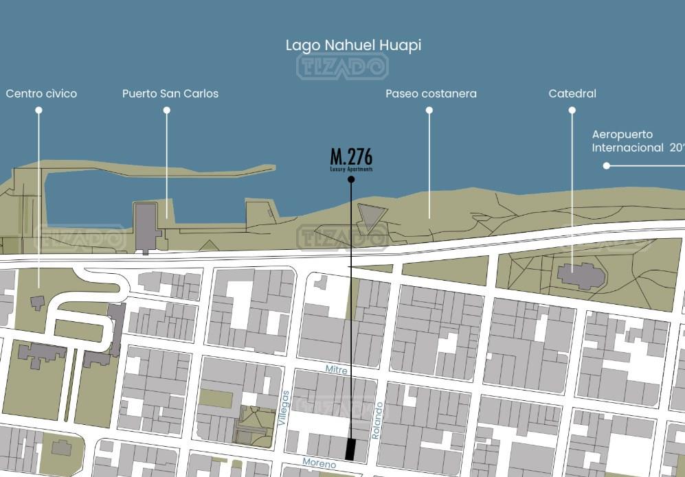 M.276 Luxury Apartments FINANCIACION 40 % + 24 cuotas fijas en dolares. PROMO CONTADO POR LANZAMIENTO , CONSULTAR. M.276 es un edificio refuncionalizado ubicado en pleno centro de Bariloche, sobre la calle Moreno. Su ubicación es cercana al lago Nahuel Huapi, rodeado de cafés, restaurantes y los principales atractivos de la ciudad. El edificio cuenta con 37 unidades, de 1 y 2 ambientes, con equipamiento de diseño, se desarrolla en planta baja y siete niveles, con un local comercial al frente. El local incluye depósito en subsuelo y jardín. La fachada renovada, con revestimientos en WPC símil madera y aberturas de PVC de alta prestación, logra una estética contemporánea y de bajo mantenimiento. Entre los atractivos cercanos se mencionan el Centro Cívico, Puerto San Carlos, la Catedral y el Aeropuerto Internacional (a 20'). Tipologías de Unidades y Características TODAS LAS UNIDADES cuentan con aberturas de PVC símil madera con DVH. Cerradura Smart Lock. Grifería FV (o similar). Smart Toilet. Porcelanato rectificado. Radiadores de alta eficiencia. A partir del 4to piso, las unidades ubicadas al contrafrente tienen vista al lago. Ni Tizado Propiedades (M&G Inmuebles Patagonia SRL), ni el Martillero a cargo son responsables de los indicadores urbanísticos, factibilidades de construcción, ni usos permitidos sobre el inmueble objeto del presente. Corredor y Martillero Matriculado: Sebastián Caretta - Matricula N.333-RP-20 F.412 T.Il