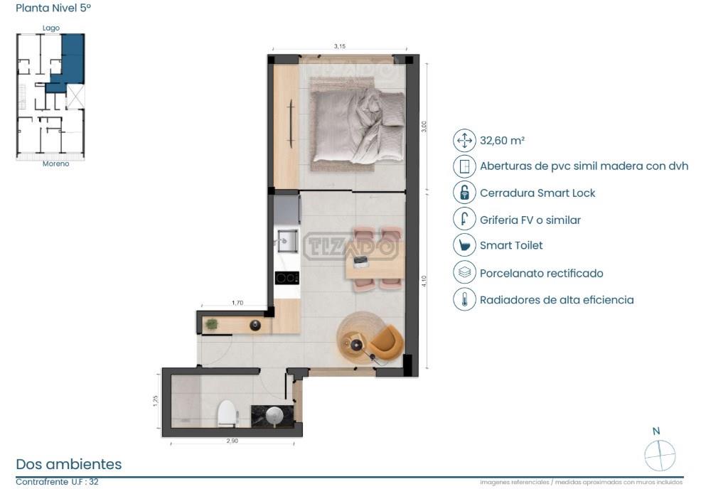 M.276 Luxury Apartments FINANCIACION 40 % + 24 cuotas fijas en dolares. PROMO CONTADO POR LANZAMIENTO , CONSULTAR. M.276 es un edificio refuncionalizado ubicado en pleno centro de Bariloche, sobre la calle Moreno. Su ubicación es cercana al lago Nahuel Huapi, rodeado de cafés, restaurantes y los principales atractivos de la ciudad. El edificio cuenta con 37 unidades, de 1 y 2 ambientes, con equipamiento de diseño, se desarrolla en planta baja y siete niveles, con un local comercial al frente. El local incluye depósito en subsuelo y jardín. La fachada renovada, con revestimientos en WPC símil madera y aberturas de PVC de alta prestación, logra una estética contemporánea y de bajo mantenimiento. Entre los atractivos cercanos se mencionan el Centro Cívico, Puerto San Carlos, la Catedral y el Aeropuerto Internacional (a 20'). Tipologías de Unidades y Características TODAS LAS UNIDADES cuentan con aberturas de PVC símil madera con DVH. Cerradura Smart Lock. Grifería FV (o similar). Smart Toilet. Porcelanato rectificado. Radiadores de alta eficiencia. A partir del 4to piso, las unidades ubicadas al contrafrente tienen vista al lago. Ni Tizado Propiedades (M&G Inmuebles Patagonia SRL), ni el Martillero a cargo son responsables de los indicadores urbanísticos, factibilidades de construcción, ni usos permitidos sobre el inmueble objeto del presente. Corredor y Martillero Matriculado: Sebastián Caretta - Matricula N.333-RP-20 F.412 T.Il