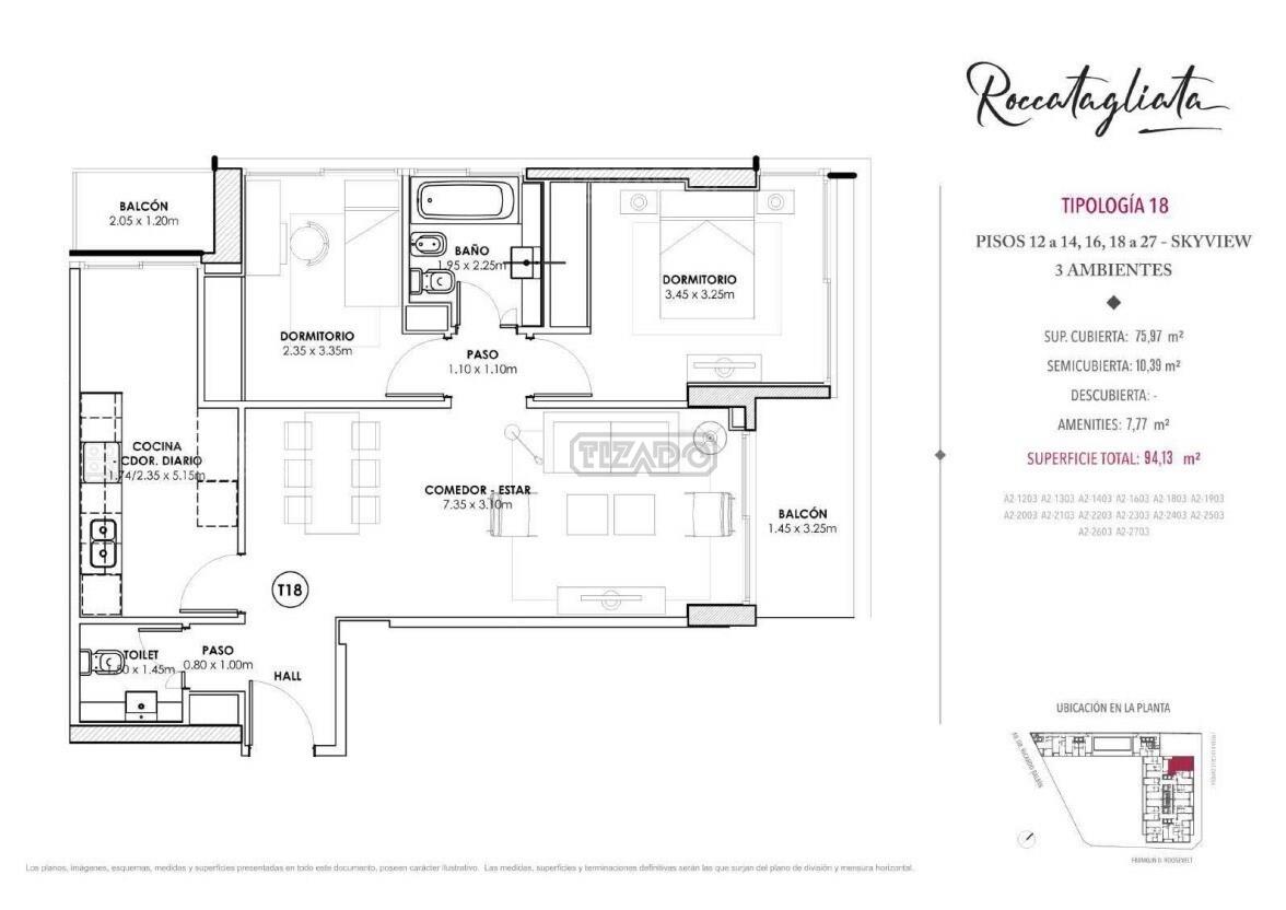 PALACIO ROCCATAGLIATA AV. BALBÍN esq. F. ROOSEVELT, COGHLAN, C.A.B.A. DOS TORRES: Torre Palace: 12 pisos & Torre Sky View: 27 pisos - de 45 a 203m² COCHERAS Y BAULERAS OPCIONALES PALACIO ROCCATAGLIATA es un complejo compuesto por un bloque de 12 pisos y una torre de 27 pisos y 3 subsuelos, con diversas tipologías de unidades de vivienda. Amenities premium - Cocheras opcionales. Se destaca la imponente presencia de la casona de la familia Roccataglita, que tras ser íntegramente restaurada muestra todo su esplendor. También comprende un área de locales comerciales. sobre la calle Zapiola. Unidades residenciales de 1 a 4 ambientes con dependencia, cocheras y bauleras. Amenities Interiores: Gimnasio, Vestuarios, Cava de vinos, Spa/Sauna seco y húmedo, Sal de reuniones, Cocheras de cortesía, Seguridad privada, Kids club, Laundry, Bicicleteros. Amenities Exteriores: Sky club, Juegos para niños, Gimnasio en terraza, Terrazas accesibles, SUM con expansión, SUM in/out, Solarium, Sector parquizado, Piscina para niños y adultos. 28 pisos - 45.000 m² Locales comerciales sobre Zapiola Bienvenidos a Roccatagliata, un emprendimiento único que redefine el concepto de residencia premium en la ciudad. Ubicado en Roosevelt 3141, en el corazón de Coghlan. Roccatagliata es mucho más que un conjunto de viviendas; es un oasis de lujo y exclusividad diseñado para aquellos que buscan un estilo de vida sofisticado y contemporáneo. Concebido cuidadosamente en cada detalle para ofrecer una experiencia única, fusionando el confort moderno con la elegancia clásica de un Palacio nacido en 1900. Desde la majestuosidad de su arquitectura hasta la calidad de sus terminaciones, Roccatagliata se erige como un símbolo de distinción y buen gusto en un nuevo estándar de vida. Se trata de un conjunto edilicio formado por un bloque de 12 pisos, más una torre de 27 pisos y 3 subsuelos, que aloja diversas tipologías de unidades de vivienda, cocheras, bauleras, locales de servicios generales, amenities, hall de acceso peatonal con jardines perimetrales, área para locales comerciales, terraza con solárium y piscina, unidad de encargado, azotea y salas de máquinas. El conjunto se organiza mediante múltiples núcleos de circulación vertical con palieres que conectan las unidades de vivienda con el lobby de acceso, cocheras y demás áreas comunes. Se respeta la antigua residencia de la Familia Roccatagliata, por estar dentro del patrimonio histórico de la ciudad y se la incorpora a la red urbana por medio de su puesta en valor. CARACTERÍSTICAS GENERALES DEL CONJUNTO Hall de acceso peatonal con marquesina y área ajardinada. Cabina de seguridad - control de acceso. Entrada y salidas vehiculares independientes desde los subsuelos de estacionamientos. Lobby en doble altura con frente vidriado, doble puerta de acceso, pisos de mármol o granito natural y revestimiento de espejo y/o madera y acero inox. Cámara transformadora de compañía prestadora de energía eléctrica (sujeto a aprobación de factibilidad). Acceso para discapacitados en cumplimiento con la ley de “Accesibilidad Física para Todos”. Baterías de ascensores con cabinas revestidas en acero inoxidable y espejo de amplias dimensiones, con botonera digital e indicador de piso en cabina. Puertas automáticas de acero inoxidable en PB y chapa pintada en palieres. Subsuelos / Estacionamientos / Recintos para medidores eléctricos y de gas / Sala de termotanques / Tanques de reserva e incendio / Sala para compactador / Sala para garajista y para ayudante de portería con sanitarios Sector para cava de vinos / Sistema de ventilación mecánica y renovación de aire reglamentario en estacionamiento / Baños en estacionamiento. / Sala para laundry / Bauleras o espacios de guardado / Espacio para grupo electrógeno / Sistema de espiras internas para control de tránsito vehicular entre niveles. / PISO 1° Unidades de vivienda. / Mono ambientes y departamentos de 1, 2 y 3 dormitorios. Vivienda de encargado. PISO 2° y 3° Unidades de viviendas. / Mono ambientes y departamentos de 1, 2 y 3 dormitorios. PISO 4° a 6° Unidades de viviendas. / Mono ambientes y departamentos de 1, 2 y 3 dormitorios. PISO 7° Unidades de viviendas. / departamentos de 1, 2 y 3 dormitorios. PISO 8° Unidades de vivienda de 1, 2 y 3 dormitorios. Gimnasio y terraza accesible parquizada. PISO 9° y 12° Unidades de viviendas 1, 2 y 3 dormitorios. PISO 13° Unidades de viviendas 1, 2 y 3 dormitorios. Solárium con piscina descubierta. PISO 14° a 27° Unidades de viviendas 1, 2 y 3 dormitorios.- AZOTEA Sky club / Sala de maquinas ascensores SE PREVERÁN LAS CANALIZACIONES PARA LOS SIGUIENTES SERVICIOS SIN PROVISIÓN DE EQUIPAMIENTO • Control de accesos y circuito cerrado de CCTV. • Servicio de telefonía interna directa desde cada unidad hacia la casilla de guardia y áreas comunes. • Sistema de detección de incendio en lugares a definir. (palieres, salas de máquinas y subsuelos) INSTALACIONES TERMICAS Y ELECTRICAS. Instalación Termomecánica y de calefacción Canalización, instalación de cañerías refrigerantes y acometidas eléctricas para la instalación de equipos de aire acondicionado frío-calor sistema de tipo Split o Multisplit, marca Daikin, Electra, LG, BGH o similar, con provisión e instalación de equipos (sujeto a disponibilidad al momento de la contratación). Extracción mecánica de sanitarios con conductos de chapa. Ventilación mecánicamente las Salas de Tableros, Salas de Bombas, Depósitos, Salas de Máquinas de Ascensores y demás locales de Servicio de los Subsuelos. Las cocheras contarán con la ventilación mecánica reglamentaria. Instalación Eléctrica Cañería y cables reglamentarios, doble circuito eléctrico por unidad separando el circuito de tomas con el de iluminación, tablero con llaves térmicas y disyuntor diferencial (marcas SICA, ABB TUBIO o equivalente), según reglamentación de la Cía. Proveedora del servicio eléctri