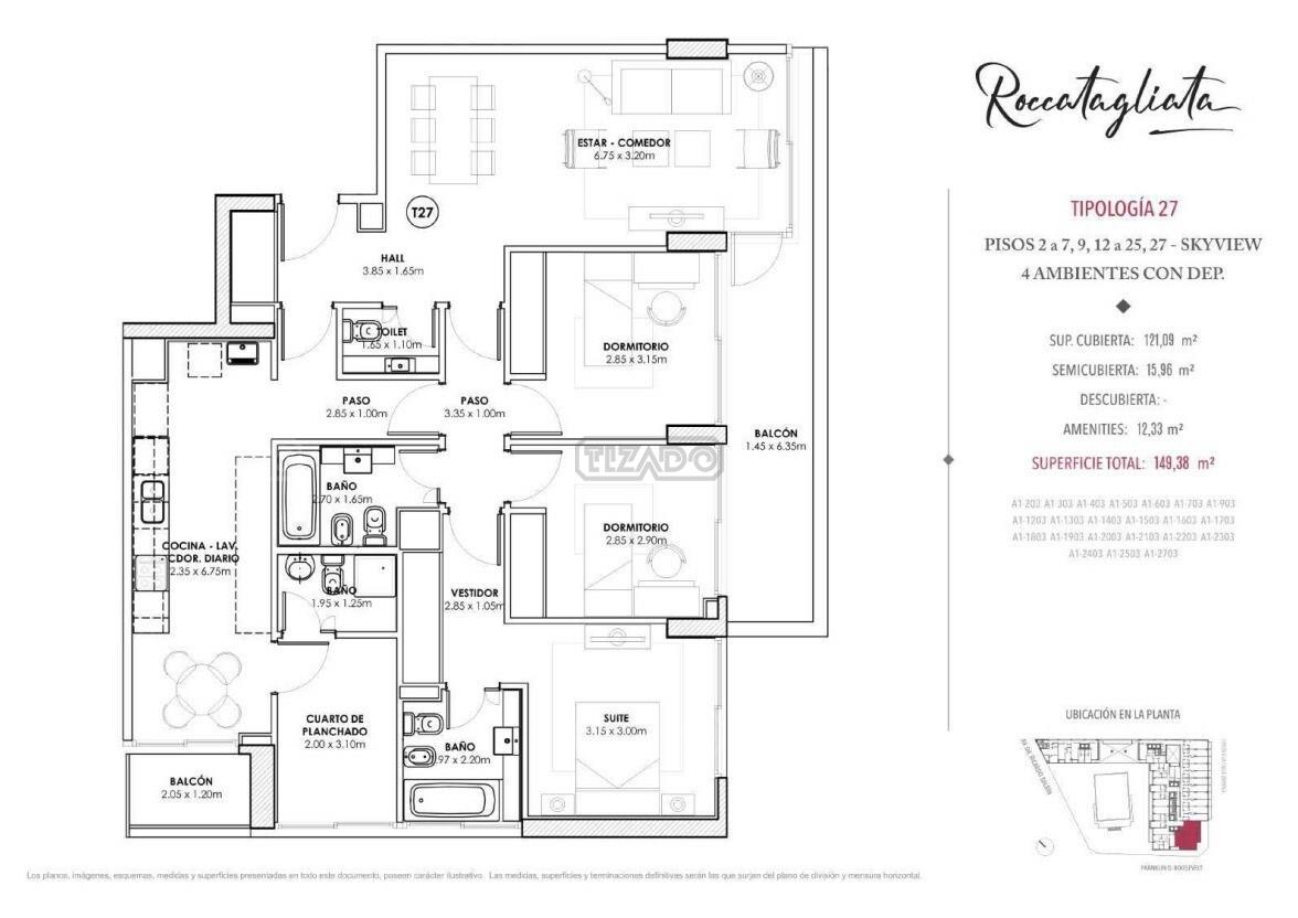 PALACIO ROCCATAGLIATA AV. BALBÍN esq. F. ROOSEVELT, COGHLAN, C.A.B.A. DOS TORRES: Torre Palace: 12 pisos & Torre Sky View: 27 pisos - de 45 a 203m² COCHERAS Y BAULERAS OPCIONALES PALACIO ROCCATAGLIATA es un complejo compuesto por un bloque de 12 pisos y una torre de 27 pisos y 3 subsuelos, con diversas tipologías de unidades de vivienda. Amenities premium - Cocheras opcionales. Se destaca la imponente presencia de la casona de la familia Roccataglita, que tras ser íntegramente restaurada muestra todo su esplendor. También comprende un área de locales comerciales. sobre la calle Zapiola. Unidades residenciales de 1 a 4 ambientes con dependencia, cocheras y bauleras. Amenities Interiores: Gimnasio, Vestuarios, Cava de vinos, Spa/Sauna seco y húmedo, Sal de reuniones, Cocheras de cortesía, Seguridad privada, Kids club, Laundry, Bicicleteros. Amenities Exteriores: Sky club, Juegos para niños, Gimnasio en terraza, Terrazas accesibles, SUM con expansión, SUM in/out, Solarium, Sector parquizado, Piscina para niños y adultos. 28 pisos - 45.000 m² Locales comerciales sobre Zapiola Bienvenidos a Roccatagliata, un emprendimiento único que redefine el concepto de residencia premium en la ciudad. Ubicado en Roosevelt 3141, en el corazón de Coghlan. Roccatagliata es mucho más que un conjunto de viviendas; es un oasis de lujo y exclusividad diseñado para aquellos que buscan un estilo de vida sofisticado y contemporáneo. Concebido cuidadosamente en cada detalle para ofrecer una experiencia única, fusionando el confort moderno con la elegancia clásica de un Palacio nacido en 1900. Desde la majestuosidad de su arquitectura hasta la calidad de sus terminaciones, Roccatagliata se erige como un símbolo de distinción y buen gusto en un nuevo estándar de vida. Se trata de un conjunto edilicio formado por un bloque de 12 pisos, más una torre de 27 pisos y 3 subsuelos, que aloja diversas tipologías de unidades de vivienda, cocheras, bauleras, locales de servicios generales, amenities, hall de acceso peatonal con jardines perimetrales, área para locales comerciales, terraza con solárium y piscina, unidad de encargado, azotea y salas de máquinas. El conjunto se organiza mediante múltiples núcleos de circulación vertical con palieres que conectan las unidades de vivienda con el lobby de acceso, cocheras y demás áreas comunes. Se respeta la antigua residencia de la Familia Roccatagliata, por estar dentro del patrimonio histórico de la ciudad y se la incorpora a la red urbana por medio de su puesta en valor. CARACTERÍSTICAS GENERALES DEL CONJUNTO Hall de acceso peatonal con marquesina y área ajardinada. Cabina de seguridad - control de acceso. Entrada y salidas vehiculares independientes desde los subsuelos de estacionamientos. Lobby en doble altura con frente vidriado, doble puerta de acceso, pisos de mármol o granito natural y revestimiento de espejo y/o madera y acero inox. Cámara transformadora de compañía prestadora de energía eléctrica (sujeto a aprobación de factibilidad). Acceso para discapacitados en cumplimiento con la ley de “Accesibilidad Física para Todos”. Baterías de ascensores con cabinas revestidas en acero inoxidable y espejo de amplias dimensiones, con botonera digital e indicador de piso en cabina. Puertas automáticas de acero inoxidable en PB y chapa pintada en palieres. Subsuelos / Estacionamientos / Recintos para medidores eléctricos y de gas / Sala de termotanques / Tanques de reserva e incendio / Sala para compactador / Sala para garajista y para ayudante de portería con sanitarios Sector para cava de vinos / Sistema de ventilación mecánica y renovación de aire reglamentario en estacionamiento / Baños en estacionamiento. / Sala para laundry / Bauleras o espacios de guardado / Espacio para grupo electrógeno / Sistema de espiras internas para control de tránsito vehicular entre niveles. / PISO 1° Unidades de vivienda. / Mono ambientes y departamentos de 1, 2 y 3 dormitorios. Vivienda de encargado. PISO 2° y 3° Unidades de viviendas. / Mono ambientes y departamentos de 1, 2 y 3 dormitorios. PISO 4° a 6° Unidades de viviendas. / Mono ambientes y departamentos de 1, 2 y 3 dormitorios. PISO 7° Unidades de viviendas. / departamentos de 1, 2 y 3 dormitorios. PISO 8° Unidades de vivienda de 1, 2 y 3 dormitorios. Gimnasio y terraza accesible parquizada. PISO 9° y 12° Unidades de viviendas 1, 2 y 3 dormitorios. PISO 13° Unidades de viviendas 1, 2 y 3 dormitorios. Solárium con piscina descubierta. PISO 14° a 27° Unidades de viviendas 1, 2 y 3 dormitorios.- AZOTEA Sky club / Sala de maquinas ascensores SE PREVERÁN LAS CANALIZACIONES PARA LOS SIGUIENTES SERVICIOS SIN PROVISIÓN DE EQUIPAMIENTO • Control de accesos y circuito cerrado de CCTV. • Servicio de telefonía interna directa desde cada unidad hacia la casilla de guardia y áreas comunes. • Sistema de detección de incendio en lugares a definir. (palieres, salas de máquinas y subsuelos) INSTALACIONES TERMICAS Y ELECTRICAS. Instalación Termomecánica y de calefacción Canalización, instalación de cañerías refrigerantes y acometidas eléctricas para la instalación de equipos de aire acondicionado frío-calor sistema de tipo Split o Multisplit, marca Daikin, Electra, LG, BGH o similar, con provisión e instalación de equipos (sujeto a disponibilidad al momento de la contratación). Extracción mecánica de sanitarios con conductos de chapa. Ventilación mecánicamente las Salas de Tableros, Salas de Bombas, Depósitos, Salas de Máquinas de Ascensores y demás locales de Servicio de los Subsuelos. Las cocheras contarán con la ventilación mecánica reglamentaria. Instalación Eléctrica Cañería y cables reglamentarios, doble circuito eléctrico por unidad separando el circuito de tomas con el de iluminación, tablero con llaves térmicas y disyuntor diferencial (marcas SICA, ABB TUBIO o equivalente), según reglamentación de la Cía. Proveedora del servicio eléctri