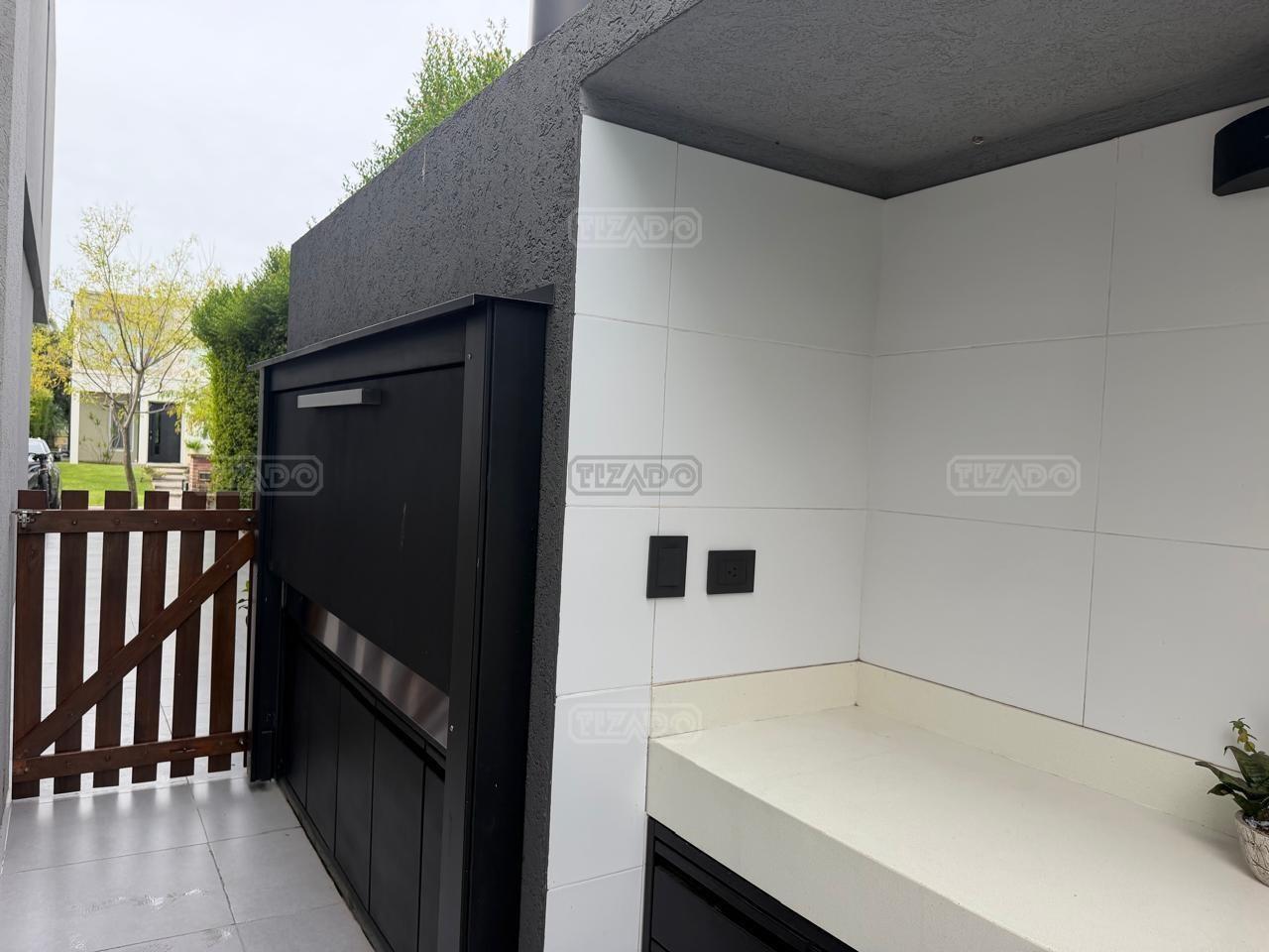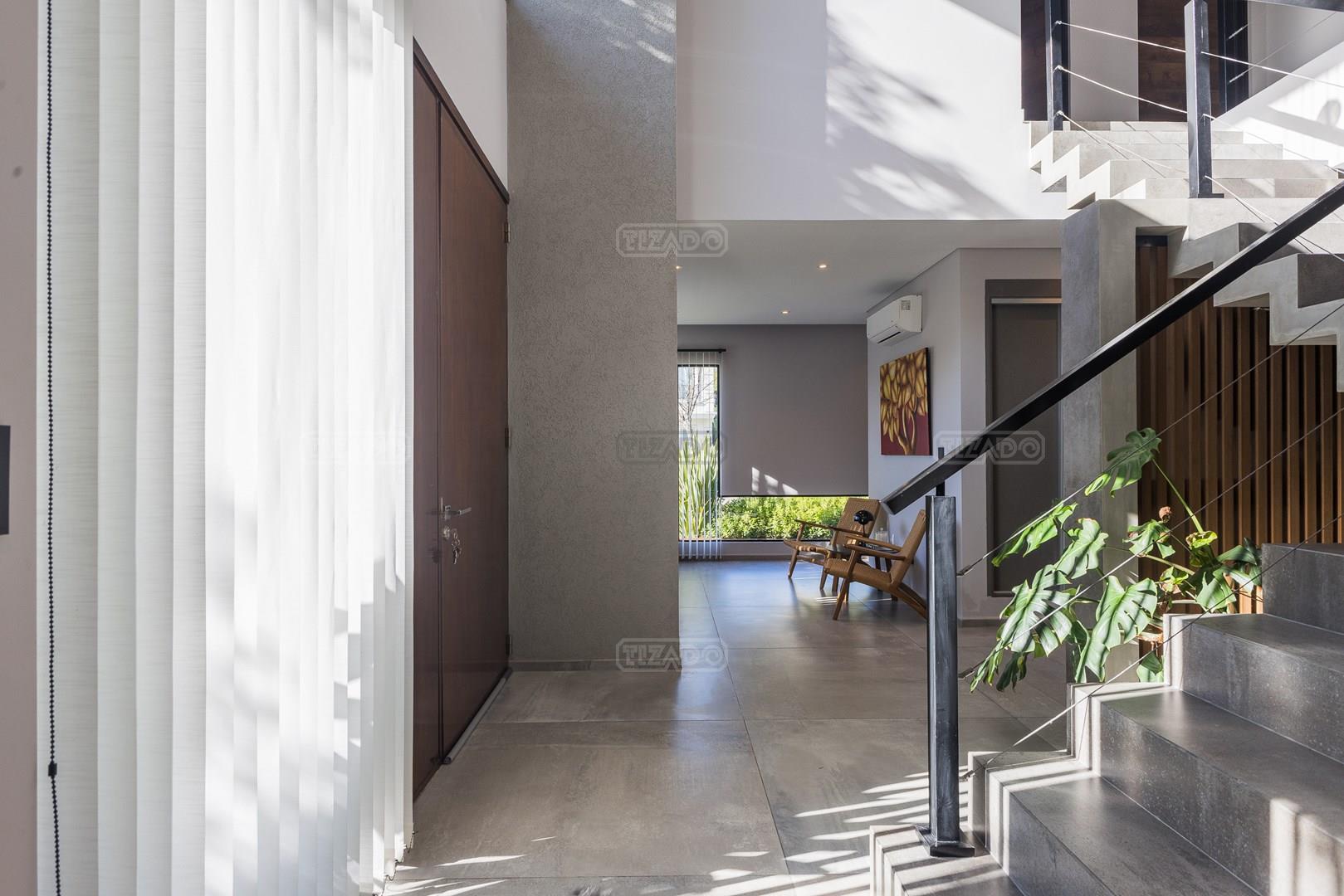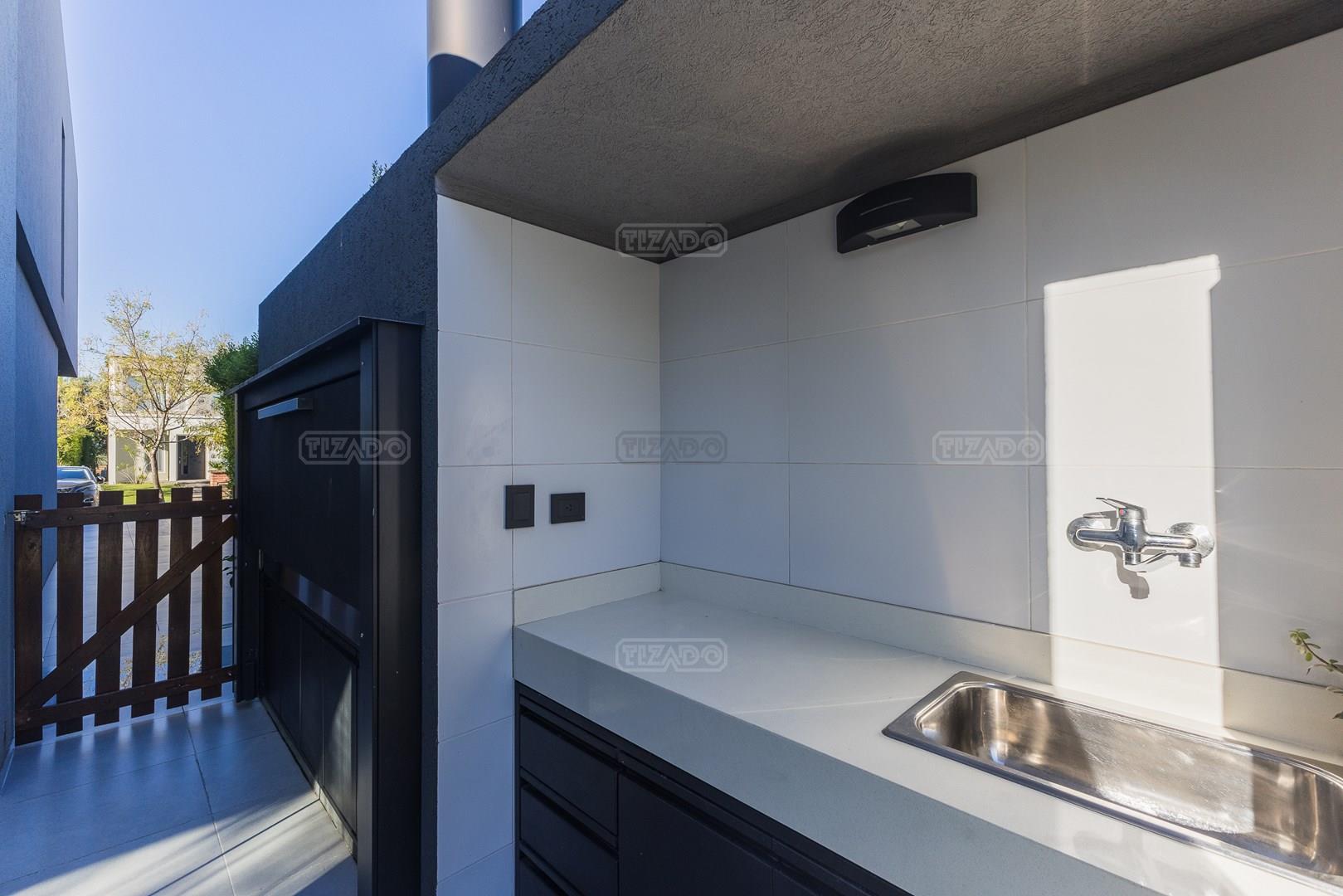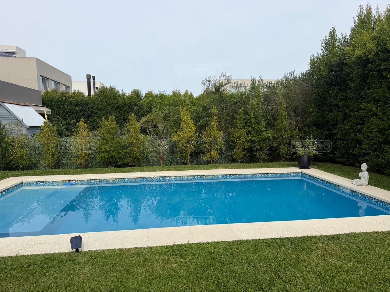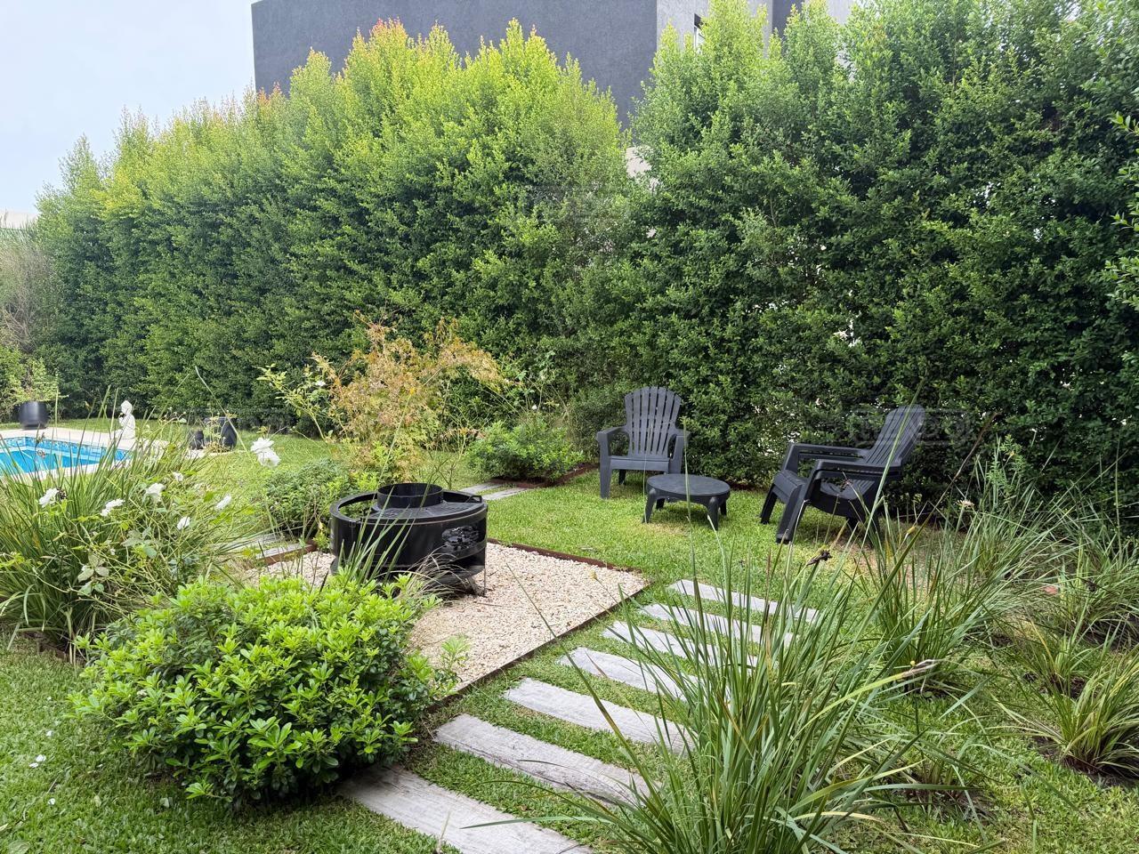 Casa en esquina, muy bien ubicada y de acceso rápido desde la guardia del Barrio. Es una casa realizada con materiales y terminaciones de inmejorable calidad sobre lote con orientación sudoeste. Entras con el cepillo de dientes. PB: amplio hall de entrada de doble altura que acompaña el desarrollo de la escalera, toilette y sector de escritorio abierto; el estar comedor, la cocina y el comedor diario se encuentran integrados; la cocina cuenta con isla, y en la galeria integrada por un vidrio reiki, se encuentra el lavadero y despensa. La galería tiene amplias dimensiones, y cuenta sobre su lateral con parrilla y pileta de lavar con mesada. PA: 3 dormitorios, ppal en suite con vestidor, baño con box de ducha y amplia terraza; dos dormitorios con placard y un baño completo. La casa está asentada sobre una platea de importante espesor (incluidos estacionamiento de autos y acceso vehicular) y la estructura es de hormigón armado, así como la pileta, revestida, con luces y filtro automático. Terminaciones: Carpintería exterior con DVH. Importante puerta de entrada Rosbaco al igual que todas las puertas interiores. Mesadas de cocina, baños y sector parrilla de Silestone. Muebles de cocina, placards y vestidor Johnson. Horno y anafe Longvie de última generación. Artefactos sanitarios Ferrum y grifería FV. Finísima yeseria artesanal en paredes y cielorrasos . Aires Acondicionados en los ambientes. Piso radiante de 5 circuitos (inclusive en galería) con caldera Baxi Eco-3 de alto rendimiento. Revestimiento exterior Revear. Parquización con gramma y riego automático. Cuenta con un espacio de fogonero en el exterior. Es impecable, digna de ver!