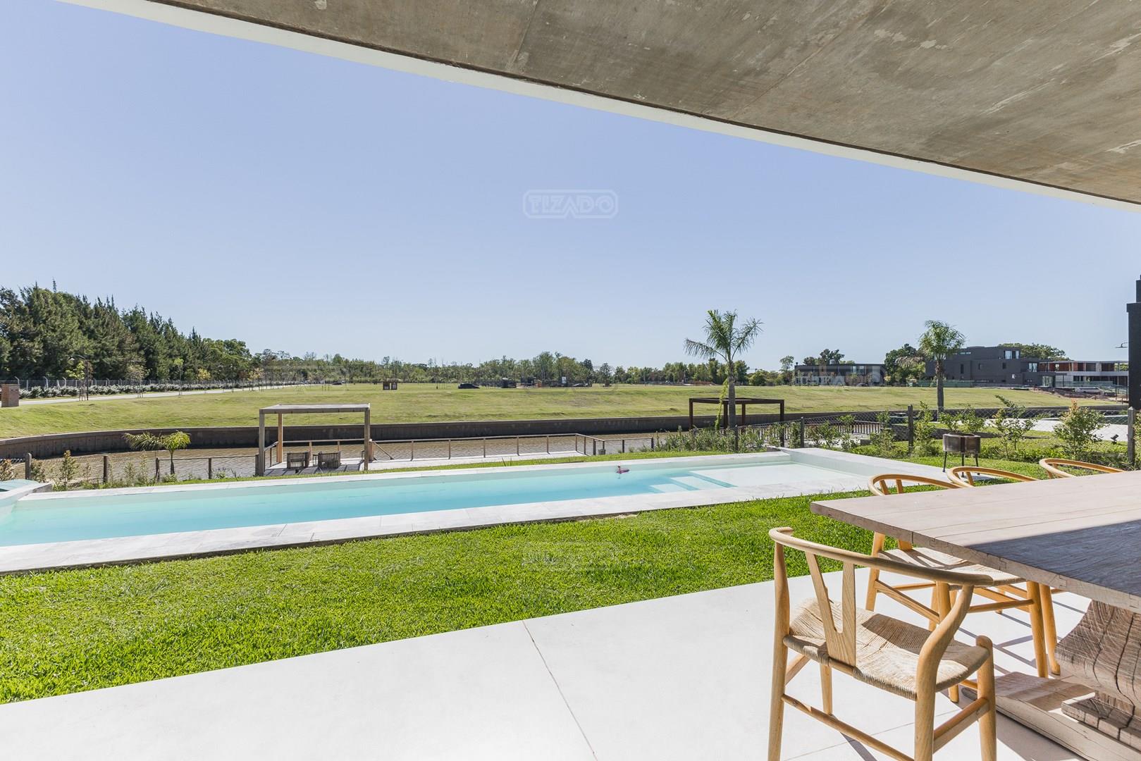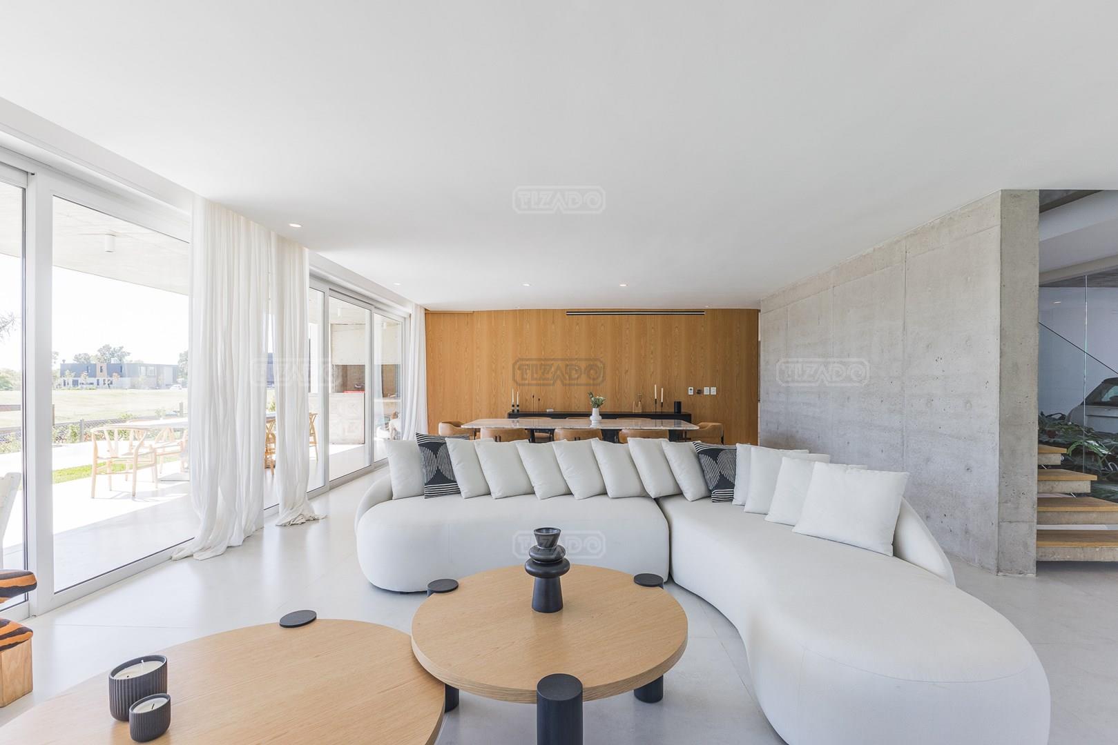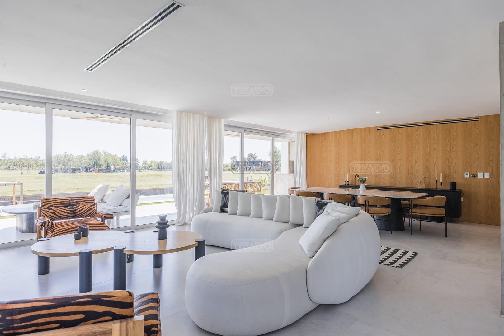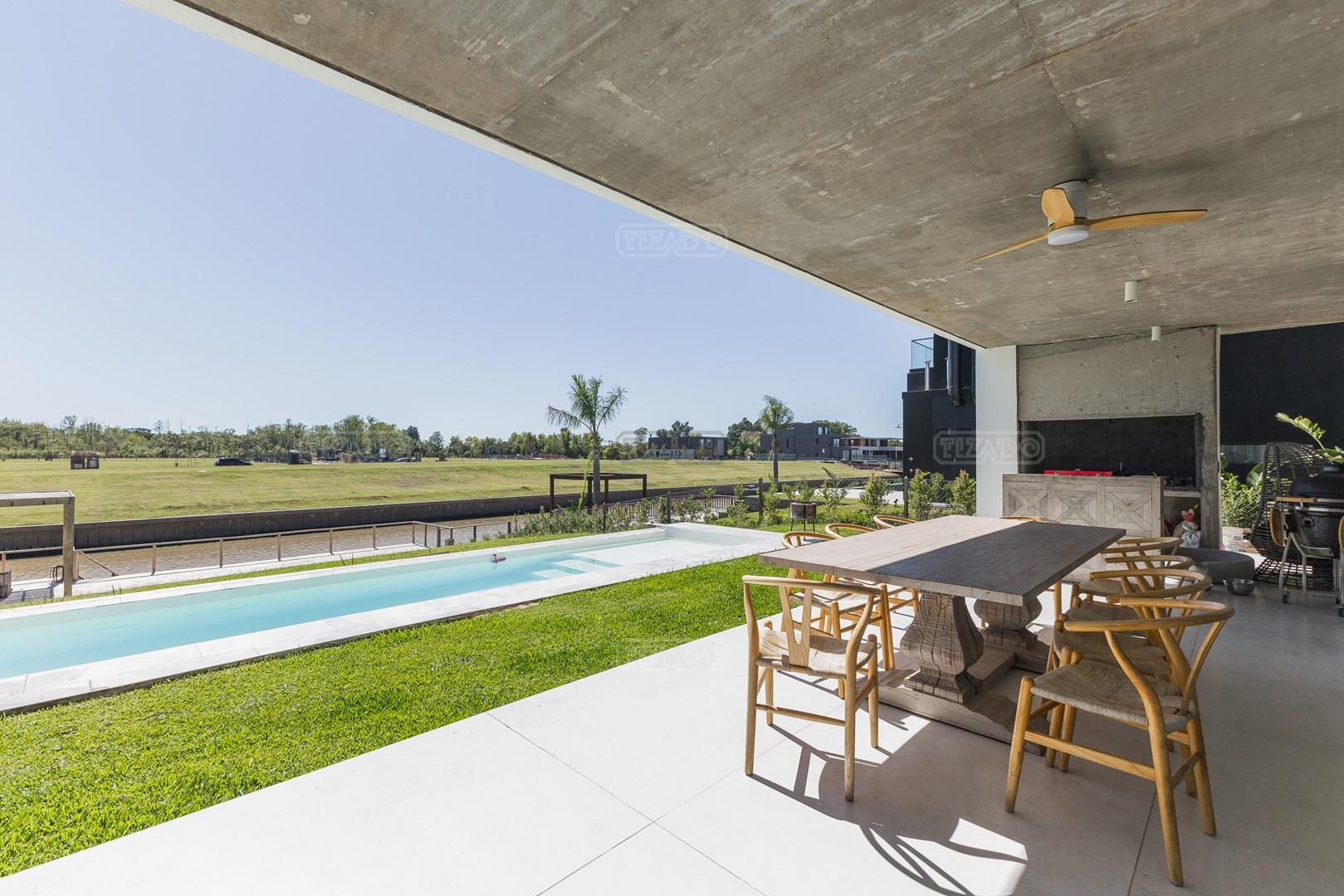 Excelente casa prácticamente a estrenar!!! Muy buena ubicación dentro del barrio, frente a un espacio verde lo que le otorga mayor privacidad con respecto a los vecinos Se vende totalmente equipada y amoblada!!!! PB: espacio al frente para varios autos, dos cocheras cubiertas. Se accede por un amplio hall de entrada, toilette, escritorio, estar comedor apaisado con grandes ventanales al jardín y al agua, cocina con comedor diario, muy bien equipada: muebles Johnson termoformados , electrodomésticos Bosch con wifi, panelables, alemanes y amplio lavadero, dependencia de servicio con baño completo con posibilidad de usar como baño de pileta. PA: 4 dormitorios: ste principal con amplio vestidor y baño con bañera y dos duchas, 3 suites junior con vestidor y baño completo, todos con vista al agua¡¡, escritorio o posible 5to dormitorio. Ultimo piso: gran playroom con baño completo muy amplio. y gran terraza. Sala de máquinas Pileta de 13mx3m con borde infinito, jardín parquizado con cerco verde perimetral, variedad de plantas y riego automatizado con wifi, muelle de lapacho de 14mx4m con pérgola de 4m X 4m Detalles técnicos: calefacción por losa radiante con 3 calderas de condensación Baxi italiana, agua caliente al instante con Boiler de 300lts más las calderas. Grifería PB Hansgrohe alemana y en PA marca Roca española, aberturas DVH y PVC KÖNIG Group, pisos de porcelanato de 2,40mx1,20m, puertas Moras, en planta baja roble americano, arriba laqueadas blancas Se entrega con la galería cerrada con vidrio y con calefacción¡