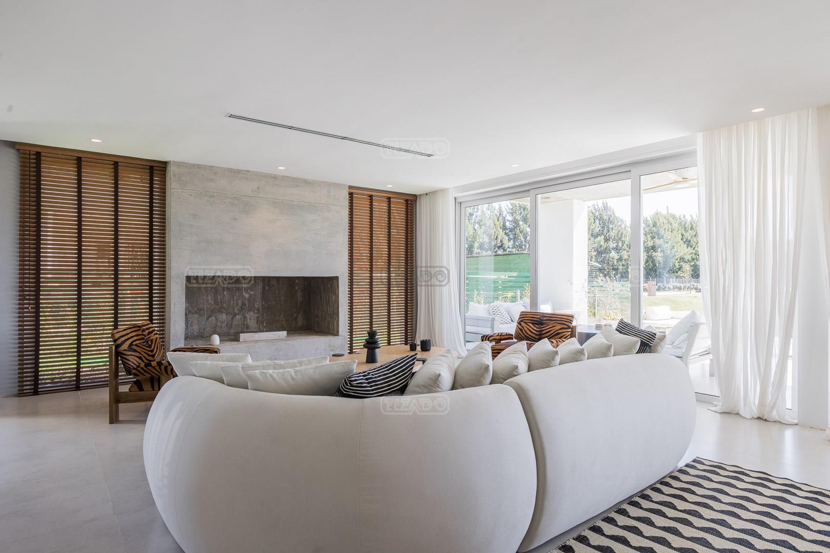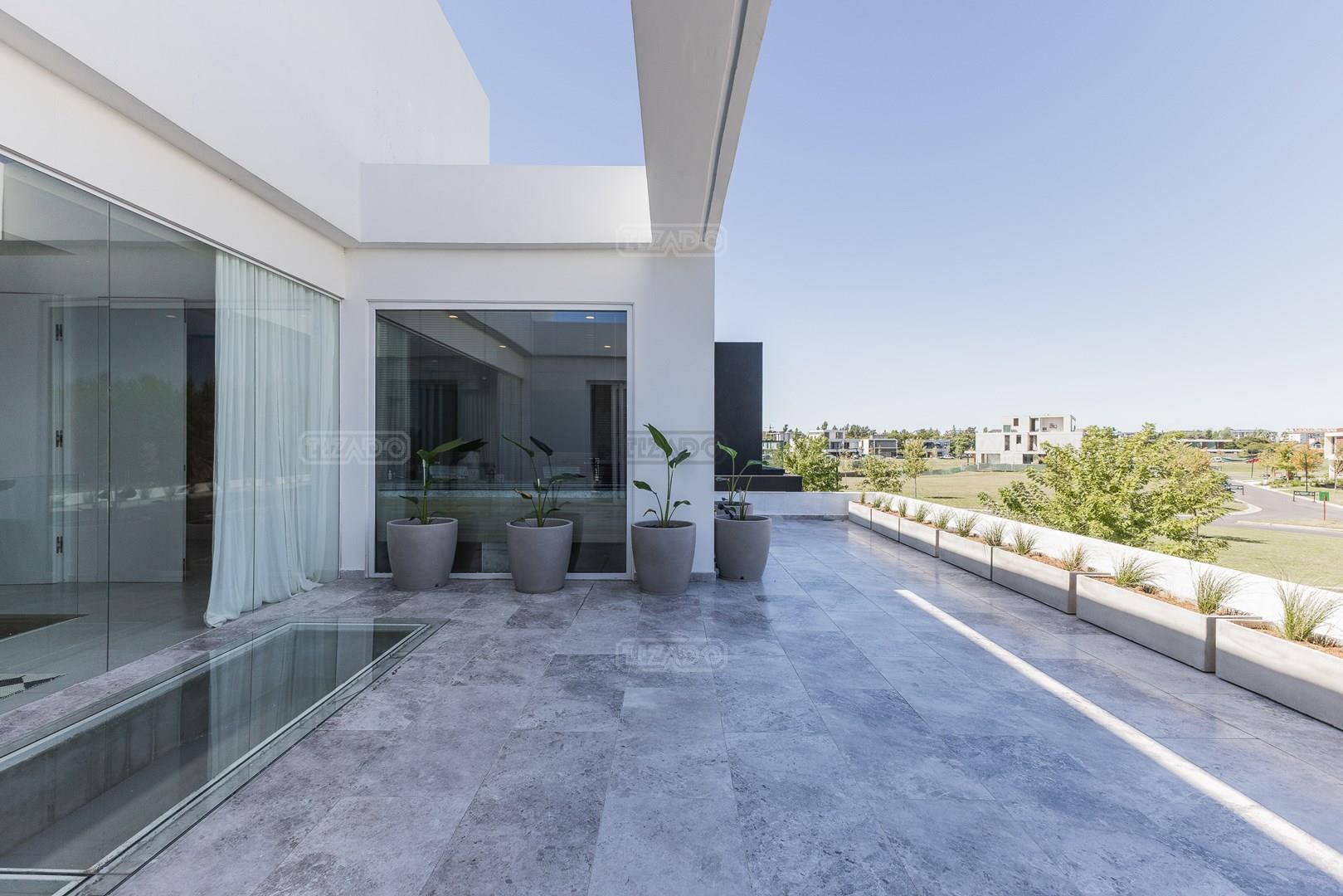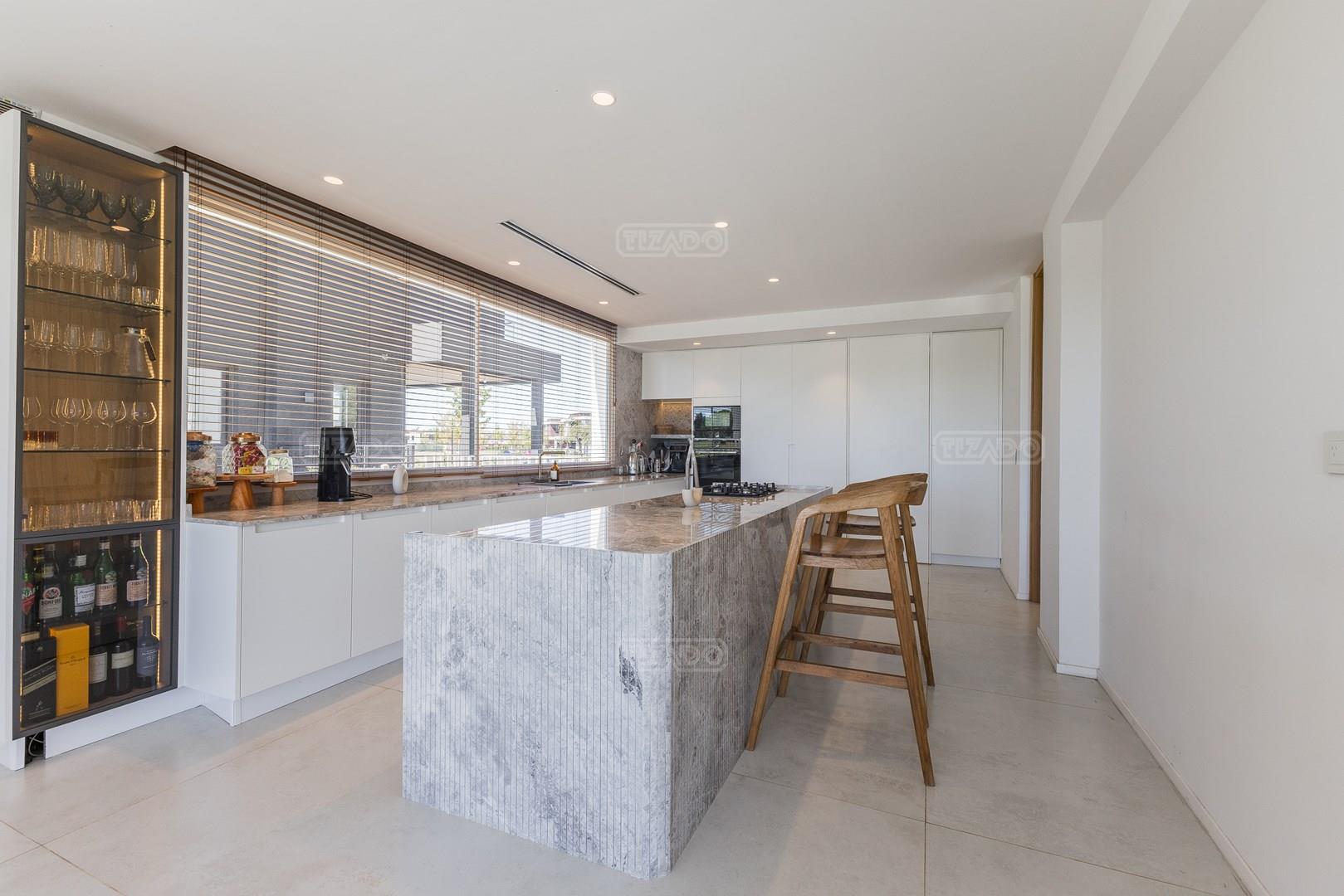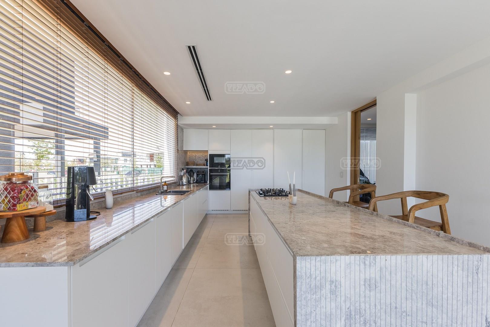 Excelente casa prácticamente a estrenar!!! Muy buena ubicación dentro del barrio, frente a un espacio verde lo que le otorga mayor privacidad con respecto a los vecinos Se vende totalmente equipada y amoblada!!!! PB: espacio al frente para varios autos, dos cocheras cubiertas. Se accede por un amplio hall de entrada, toilette, escritorio, estar comedor apaisado con grandes ventanales al jardín y al agua, cocina con comedor diario, muy bien equipada: muebles Johnson termoformados , electrodomésticos Bosch con wifi, panelables, alemanes y amplio lavadero, dependencia de servicio con baño completo con posibilidad de usar como baño de pileta. PA: 4 dormitorios: ste principal con amplio vestidor y baño con bañera y dos duchas, 3 suites junior con vestidor y baño completo, todos con vista al agua¡¡, escritorio o posible 5to dormitorio. Ultimo piso: gran playroom con baño completo muy amplio. y gran terraza. Sala de máquinas Pileta de 13mx3m con borde infinito, jardín parquizado con cerco verde perimetral, variedad de plantas y riego automatizado con wifi, muelle de lapacho de 14mx4m con pérgola de 4m X 4m Detalles técnicos: calefacción por losa radiante con 3 calderas de condensación Baxi italiana, agua caliente al instante con Boiler de 300lts más las calderas. Grifería PB Hansgrohe alemana y en PA marca Roca española, aberturas DVH y PVC KÖNIG Group, pisos de porcelanato de 2,40mx1,20m, puertas Moras, en planta baja roble americano, arriba laqueadas blancas Se entrega con la galería cerrada con vidrio y con calefacción¡