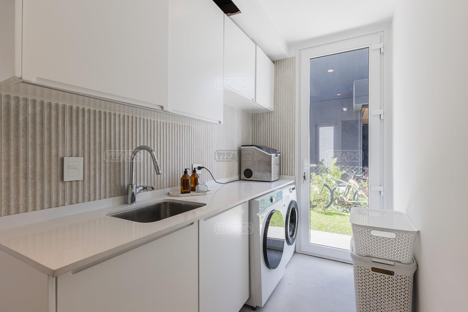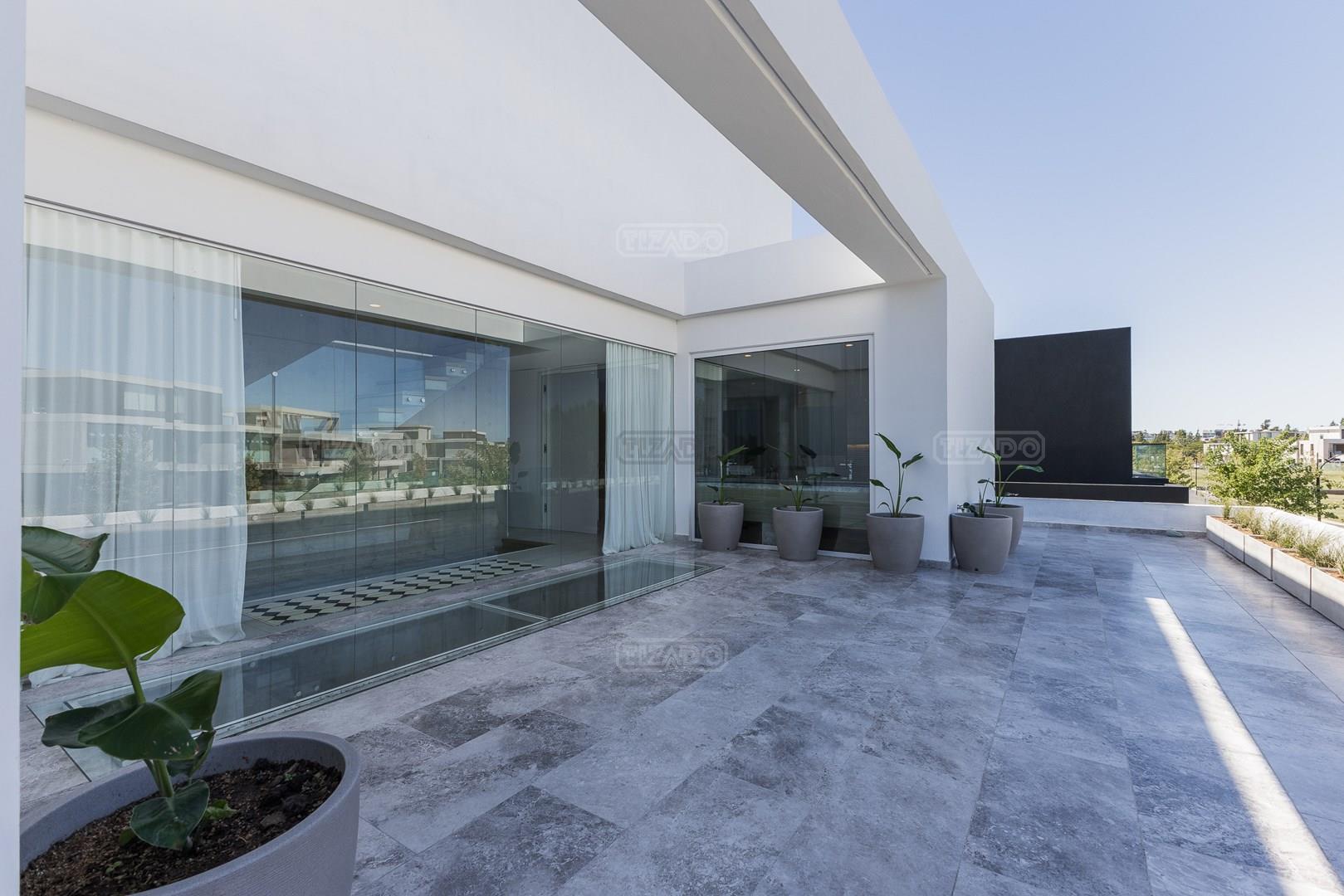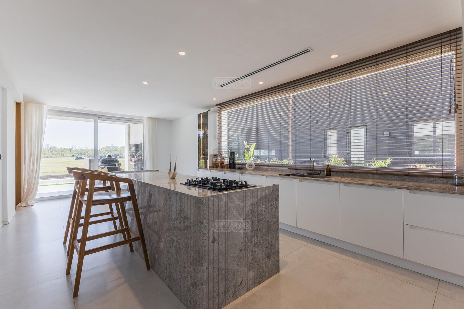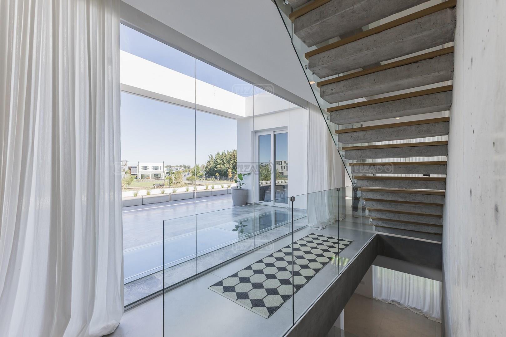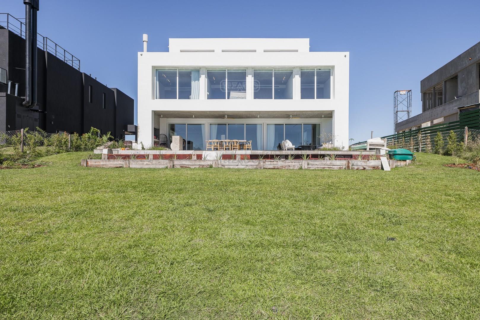 Excelente casa prácticamente a estrenar!!! Muy buena ubicación dentro del barrio, frente a un espacio verde lo que le otorga mayor privacidad con respecto a los vecinos Se vende totalmente equipada y amoblada!!!! PB: espacio al frente para varios autos, dos cocheras cubiertas. Se accede por un amplio hall de entrada, toilette, escritorio, estar comedor apaisado con grandes ventanales al jardín y al agua, cocina con comedor diario, muy bien equipada: muebles Johnson termoformados , electrodomésticos Bosch con wifi, panelables, alemanes y amplio lavadero, dependencia de servicio con baño completo con posibilidad de usar como baño de pileta. PA: 4 dormitorios: ste principal con amplio vestidor y baño con bañera y dos duchas, 3 suites junior con vestidor y baño completo, todos con vista al agua¡¡, escritorio o posible 5to dormitorio. Ultimo piso: gran playroom con baño completo muy amplio. y gran terraza. Sala de máquinas Pileta de 13mx3m con borde infinito, jardín parquizado con cerco verde perimetral, variedad de plantas y riego automatizado con wifi, muelle de lapacho de 14mx4m con pérgola de 4m X 4m Detalles técnicos: calefacción por losa radiante con 3 calderas de condensación Baxi italiana, agua caliente al instante con Boiler de 300lts más las calderas. Grifería PB Hansgrohe alemana y en PA marca Roca española, aberturas DVH y PVC KÖNIG Group, pisos de porcelanato de 2,40mx1,20m, puertas Moras, en planta baja roble americano, arriba laqueadas blancas Se entrega con la galería cerrada con vidrio y con calefacción¡