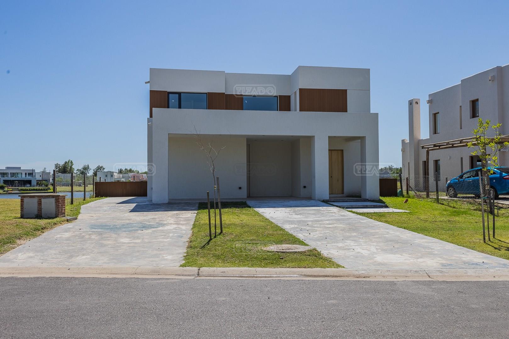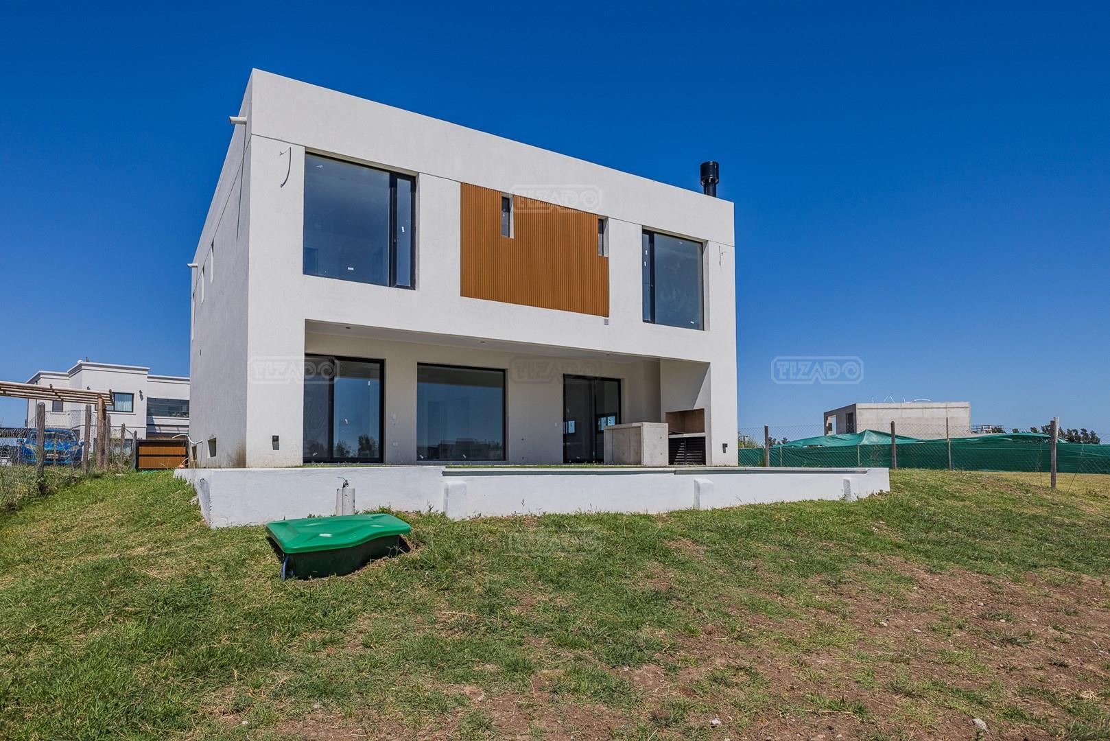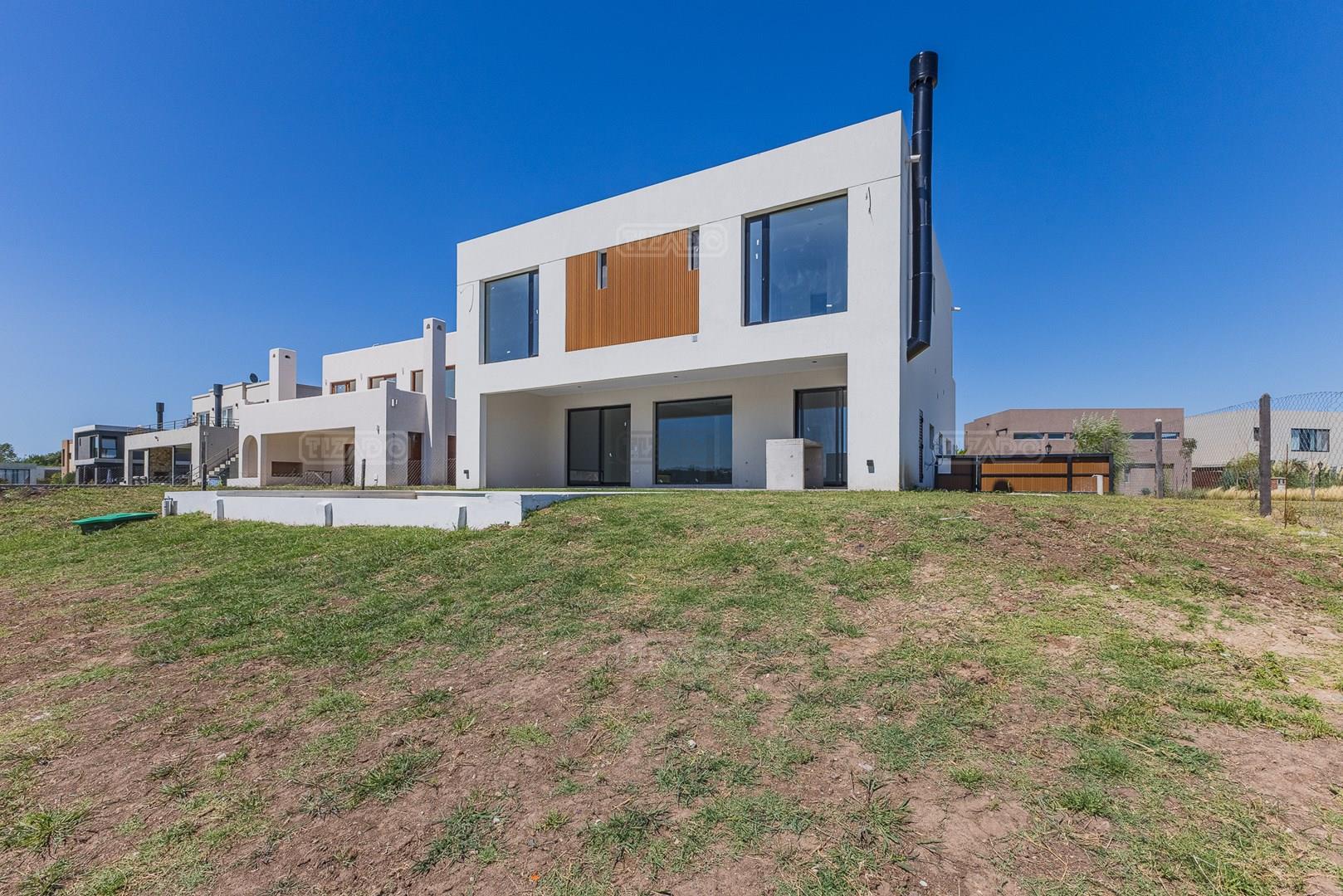 Moderna casa de lineas rectas a la laguna de Santa Ana. PB recepción, gran living con hogar, comedor y cocina integrada, toilette. Lavadero. Escritorio o dormitorio de huéspedes con baño completo (o dependencia de servicio) con entrada independiente. PA 4 dormitorios, principal en suite, otros 3 dormitorios comparten un baño. Exterior, gran galeria con parrilla con frente de chapa tipo guillotina, parque y piscina de borde infinito Aberturas de PVC simil madera con DVH y mosquiteros. Calefacción por losa radiante, preinstalacion de AA en todos los ambientes, Incluye frentes e interiores de placard pisos porcelanato de 60x120 en PB y pisos de porcelanato simil madera de 19x115 en PA Mesadas de silestone White Stone Quartz en cocina y lavadero, Blanco Norte en baño suite y chicos. Mesada Negro Brasil Leather en parrilla. Mampara en duchas baño suite de planta alta. Vanitorys en todos los baños excepto en el toilette. Muebles de cocina bajo mesadas con alacenas e isla en blanco laqueados. Horno eléctrico Whirpool, Anafe a gas marca Whirpool. Campana en cocina marca TST. Jardín nivelado. Estacado a laguna con quebrachos. Tanque cisterna de 3.500 lts de capacidad. Bomba presurizadora marca Espa. Caldera dual Baxi. Pileta de 3.5x7 con desborde infinito en el ancho, solado y luces, revestida con venecitas. Equipo de filtrado marca Vulcano. Accesos peatonales y vehiculares en hormigón alisado. Cochera cubierta para 2 autos, estacionamiento sin techar para 4 autos.