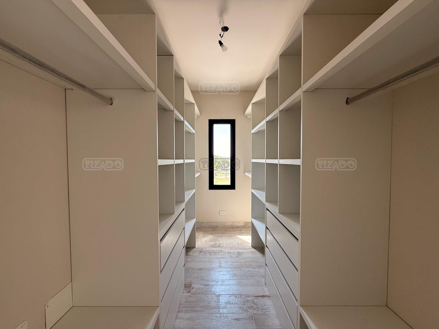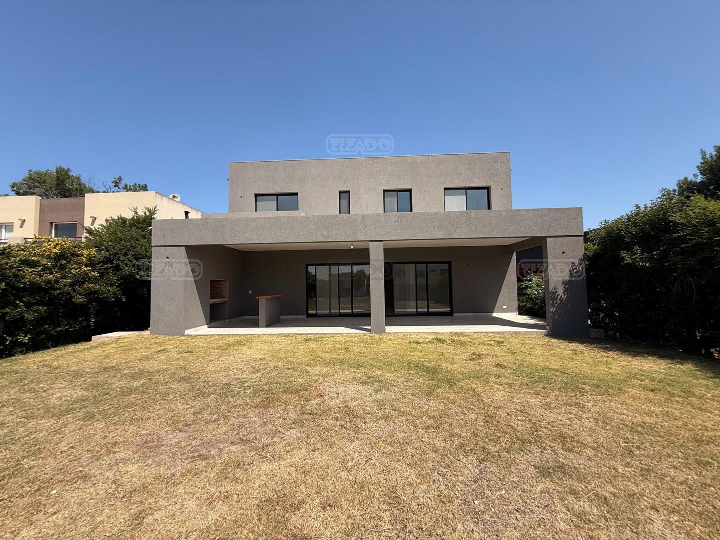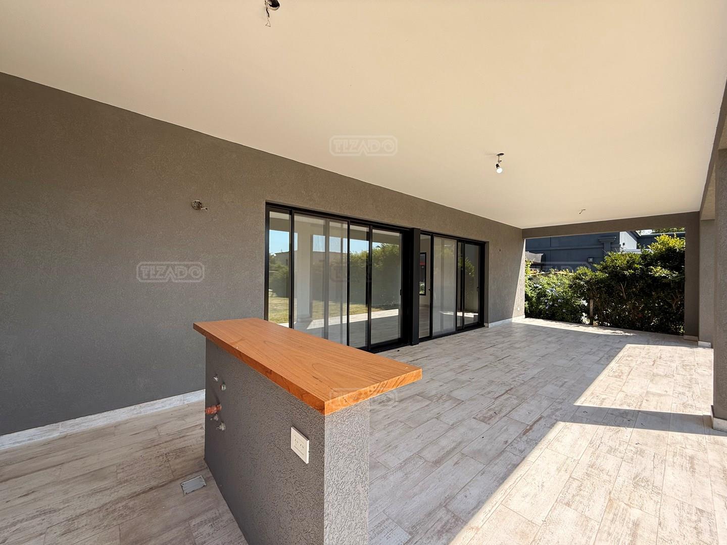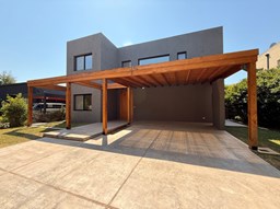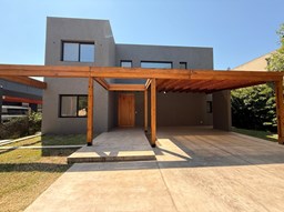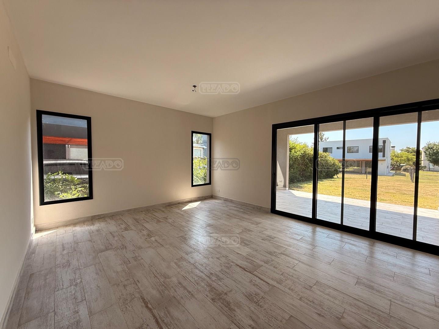 Casa en venta en Santa Guadalupe – Pilar del Este Propiedad desarrollada en dos plantas sobre lote interno, con muy buena calidad constructiva y distribución funcional. Ingreso por cochera cubierta para dos vehículos y entrada de hormigón. En planta baja cuenta con hall de recepción de amplias dimensiones, living comedor integrado con isla, cocina equipada con mesadas de Silestone blanco, alacena, muebles bajo mesada, horno empotrado y anafe. Lavadero con entrada independiente y baulera bajo escalera, toilette de recepción y escritorio. En planta alta, hall íntimo de distribución, playrrom o sala de estar, dormitorio principal en suite con vestidor doble y dos dormitorios secundarios con baño completo compartido. En el exterior, galería con isla y parrilla, jardín. Detalles constructivos: pisos de porcelanato símil madera, aberturas de aluminio con DVH, calefacción por losa radiante electrica, techo de losa y griferías FV. El barrio Santa Guadalupe cuenta con cuatro canchas de tenis, SUM, cancha de fútbol, sector de parrillas y despensa, además de seguridad y amplios espacios verdes.