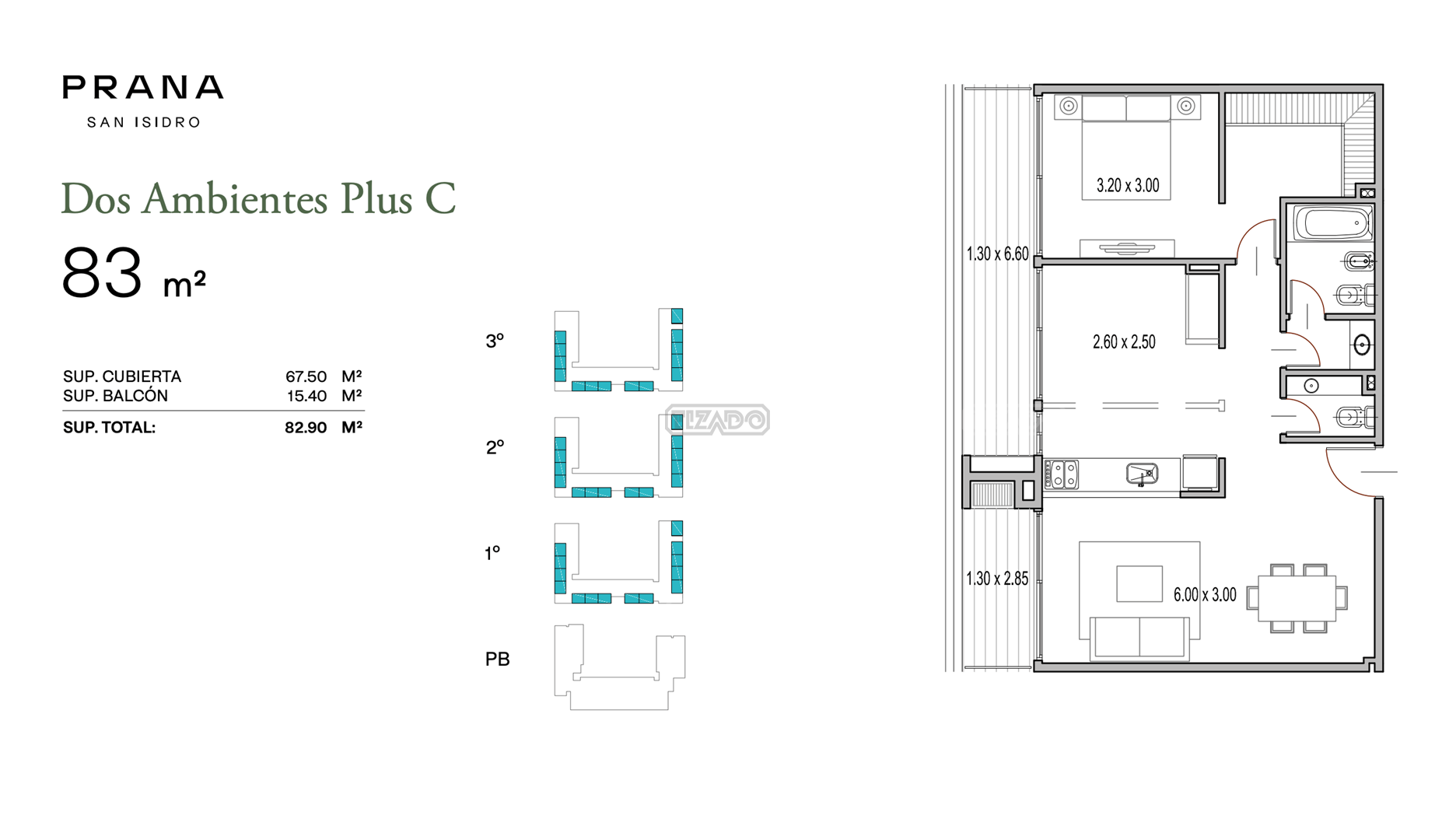 - Balcón: 6.60x1.30 / 2.85x1.30