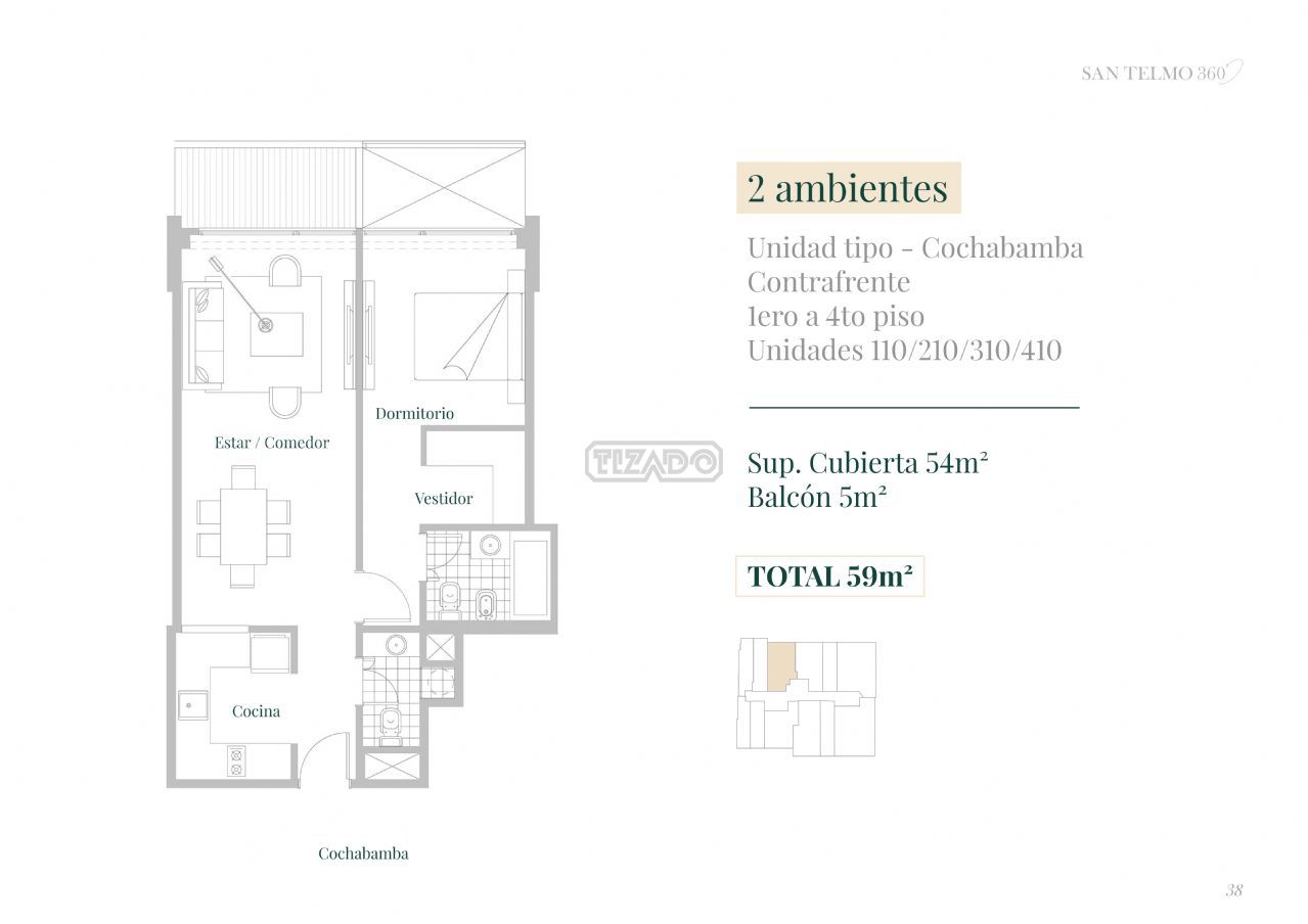 Excelente departamento de 2 ambientes en alquiler. Dormitorio en suite con vestidor. Toilette, cochera en 2 SS Incluida! y baulera. Ubicación preferencial en el distrito de las Artes. Vigilancia 24 hs. . Amenities · Zona recreativa planta baja. · Salón de usos múltiples. · Sector de juegos infantiles al aire libre. · Parrillas. · Parque planta baja. · Gimnasio - Fitness Center. · Sala de masajes - Sauna Seco. · Hidromasaje indoor. · Amplios pasillos y corredores. . Rooftop con visuales únicas en la zona. . Piscina exterior, con vista panorámica de la ciudad, solárium y amplia terraza verde 150m2. Justo ahí donde se combinan el aire de barrio que ofrece la calle Cochabamba, con sus históricos empedrados que parecen detener el tiempo y la accesibilidad a medios de trasporte en las calles circundantes, el proyecto reúne dos aspectos fundamentales para la vida en la ciudad: conectividad y tranquilidad. Dentro del Distrito de las Artes, a metros de la plaza Dorrego junto con su encanto de fines de semana, y el pulmón del Parque Lezama, sede del Museo Histórico de la Ciudad. San Telmo es uno de los barrios más pintorescos de Buenos Aires envuelto en cultura y tradición a la vez que fomenta el desarrollo inmobiliario y artístico. 360 se sumerge en la calidez de este barrio ofreciendo el espacio para vivirlo y contemplarlo desde las amplias terrazas. Sin romper la armonía de la arquitectura colonial, el edificio aporta diseño y aire nuevo a la manzana, con su pórtico verde y permeable, y retirándose de la línea de edificación resguardando el acceso a las unidades y su privacidad. La unidad se alquila sin muebles. Edificio apto para personas con movilidad reducida. Matrícula Cucicba 1053