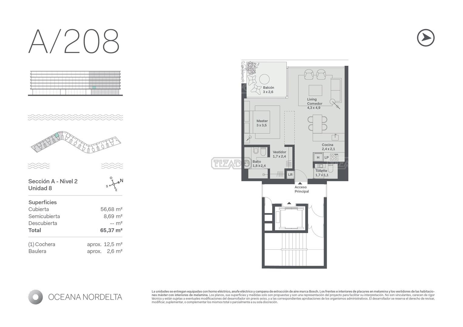 Desarrollos residenciales con un concepto en común: el agua y el arte. Oceana expresa los estándares de calidad de Consultatio: una locación única, construcción high-end y criterios de sustentabilidad. Exhibe ya dos desarrollos exitosos en Estados Unidos, localizados en Bal Harbour y Key Biscayne, y en Argentina estará presente en Puerto Madero y Nordelta. Una propuesta de vida diferente que busca redescubrir los espacios a través de nuevas formas de vinculación con sus entornos. Detalle de Terminaciones. Planta Baja – Niveles de Acceso – Plaza. - Acceso vehicular por calle exclusiva hasta el lobby de acceso residencial (drop-off). - Acceso vehicular a cocheras cubiertas con sistema de control de acceso a rampa y garita de seguridad. - Programa de arte en halles y circulaciones. - Halls amplios de acceso en doble altura con carpinterías de aluminio, pisos graníticos pulidos y revestimientos de primera calidad. Escalera monumental de vinculación a amenities de Subsuelo. - Estacionamientos de cortesía. - Jardin de acceso parquizado. - Muelle privado y mirador hacia la laguna. - Amenities en planta baja: dos salas de reuniones independientes. Baño y kitchenette privado. - Edificio implantado a 100m aproximadamente de la Av. Del Golf. Subsuelo. - Cocheras. Acceso y egreso vehicular por rampa. - Estacionamiento para bicicletas. - Acceso directo a los núcleos de circulación vertical. - Bauleras de las unidades. - Pileta climatizada cubierta. - Gimnasio con aparatos de última generación . - Sanitarios, Vestuarios y Duchas. - Salón de Usos Múltiples y Confiteria con cocina independiente y baños. - Salón de relax, yoga o spa, lounges y playrooms. - Sala de ensayos. - Laundry en cada sector. Características del Edificio. - Fachada combinada de revestimientos decorativos, vidrio y bandas de hormigón. Carpinterías de aluminio con doble vidriado acústica y térmica. - Pileta y solárium exterior. Senderos peatonales rodeando la laguna. - Palieres semi privados servidos por ascensores de última tecnología. - Energía de emergencia disponible para cada unidad (desde grupo electrógeno central). - Certificación sustentable, construcción sostenible, consumo de energía y de agua eficiente / sustentable. - Town houses en planta baja y primer piso tipo dúplex con 2 o 3 dormitorios, livings en doble altura. Terrazas / Jardines privados con parrilla, piletas y vista a la laguna. - Unidades pasantes con vistas este/oeste. Livings anchos y apaisados, terrazas al lago, terrazas con parrillas al Este. - Pent Houses y unidades tipo en los extremos del -edificio con amplias terrazas semicubiertas. - ½ km Loop de Joging “field Track”. Revestimiento de sanitarios. - Los baños principales serán revestidos en porcelanato y detalles de piedra natural o similar. - Los baños secundarios serán revestidos en porcelanato. Revestimiento de pisos y zócalos. - Todos los pisos de baños llevaran porcelanato. - El piso de palier irá en porcelanato. - Revestimiento interior de las unidades y exterior en balcones y terrazas ira en porcelanato. - Los zócalos serán de madera. Mesadas. - En cocinas se colocarán mesadas de Quarzo tipo silestone o similar con bacha de acero inoxidable. - En los Baños de dormitorios principales y secundarios serán mesadas de Quarzo tipo silestone o similar con muebles de apoyo. Artefactos, griferías y accesorios de baños. - Artefactos sanitarios y griferías de bajo consumo y buena calidad. Equipamiento de cocinas. - Los muebles de cocina de diseño contemporáneo. Materiales y herrajes de primera calidad. El equipamiento de cocinas estará constituido por los siguientes elementos: Un horno eléctrico, anafe eléctrico y campana de extracción de aire con filtros de aire con carbono activo. Se dejarán previstas las conexiones eléctricas, de agua corriente y desagüe, para la instalación de Lavavajillas bajo mesada. Se dejarán previstas las conexiones eléctricas, de agua corriente y desagüe, para la instalación de Lavarropas en mueble. Carpinterías. - Puerta de acceso principal de madera maciza de doble contacto. - Puertas placa de madera en interior de unidades de 2.30 m de altura. Instalaciones por Servicios Centrales. - Calefacción por piso radiante con control de temperatura individual por unidad. - Agua Caliente por caldera central. Aire Acondicionado. - Las unidades se entregan con sistema de aire acondicionado individual por volumen refrigerante variable (VRV) frio/calor con control de temperatura por ambiente. Closets. - Se entregaran frentes e interiores de placares