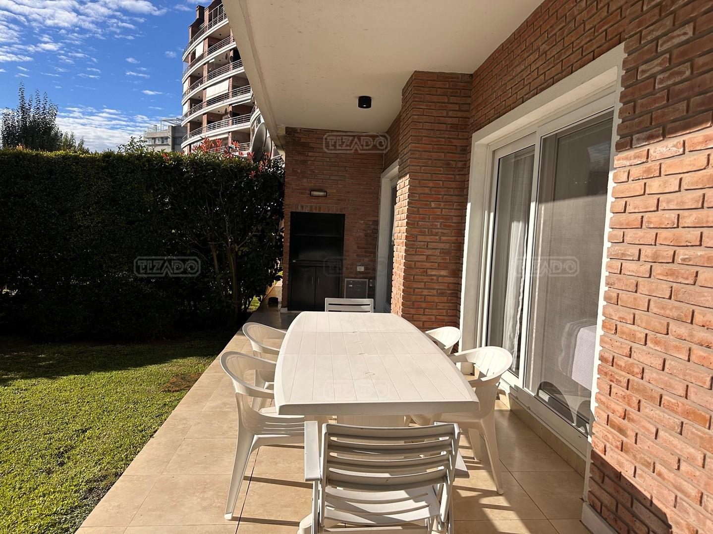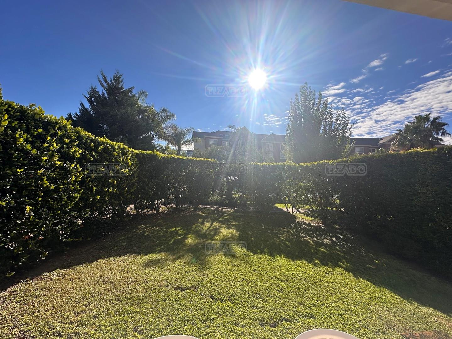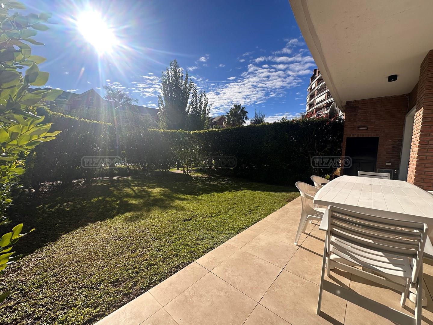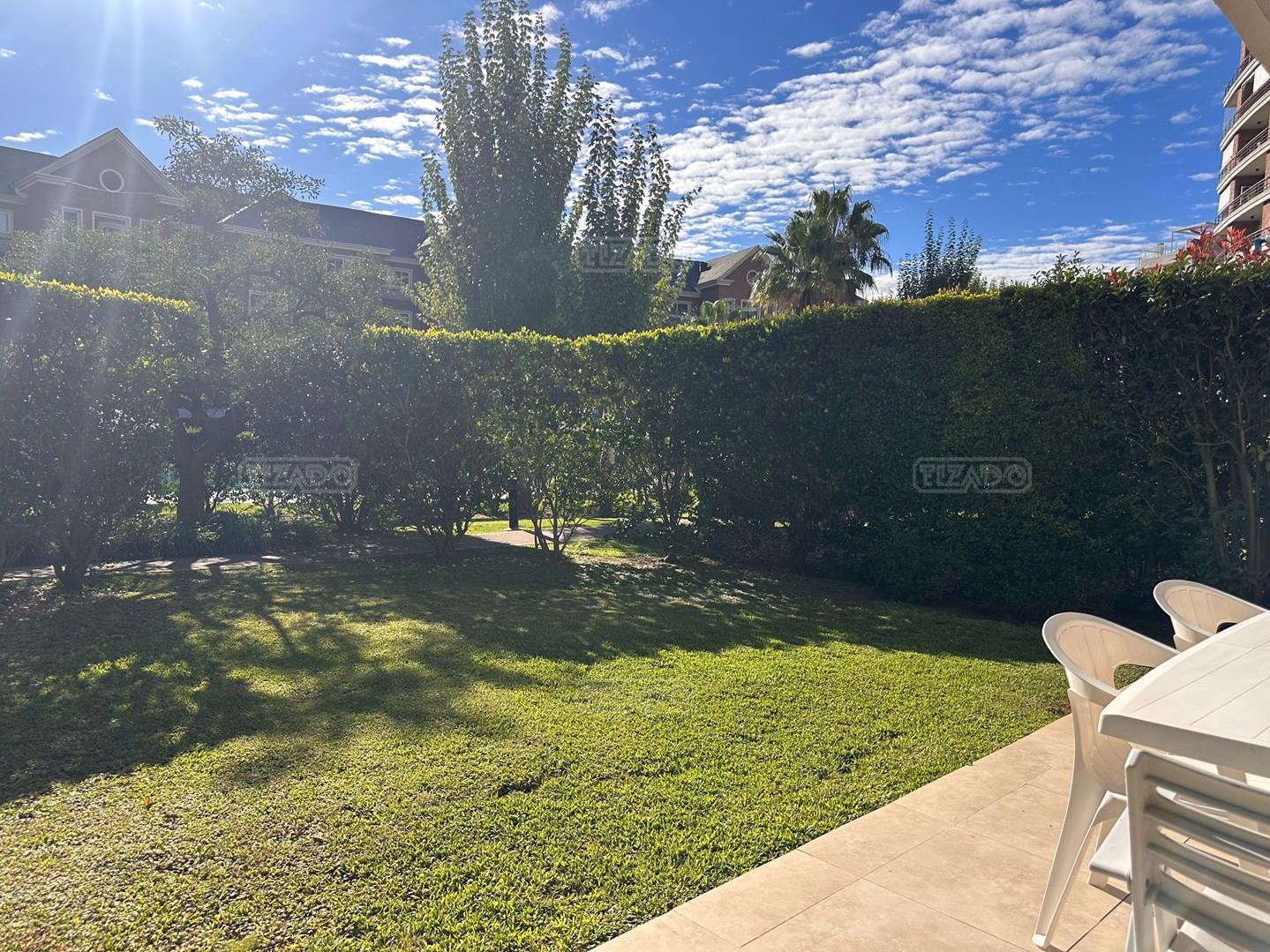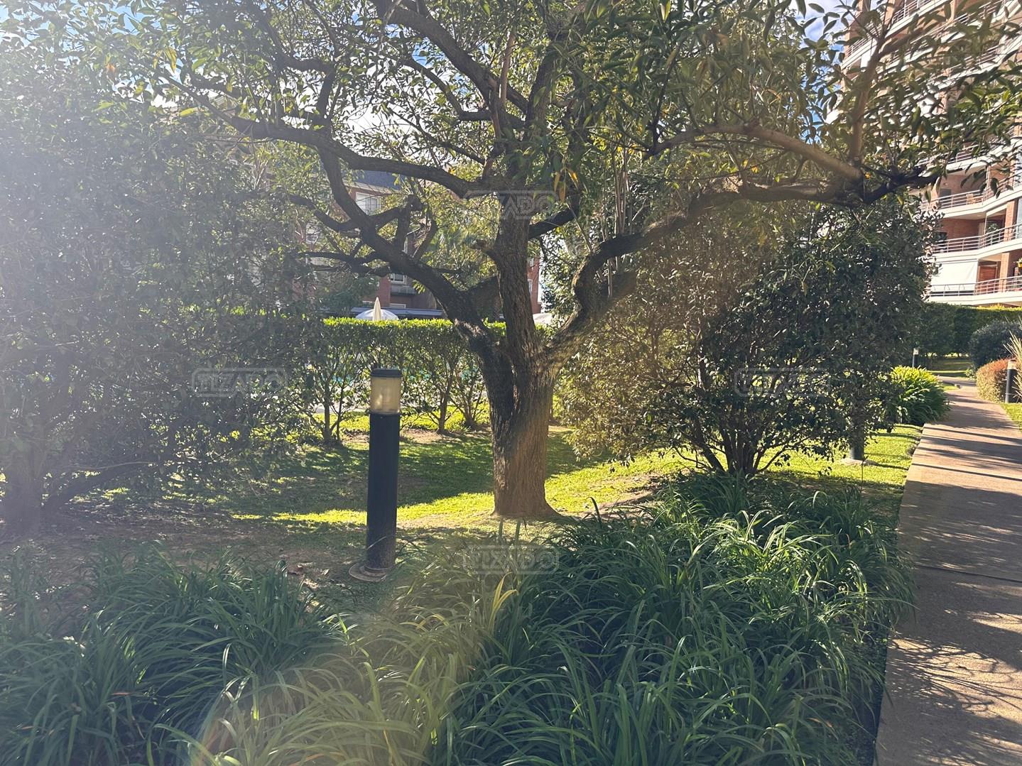 Miradores de la Bahía. Departamento con jardín propio. 3 amb más dependencia ( con baño completo). Ambientes: Living comedor +cocina independiente + Dos dormitorios en suite + dependencia + Toillete + galería con parrilla+ Jardín propio + Cochera subterránea Hermoso tres ambientes con jardín propio, orientación Norte Oeste sobre el jardín, tiene mucha luz natural. Su acceso al sector de amenities es peatonal, con salida directa desde el jardín. Miradores de la bahia es un complejo ya escriturado. Terminaciones: Tiene calefacción por losa radiante, 3 equipos de aire frio/calor. Cortinas screen en living y black out en dormitorios. Las aberturas son DVH de PVC Se destaca por sus excelentes amenities: restaurante, Gimnasio, tres piletas (una climatizada), Salón de usos múltiples, salón de juegos. Guardia privada con seguridad 24 h.