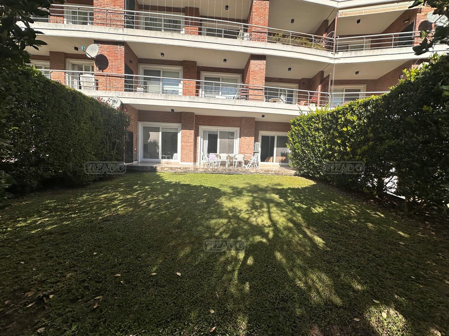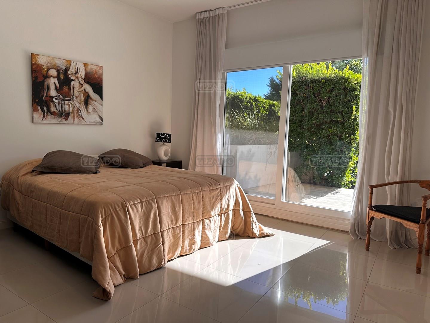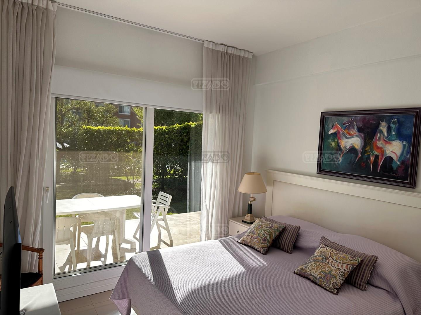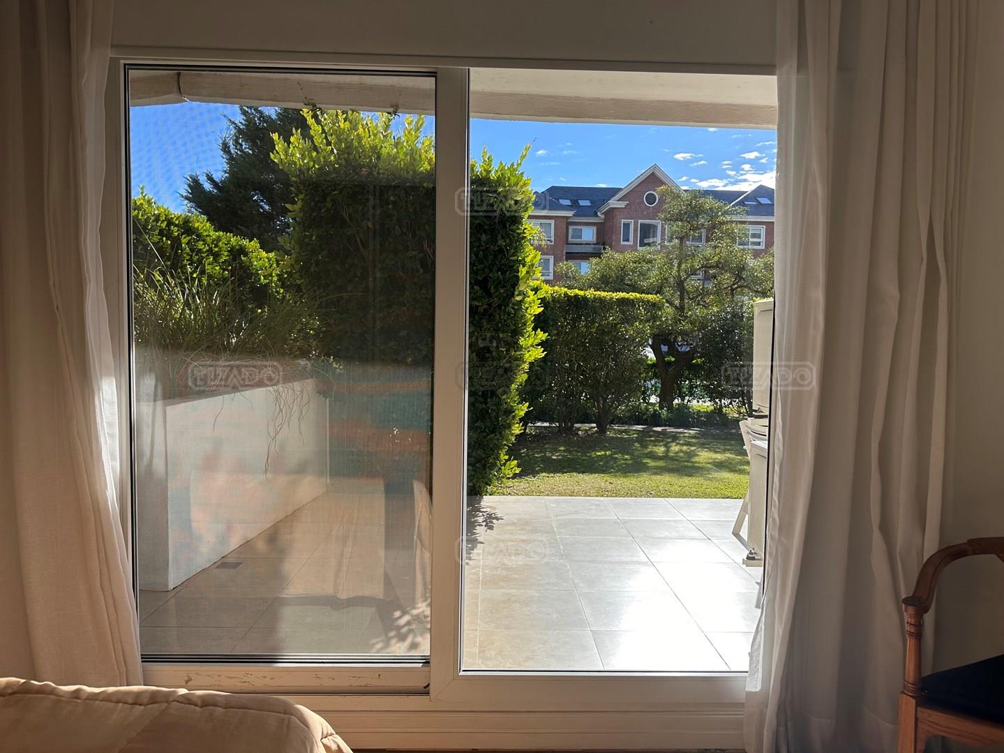 Miradores de la Bahía. Departamento con jardín propio. 3 amb más dependencia ( con baño completo). Ambientes: Living comedor +cocina independiente + Dos dormitorios en suite + dependencia + Toillete + galería con parrilla+ Jardín propio + Cochera subterránea Hermoso tres ambientes con jardín propio, orientación Norte Oeste sobre el jardín, tiene mucha luz natural. Su acceso al sector de amenities es peatonal, con salida directa desde el jardín. Miradores de la bahia es un complejo ya escriturado. Terminaciones: Tiene calefacción por losa radiante, 3 equipos de aire frio/calor. Cortinas screen en living y black out en dormitorios. Las aberturas son DVH de PVC Se destaca por sus excelentes amenities: restaurante, Gimnasio, tres piletas (una climatizada), Salón de usos múltiples, salón de juegos. Guardia privada con seguridad 24 h.