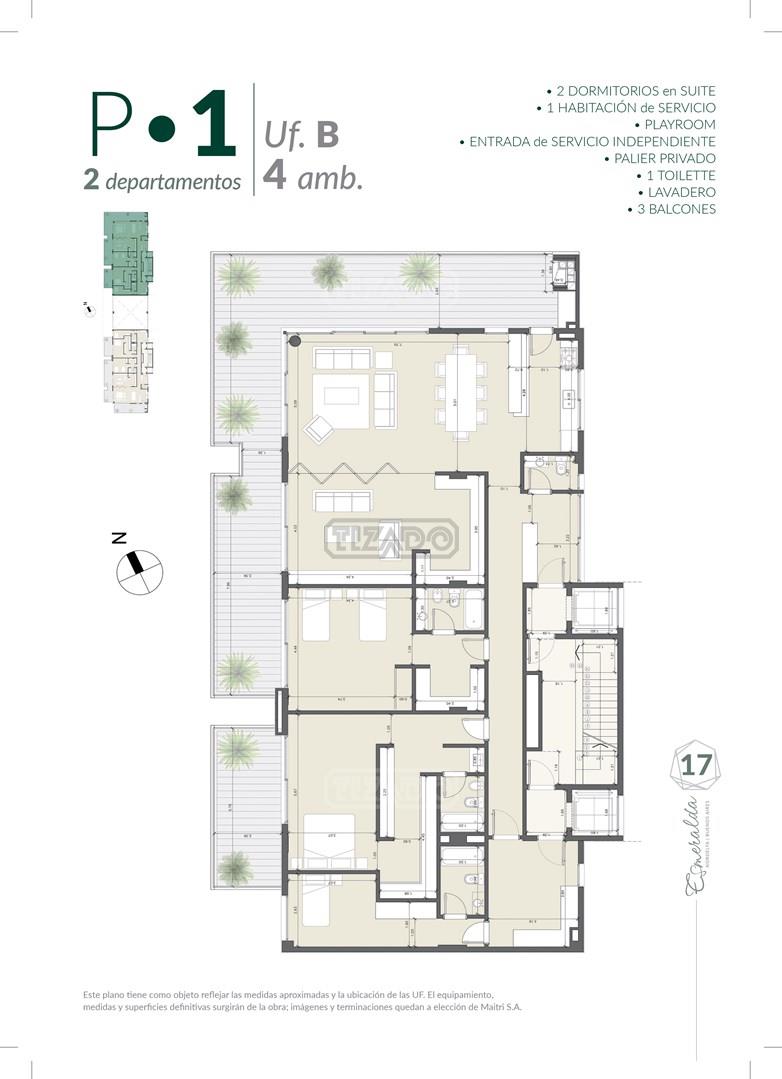 Torre Esmeralda llega a Nordelta con una nueva propuesta e intención en la zona, tratando de redescubrir nuevas formas de vinculación entre el habitar y el entorno que la caracteriza. Vivir la experiencia de un ambiente amplio dentro de un espacio semiurbano, adquiriendo una situación transformadora. Líneas rectas que se insertan en el marco de un lineamiento, en contraposición al canal enfrentado, manifestando una forma racional - orgánica que determinan el sitio. El Proyecto se localiza dentro de la Bahía, sobre el Paseo Ribereño, accediendo de modo privado por el Barrio Puerto Escondido. Se plantea sobre un predio de 3005 m2, con una orientación Noroeste. La construcción plantea unidades de 3, 4 y 5 (semipisos) ambientes de gran amplitud, unidades con terraza, balcones aterrazados. Se plantea sobre un predio de 3005m2, orientado al Noroeste. La Construcción propone unidades de 3, 4 y 5 ambientes ambientes, las cuales poseen accesos independientes, balcones aterrazados, y algunas están conformadas en Semipisos, con su entrada de servicio correspondiente. En la Planta Baja se encuentran todos los Amenities del Proyecto. Acceso y salida directo por dos calles diferentes. Cocheras propias con baulera o sin bauleras. Sectores destinados a servicio y mantenimiento. Estructura Hormigón armado según normas Cirsoc. Losas, vigas, columnas, bases, pilotes, de dimensiones de acuerdo a cálculo estructural y estudio de suelo. Mampostería Exterior: Muros de ladrillo hueco de e=18cm. Interior: Tabiques de ladrillo hueco de e=12cm. Cubiertas Accesible: Techo de losa plana de hormigón armado, con aislación hidráulica y solado flotante de baldosones de cemento para azotea transitable. Contrapisos En Planta Baja sobre losa de subsuelo, de hormigón liviano, apto para circulación peatonal y vehicular dónde corresponda. Sobre losas superiores, de hormigón liviano de aproximadamente 8 cm de espesor. Carpetas Para asiento de solados de Porcellanatos, de mortero a la cal reforzado. Cielorrasos Interiores: Aplicados y/o suspendidos, terminados con enlucido de yeso. Balcones: Terminados con enlucido de yeso. Revoques Exteriores Azotado hidrófugo, revoque grueso fratasado con aplicación de revestimiento plástico color a definir. Revoques Interiores Primera capa y Enlucido de yeso en interiores de departamentos, palieres y cajas de escaleras. Carpintería Exterior: Ventanas y puertas ventanas de PVC, con DVH (Doble vidrio hermético).