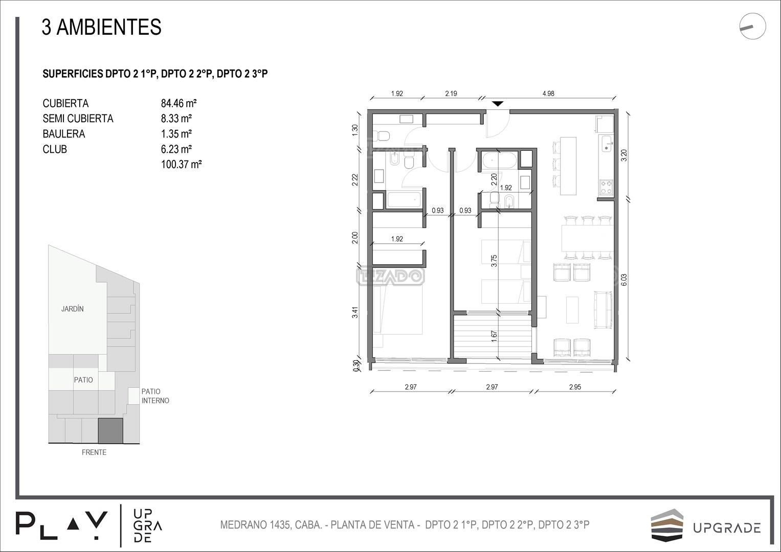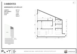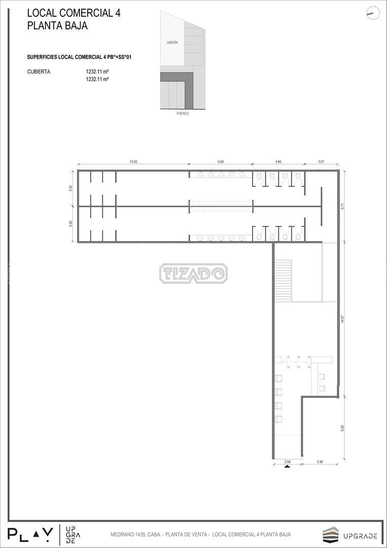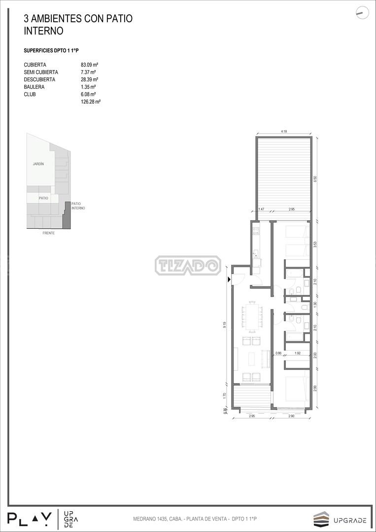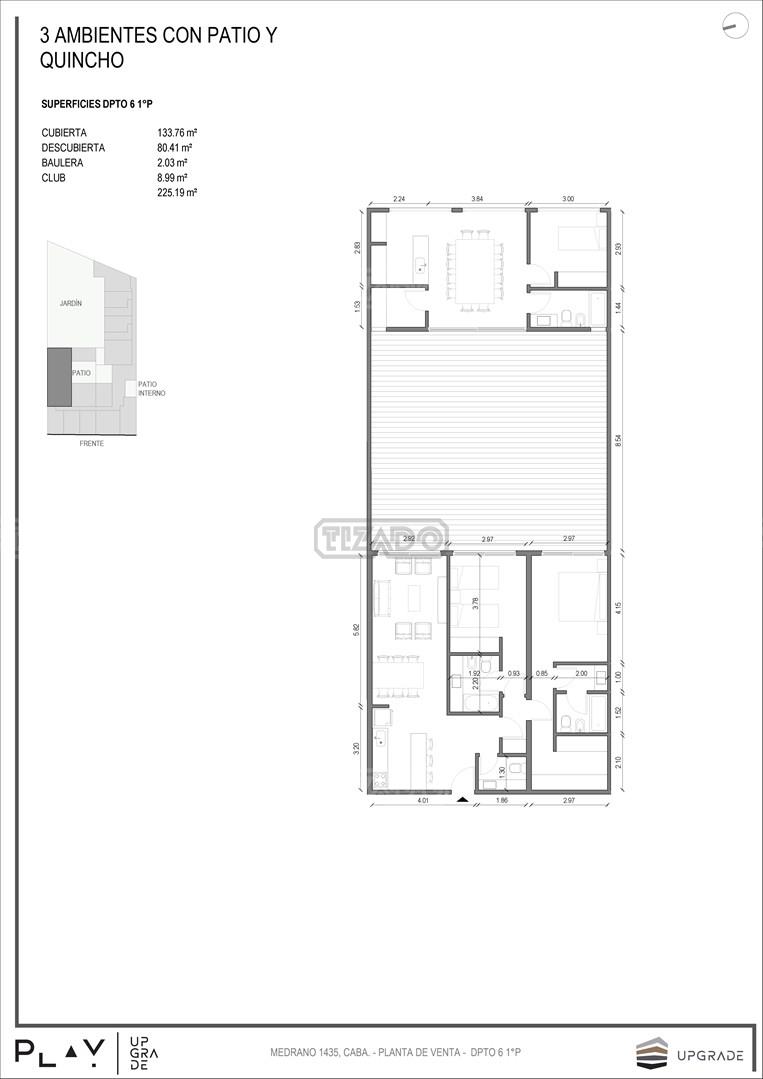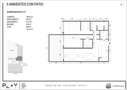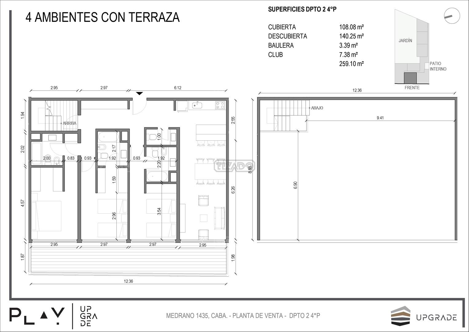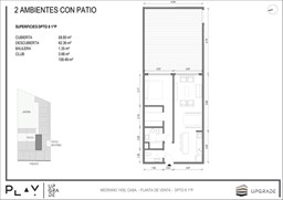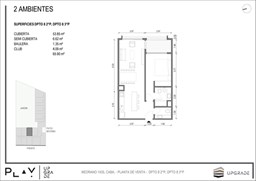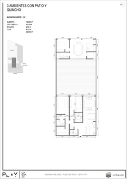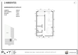 UPGRADE PLAY. Nuevo emprendimiento del Grupo Upgrade. Emplazado estratégicamente frente a la plaza Unidad Latinoamericana, sobre la calle Medrano 1435 entre El Salvador y Costa Rica. El Edificio contará con 4 pisos, 59 unidades de 1 a 4 ambientes, desde 43 m2 hasta 300 m2. Unidades con quincho y terraza propio, cocheras en 2 SS. Bauleras. Zócalo comercial con gastronomía, Piscina semiolímpica descubierta, cancha de pádel, Gimnasio profesional totalmente equipado, spot de entrenamiento outdoor, jardín central con amplios espacios verdes con diseño paisajístico, SUM y parrillas. Conexión para lavarropas en todas las unidades. Forma de pago: anticipo y saldo en pesos mas cac o dólares. Matrícula Cucicba : 1053