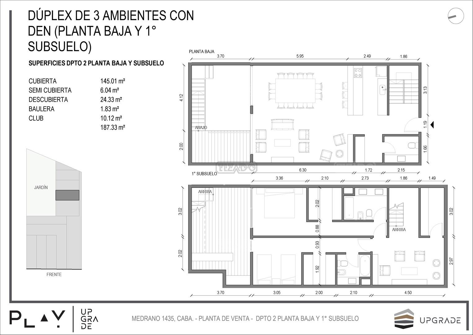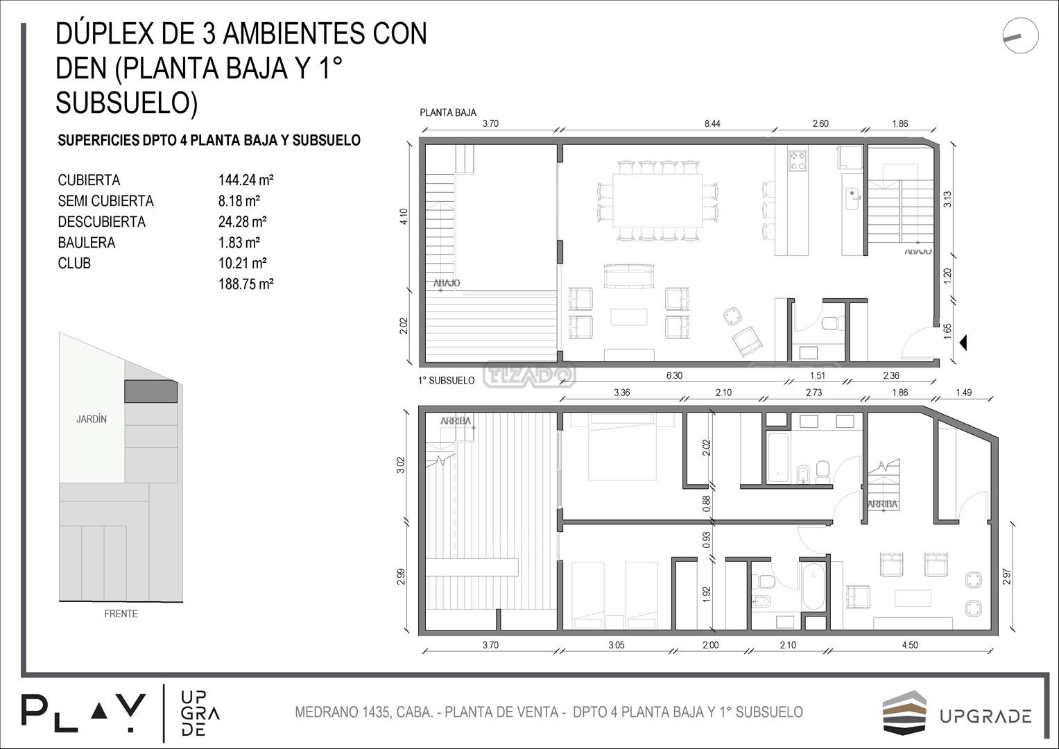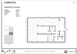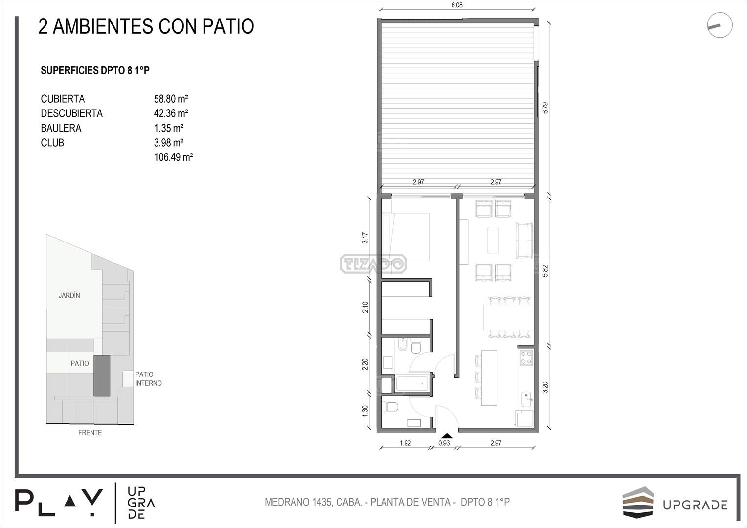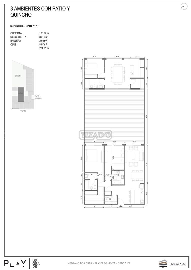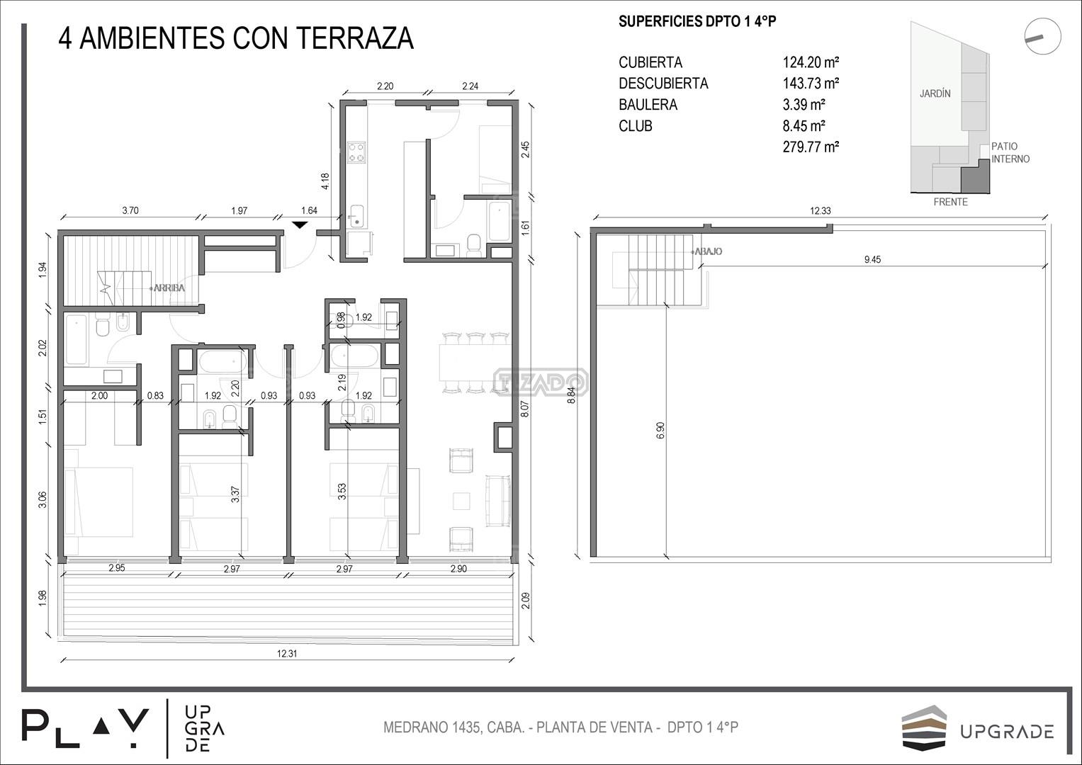 UPGRADE PLAY. Nuevo emprendimiento del Grupo Upgrade. Emplazado estratégicamente frente a la plaza Unidad Latinoamericana, sobre la calle Medrano 1435 entre El Salvador y Costa Rica. El Edificio contará con 4 pisos, 59 unidades de 1 a 4 ambientes, desde 43 m2 hasta 300 m2. Unidades con quincho y terraza propio, cocheras en 2 SS. Bauleras. Zócalo comercial con gastronomía, Piscina semiolímpica descubierta, cancha de pádel, Gimnasio profesional totalmente equipado, spot de entrenamiento outdoor, jardín central con amplios espacios verdes con diseño paisajístico, SUM y parrillas. Conexión para lavarropas en todas las unidades. Forma de pago: anticipo y saldo en pesos mas cac o dólares. Matrícula Cucicba : 1053