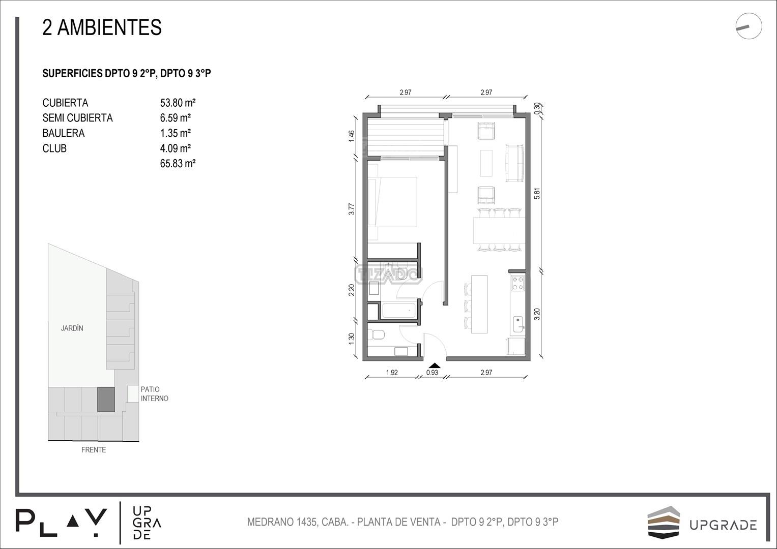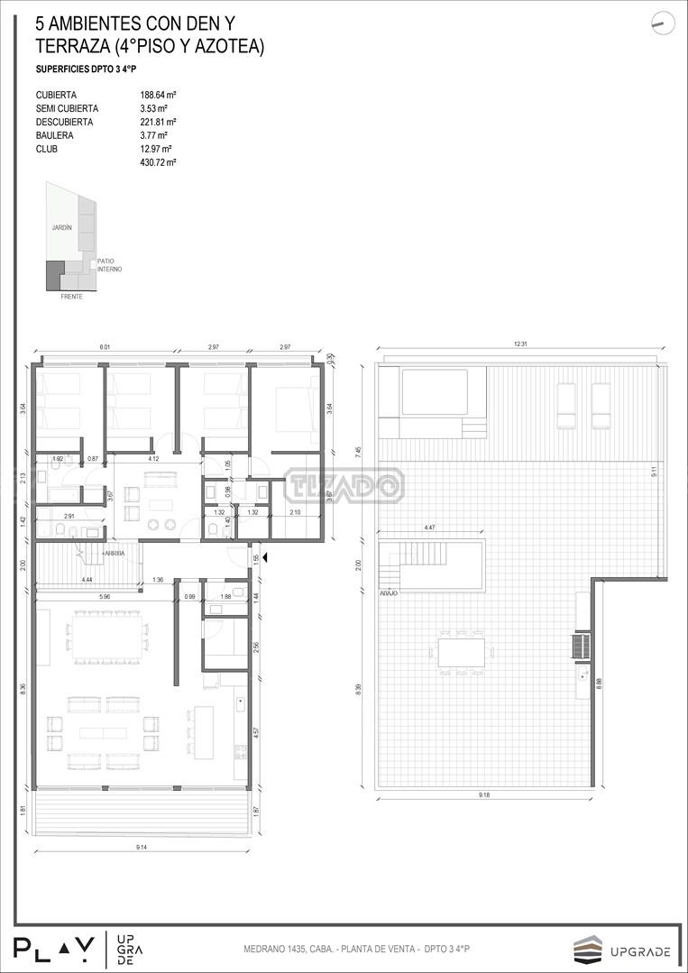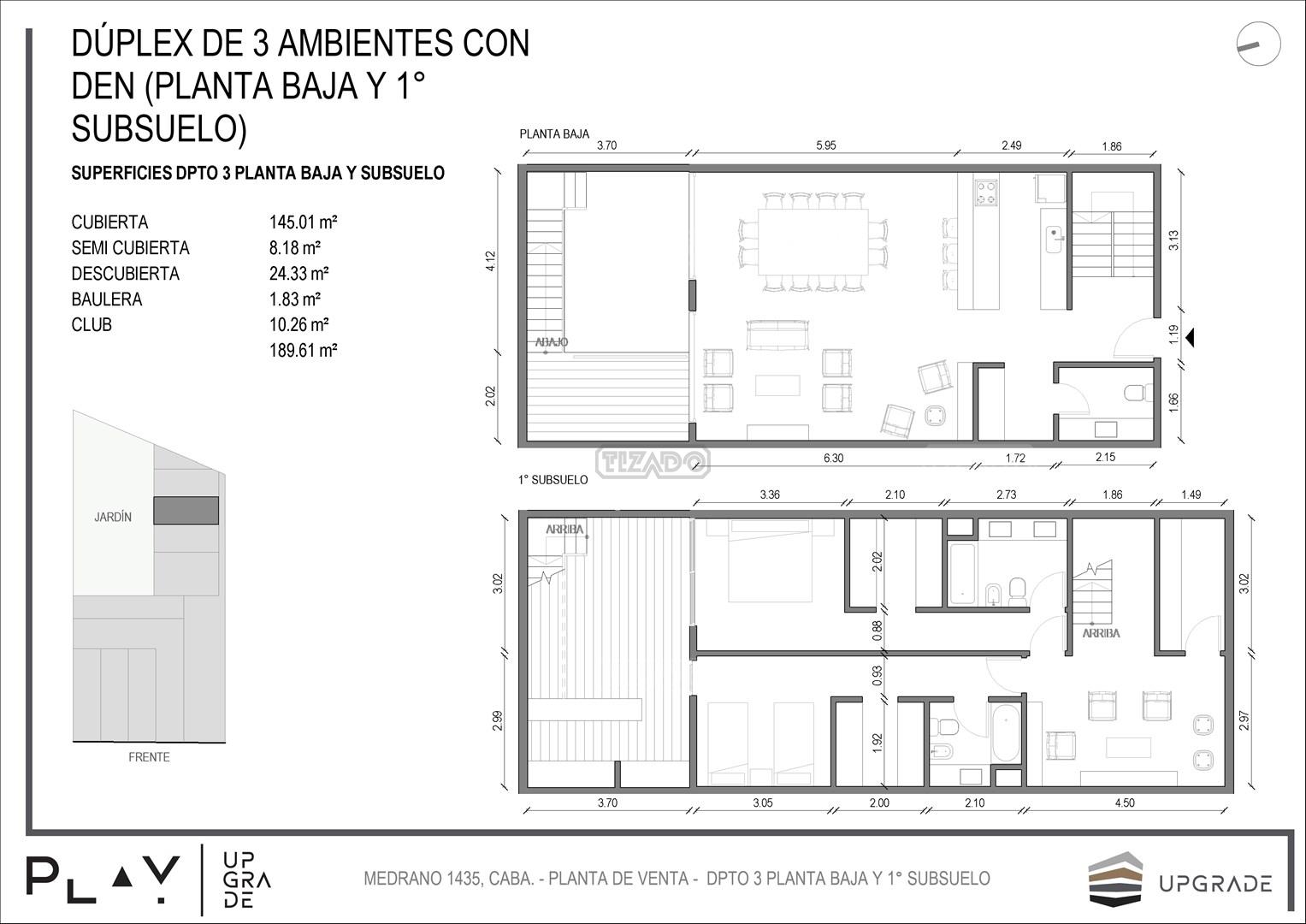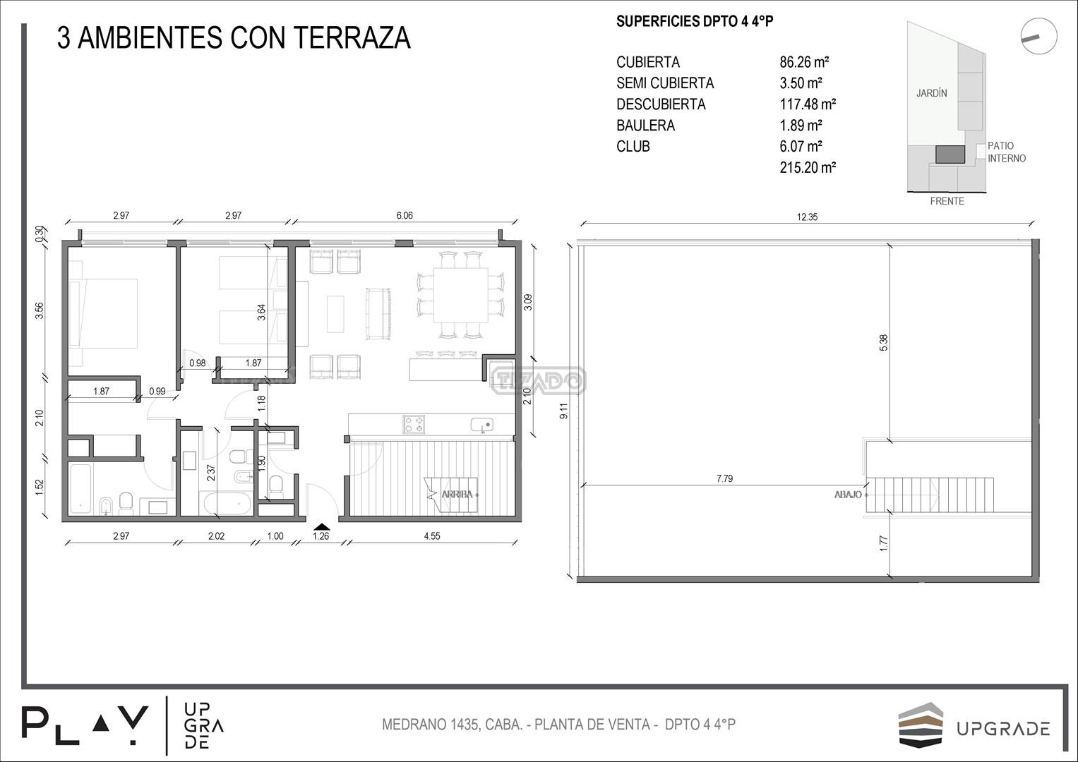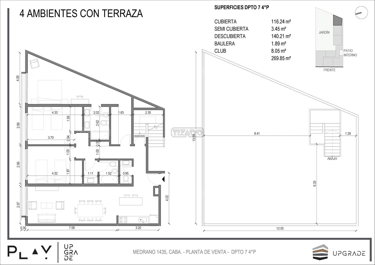 UPGRADE PLAY. Nuevo emprendimiento del Grupo Upgrade. Emplazado estratégicamente frente a la plaza Unidad Latinoamericana, sobre la calle Medrano 1435 entre El Salvador y Costa Rica. El Edificio contará con 4 pisos, 59 unidades de 1 a 4 ambientes, desde 43 m2 hasta 300 m2. Unidades con quincho y terraza propio, cocheras en 2 SS. Bauleras. Zócalo comercial con gastronomía, Piscina semiolímpica descubierta, cancha de pádel, Gimnasio profesional totalmente equipado, spot de entrenamiento outdoor, jardín central con amplios espacios verdes con diseño paisajístico, SUM y parrillas. Conexión para lavarropas en todas las unidades. Forma de pago: anticipo y saldo en pesos mas cac o dólares. Matrícula Cucicba : 1053