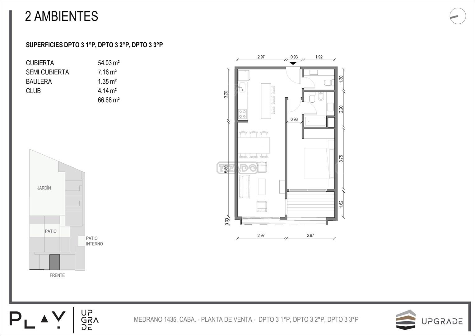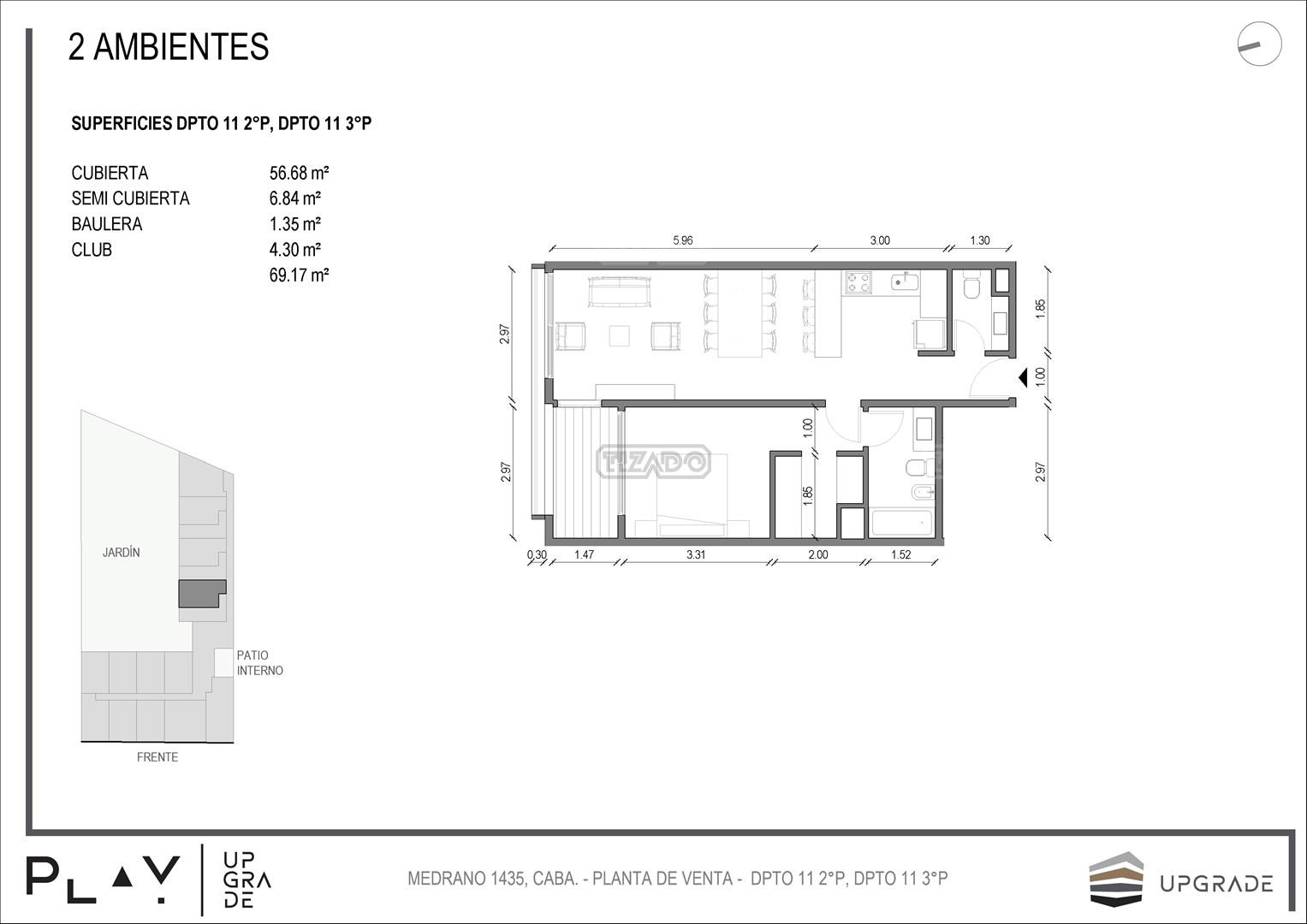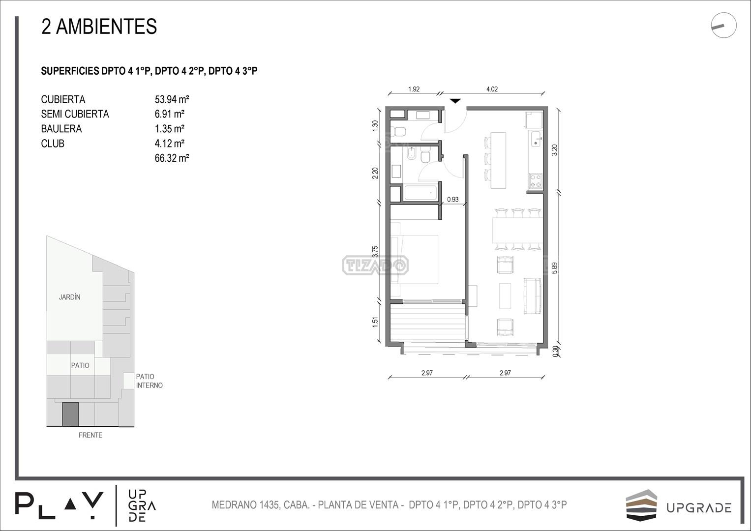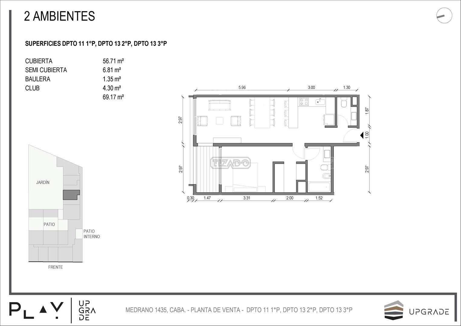 UPGRADE PLAY. Nuevo emprendimiento del Grupo Upgrade. Emplazado estratégicamente frente a la plaza Unidad Latinoamericana, sobre la calle Medrano 1435 entre El Salvador y Costa Rica. El Edificio contará con 4 pisos, 59 unidades de 1 a 4 ambientes, desde 43 m2 hasta 300 m2. Unidades con quincho y terraza propio, cocheras en 2 SS. Bauleras. Zócalo comercial con gastronomía, Piscina semiolímpica descubierta, cancha de pádel, Gimnasio profesional totalmente equipado, spot de entrenamiento outdoor, jardín central con amplios espacios verdes con diseño paisajístico, SUM y parrillas. Conexión para lavarropas en todas las unidades. Forma de pago: anticipo y saldo en pesos mas cac o dólares. Matrícula Cucicba : 1053