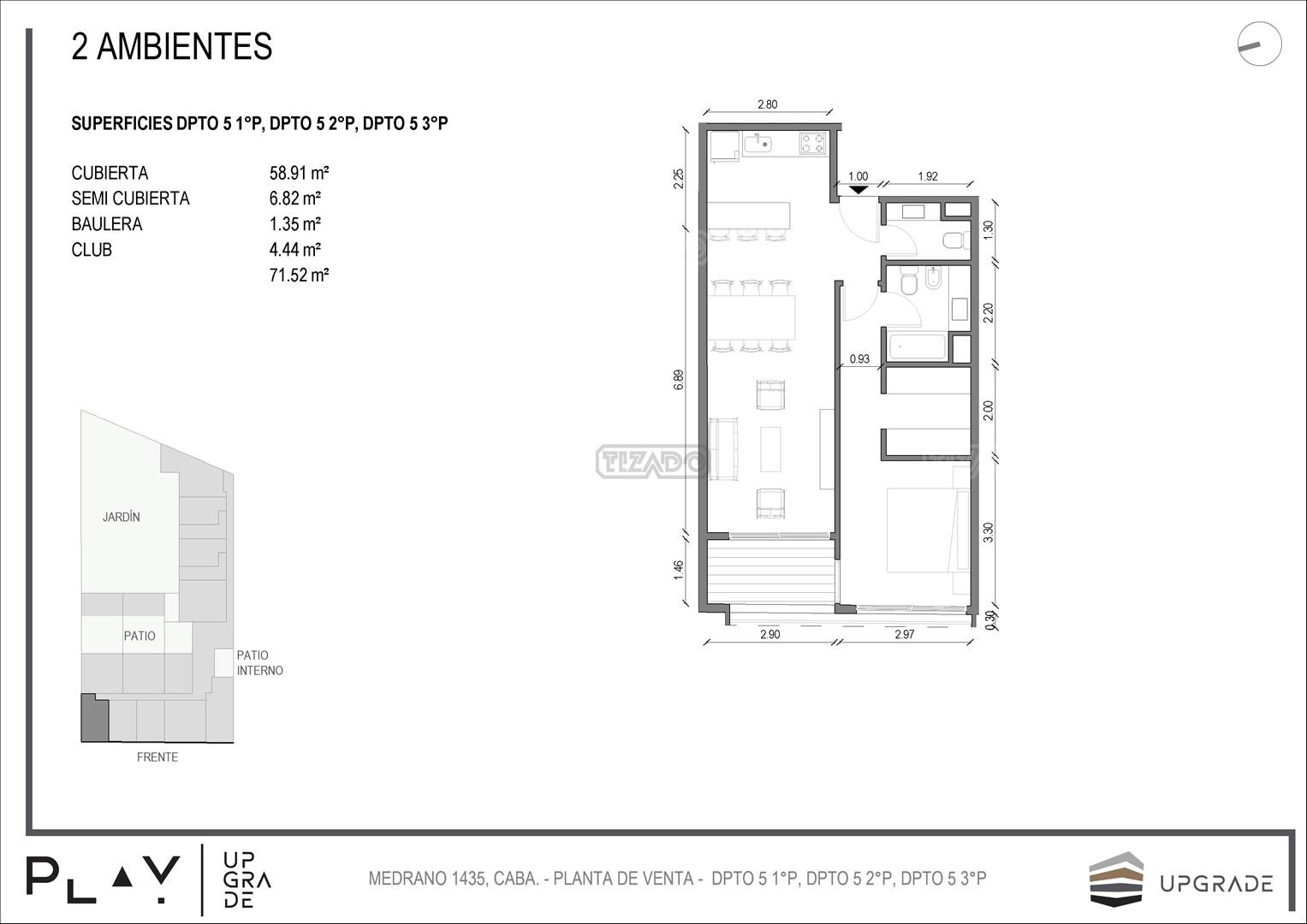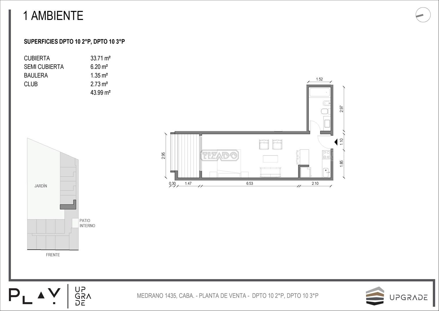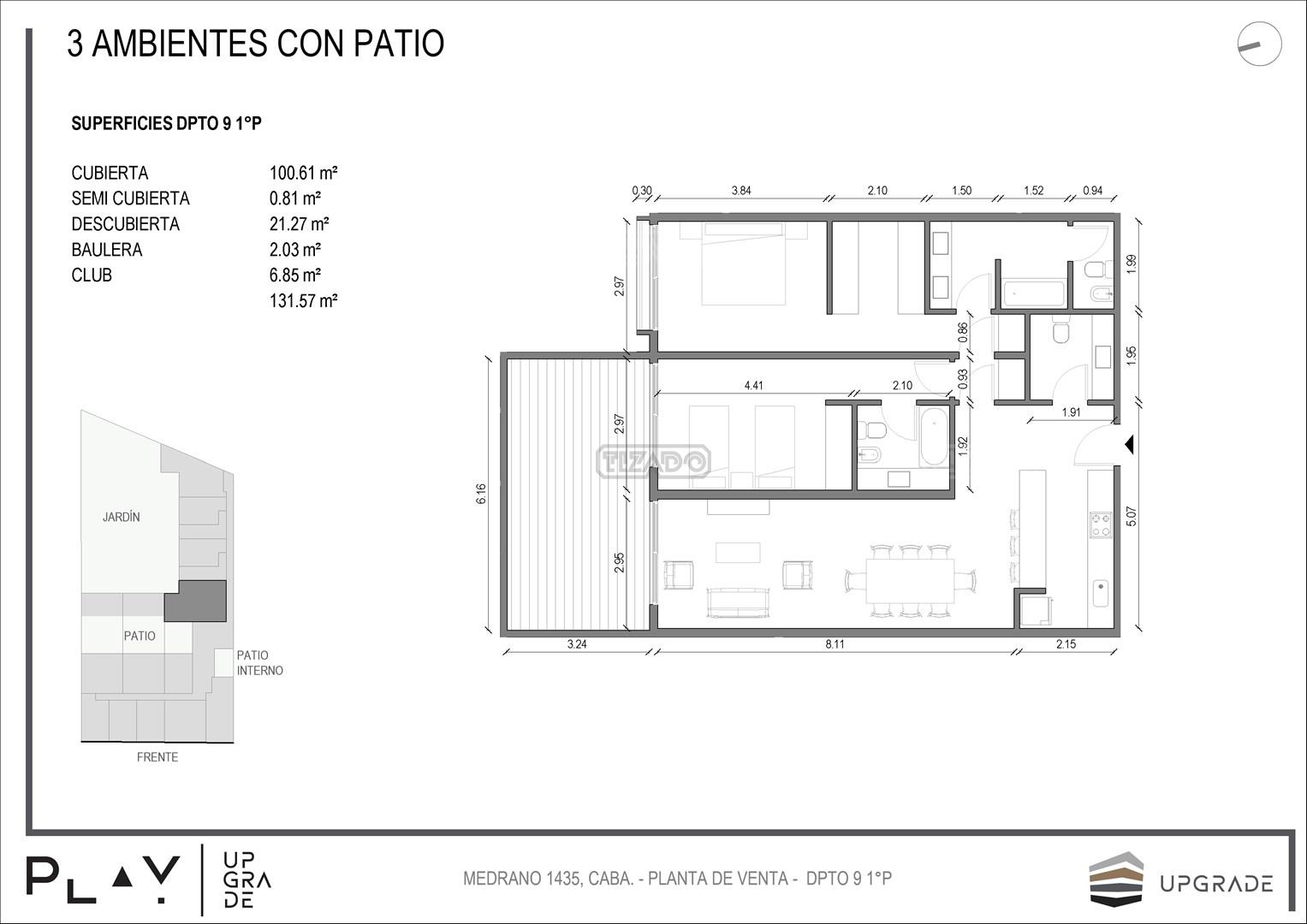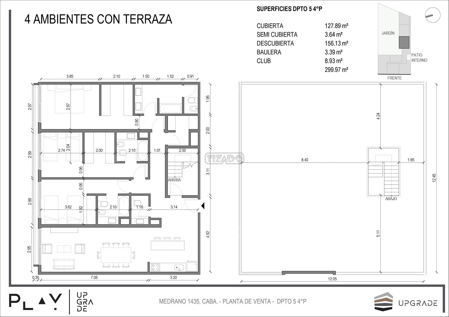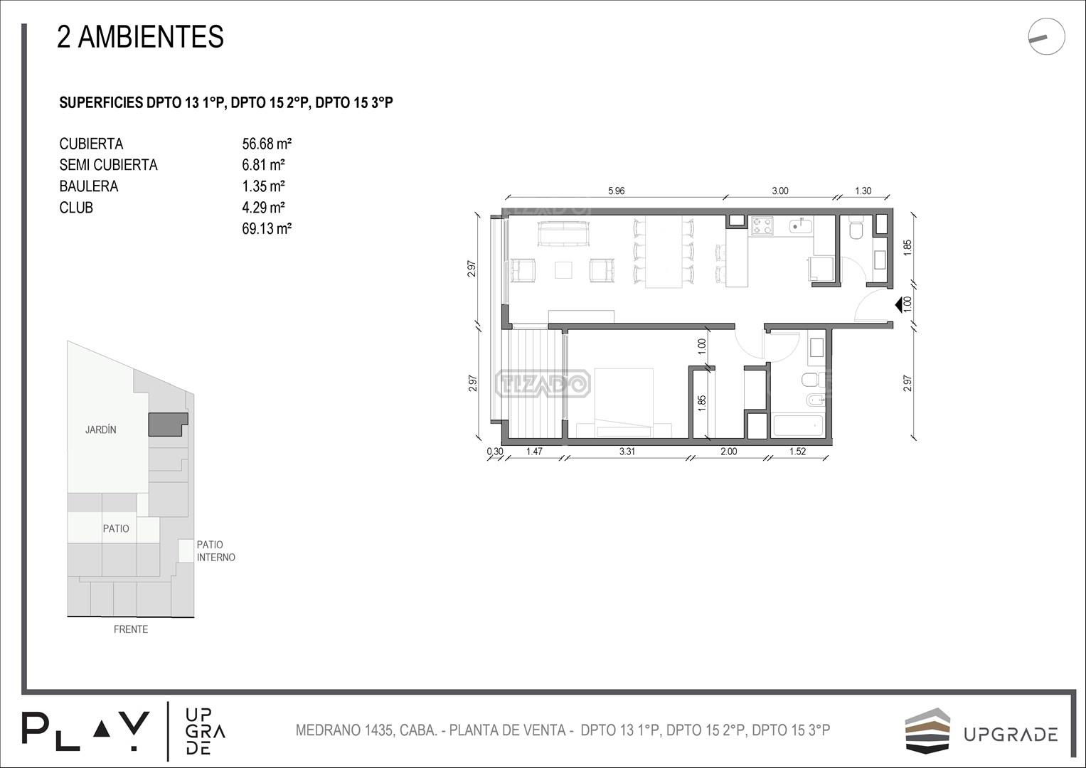 UPGRADE PLAY. Nuevo emprendimiento del Grupo Upgrade. Emplazado estratégicamente frente a la plaza Unidad Latinoamericana, sobre la calle Medrano 1435 entre El Salvador y Costa Rica. El Edificio contará con 4 pisos, 59 unidades de 1 a 4 ambientes, desde 43 m2 hasta 300 m2. Unidades con quincho y terraza propio, cocheras en 2 SS. Bauleras. Zócalo comercial con gastronomía, Piscina semiolímpica descubierta, cancha de pádel, Gimnasio profesional totalmente equipado, spot de entrenamiento outdoor, jardín central con amplios espacios verdes con diseño paisajístico, SUM y parrillas. Conexión para lavarropas en todas las unidades. Forma de pago: anticipo y saldo en pesos mas cac o dólares. Matrícula Cucicba : 1053